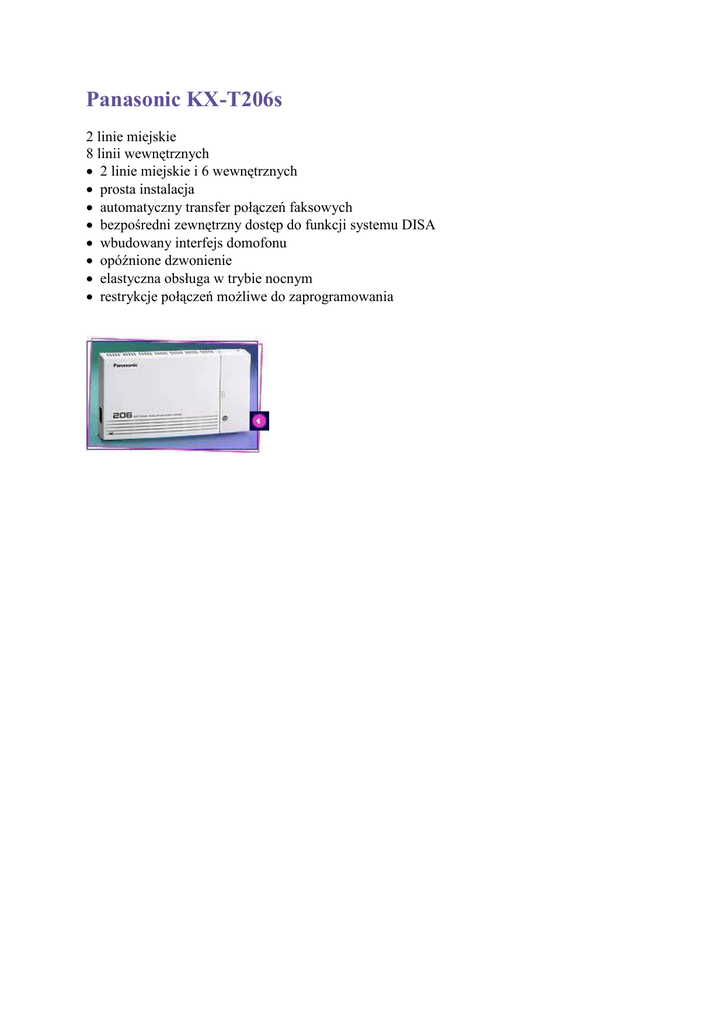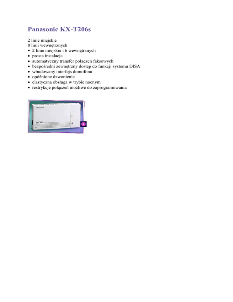 Panasonic KX-T206s 2 linie miejskie 8 linii wewnętrznych • 2 linie miejskie i 6 wewnętrznych • prosta instalacja • automatyczny transfer połączeń faksowych • bezpośredni zewnętrzny dostęp do funkcji systemu DISA • wbudowany interfejs domofonu • opóźnione dzwonienie • elastyczna obsługa w trybie nocnym • restrykcje połączeń możliwe do zaprogramowania