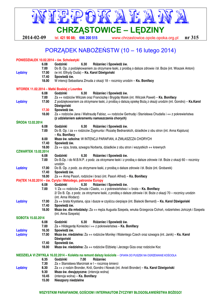 NIEPOKALANA CHRZĄSTOWICE – LĘDZINY 2014-02-09 tel. 421 90 88; 696 200 515 www.chrzastowice.opole.opoka.org.pl nr 315 PORZĄDEK NABOŻEŃSTW (10 – 16 lutego 2014) PONIEDZIAŁEK 10.02.2014 – św. Scholastyki 6.08 Godzinki 6.30 RóŜaniec i Spowiedź św. 7.00 Do B. Op. z podziękowaniem za otrzymane łaski, z prośbą o dalsze zdrowie i bł. BoŜe (int. Woszek Antoni) Lędziny 17.00 (w int. Elfrydy Duda) – Ks. Karol Dźwigoński 17.40 Spowiedź św. 18.00 W intencji Sebastiana Zmuda z okazji 18 – rocznicy urodzin – Ks. Bonifacy WTOREK 11.02.2014 – Matki Boskiej z Lourdes 6.08 Godzinki 6.30 RóŜaniec i Spowiedź św. 7.00 Za ++ rodziców Wilczek oraz Franciszkę i Brygidę Malek (int. Wilczek Paweł) – Ks. Bonifacy Lędziny 17.00 Z podziękowaniem za otrzymane łaski, z prośbą o dalszą opiekę BoŜą z okazji urodzin (int. Gondro) – Ks.Karol Dźwigoński 17.30 Spowiedź św. 18.00 Za + rodziców Jana i Waltraudę Fabisz, ++ rodziców Gertrudę i Stanisława Chudalla i ++ z pokrewieństwa (z udzielaniem sakramentu namaszczenia chorych) ŚRODA 12.02.2014 6.08 Godzinki 6.30 RóŜaniec i Spowiedź św. 7.00 Do B. Op. i za ++ rodziców Zygmunta i Rozalię Bednarskich, dziadków z obu stron (int. Anna Kajstura) – Ks. Bonifacy 8.00 Msza św. szkolna: W INTENCJI PARAFIAN, A ZWŁASZCZA CHORYCH 17.40 Spowiedź św. 18.00 Za ++ ojca, brata, szwagra Norberta, dziadków z obu stron i wszystkich ++ krewnych CZWARTEK 13.02.2014 6.08 Godzinki 6.30 RóŜaniec i Spowiedź św. 7.00 Do B.Op. i do M.B.N.P. z podz. za otrzymane łaski i z prośbą o dalsze zdrowie i bł. BoŜe z okazji 60 – rocznicy urodzin Lędziny 17.00 Do B. Op. z podz. za otrzymane łaski, z prośbą o dalsze zdrowie i bł. BoŜe (int. Grobarek) 17.40 Spowiedź św. 18.00 Za ++ Annę Pasoń, rodziców i braci (int. Pasoń Alfred) – Ks. Bonifacy PIĄTEK 14.02.2014 – św. Cyryla i Metodego, patronów Europy 6.08 Godzinki 6.30 RóŜaniec i Spowiedź św. 7.00 1/ Za ++ rodziców Zmuda i Ciasto, ++ z pokrewieństwa i + brata – Ks. Bonifacy 2/ Do B. Op. z podz. za otrzymane łaski, z prośbą o dalsze zdrowie i bł. BoŜe z okazji 70 – rocznicy urodzin (int. Anna Wodarz) Lędziny 17.00 Za ++ brata Krystiana, ojca i dusze w czyśćcu cierpiące (int. Bialecki Bernard) – Ks. Karol Dźwigoński 17.40 Spowiedź św. 18.00 Msza św. dla młodzieŜy: Za ++ męŜa Augusta Szepela, wnuka Grzegorza Cichoń, rodzeństwo Jończyk i Szepela (int. Anna Szepela) SOBOTA 15.02.2014 6.08 Godzinki 6.30 RóŜaniec i Spowiedź św. 7.00 Za + Hildegardę Koniecko i ++ z pokrewieństwa – Ks. Bonifacy Lędziny 16.30 Spowiedź św. Lędziny 17.00 Msza św. niedzielna: Za ++ rodziców Monikę i Walentego Czech oraz szwagra (int. Janik) – Ks. Karol Dźwigoński 17.40 Spowiedź św. 18.00 Msza św. niedzielna: Za ++ rodziców ElŜbietę i Jerzego Giza oraz rodziców Koc NIEDZIELA VI ZWYKŁA 16.02.2014 – Kolekta na remont dalszy kościoła – OFIARA DO PUSZEK NA OGRZEWANIE KOŚCIOŁA 6.35 Godzinki 7.00 RóŜaniec 7.30 Za + Stanisława Marciniak w I – rocznicę śmierci Lędziny 8.30 Za ++ z rodzin Bronder, Król, Gondro i Nowak (int. Anieli Bronder) – Ks. Karol Dźwigoński 9.30 Msza św. dwujęzyczna: (intencja wolna) 10.45 (intencja wolna) – Ks. Bonifacy 15.00 Nieszpory niedzielne WSZYSTKIM PARAFIANOM, GOŚCIOM I INTERNAUTOM śYCZYMY BŁOGOSŁAWIEŃSTWA BOśEGO! PORZĄDEK NABOŻEŃSTW (17 – 23 lutego 2014) PONIEDZIAŁEK 17.02.2014 6.08 Godzinki 6.30 RóŜaniec i Spowiedź św. 7.00 Za ++ Walentego Grzesik, Ŝonę, rodzeństwo, + Marię i pokrewieństwo z obu stron (int. Grzesik Hubert) Lędziny 17.00 Do B. Op. i M.B.N.P. o zdrowie i bł. BoŜe w rodzinie Kariny i Tomasza Niesłony z okazji urodzin – Ks. Karol Dźwigoński WTOREK 18.02.2014 6.08 7.00 Lędziny 17.00 Godzinki 6.30 RóŜaniec i Spowiedź św. Za ++ rodziców i ++ z rodziny ks. proboszcza Za++ rodziców Anastazję i Józefa Buhl, ojca Pawła, brata Franciszka i ++ z pokrewieństwa (int. Buhl) – Ks. Karol Dźwigoński ŚRODA 19.02.2014 6.08 7.00 8.00 Godzinki 6.30 RóŜaniec i Spowiedź św. (intencja wolna) Msza św. szkolna: (intencja wolna) – Ks. Bonifacy CZWARTEK 20.02.2014 6.08 7.00 Lędziny 17.00 17.40 18.00 Godzinki 6.30 RóŜaniec i Spowiedź św. Za + Antoniego Szweda w 30 – dzień po śmierci – Ks. Bonifacy Za ++ rodziców Gertrudę i Wincentego Hylla, braci Józefa i Helmuta (int. Henryk Hylla) – Ks. KarolDźwigoński Spowiedź św. Za ++ męŜa Jerzego, rodziców, teściów i pokrewieństwo (int. Sowa Alicja) PIĄTEK 21.02.2014 6.08 7.00 Godzinki 6.30 RóŜaniec i Spowiedź św. Do B.Op. i do M.B.N.P. z podz. za otrzymane łaski i z prośbą o dalsze zdrowie i bł. BoŜe z okazji urodzin (w pewnej intencji) SOBOTA 22.02.2014 – ŚWIĘTO KATEDRY ŚW. PIOTRA 6.08 Godzinki 6.30 RóŜaniec i Spowiedź św. 7.00 Do B.Op. z podz. za otrzymane łaski i z prośbą o dalszą opiekę i zdrowie oraz za ++ rodziców Zmuda – Woszek i Franciszkę Micheń (int. Woszek Ginter) Lędziny 16.30 Spowiedź św. Lędziny 17.00 Msza św. niedzielna: Za ++ rodziców Rajtor i Kiełbasa – Ks. Karol Dźwigoński 17.40 Spowiedź św. 18.00 Msza św. niedzielna: Do M.B.N.P. z podz. za łaski, z prośbą o dalszą opiekę i bł. BoŜe oraz za ++ z rodziny Barbary Jaksy – Ks. Bonifacy NIEDZIELA VII ZWYKŁA 23.02.2014 6.35 Godzinki 7.00 RóŜaniec 7.30 Do B.Op. i do M.B.N.P. z podz. za otrzymane łaski i z prośbą o dalsze oraz za ++ matkę Erykę Cebula i ojca Ewalda Kuczka (int. Cebula Janusz) Lędziny 8.30 Do B. Op. i M.B.N.P. z podz. za otrzymane łaski, z prośbą o dalsze (int. Hildegardy Sowiecki) – Ks. Karol Dźwigoński 9.30 Msza św. dwujęzyczna: (intencja wolna) – Ks. Bonifacy 10.45 Za ++ męŜa Józefa Klisz, córkę Teresę, rodziców, brata Ericha i bratowe 15.00 Nieszpory niedzielne SPRZĄTANIE KOŚCIOŁA: 15.02.2014: Micheń Sabina i Robert, Stec Alicja i Stanisław, Malek Iwona i Rajmund, Mientus Dorota i Burhard 22.02.2014: Wyrwoł Mari