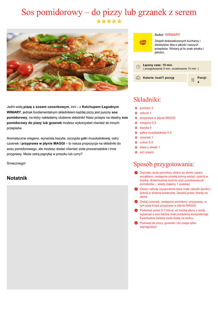 Sos pomidorowy – do pizzy lub grzanek z serem Autor: WINIARY Zespół doświadczonych kucharzy i dietetyków dba o jakość naszych przepisów. Winiary.pl to znak smaku i jakości. Łączny czas: 15 min. ( przygotowanie 5 min. oczekiwanie 10 min. ) Kalorie: kcal/1 porcję Porcji: 4 Składniki: Jedni wolą pizzę z sosem czosnkowym, inni – z Ketchupem Łagodnym pomidor 2 WINIARY, jednak fundamentalnym składnikiem każdej pizzy jest pyszny sos cebula 1 pomidorowy, na który nakładamy ulubione składniki! Nasz przepis na idealny sos przyprawa w płynie MAGGI pomidorowy do pizzy lub grzanek możesz wykorzystać również do innych oregano 0,5 przepisów. bazylia 5 gałka muszkatołowa 0,5 Aromatyczne oregano, wyrazista bazylia, szczypta gałki muszkatołowej, ostry czosnek i przyprawa w płynie MAGGI – to nasza propozycja na składniki do czosnek 1 sosu pomidorowego, ale możesz dodać również zioła prowansalskie i inne przyprawy. Może ostrą paprykę w proszku lub curry? oliwa z oliwek 1 Smacznego! Notatnik cukier 0,5 sól i pieprz Sposób przygotowania: Dojrzałe, duże pomidory obierz ze skórki (sparz wrzątkiem, następnie przelej zimną wodą) i pokrój w kostkę. (Ewentualnie można użyć puszkowanych pomidorów – wtedy dajemy 1 puszkę). Obierz cebulę (opcjonalnie dwie małe cebulki dymki) i pokrój w drobną kosteczkę. Zeszklij przez chwilę na oliwie. Dodaj czosnek, następnie pomidory i przyprawy, w tym parę kropli przyprawy w płynie MAGGI. Podsmaż przez 57 minut, aż trochę płynu z wody wyparuje a sos będzie miał pożądaną konsystencję. Ewentualne świeże zioła dodaj na końcu. Podawaj do pizzy, grzanek i do czego tylko zapragniesz!