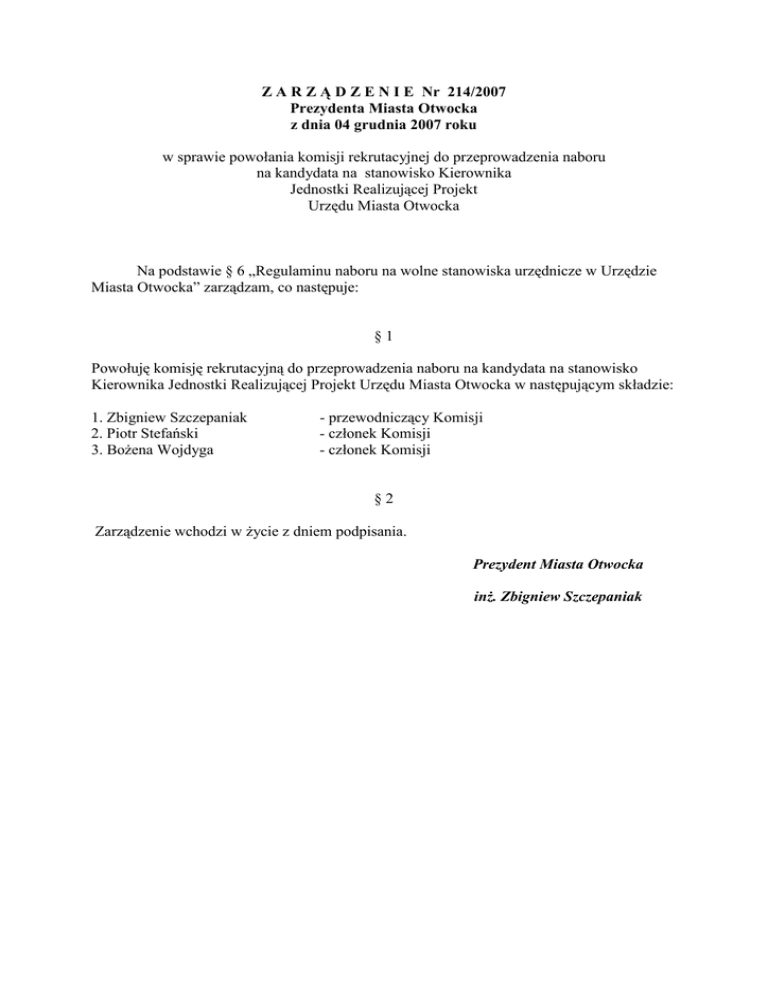 Z A R Z Ą D Z E N I E Nr 214/2007 Prezydenta Miasta Otwocka z dnia 04 grudnia 2007 roku w sprawie powołania komisji rekrutacyjnej do przeprowadzenia naboru na kandydata na stanowisko Kierownika Jednostki Realizującej Projekt Urzędu Miasta Otwocka Na podstawie § 6 „Regulaminu naboru na wolne stanowiska urzędnicze w Urzędzie Miasta Otwocka” zarządzam, co następuje: §1 Powołuję komisję rekrutacyjną do przeprowadzenia naboru na kandydata na stanowisko Kierownika Jednostki Realizującej Projekt Urzędu Miasta Otwocka w następującym składzie: 1. Zbigniew Szczepaniak 2. Piotr Stefański 3. BoŜena Wojdyga - przewodniczący Komisji - członek Komisji - członek Komisji §2 Zarządzenie wchodzi w Ŝycie z dniem podpisania. Prezydent Miasta Otwocka inŜ. Zbigniew Szczepaniak