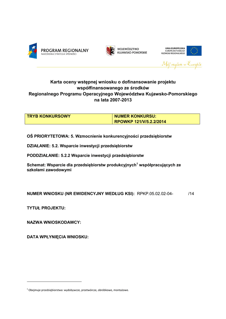 Karta oceny wstępnej wniosku o dofinansowanie projektu współfinansowanego ze środków Regionalnego Programu Operacyjnego Województwa Kujawsko-Pomorskiego na lata 2007-2013 TRYB KONKURSOWY NUMER KONKURSU: RPOWKP 121/V/5.2.2/2014 OŚ PRIORYTETOWA: 5. Wzmocnienie konkurencyjności przedsiębiorstw DZIAŁANIE: 5.2. Wsparcie inwestycji przedsiębiorstw PODDZIAŁANIE: 5.2.2 Wsparcie inwestycji przedsiębiorstw Schemat: Wsparcie dla przedsiębiorstw produkcyjnych1 współpracujących ze szkołami zawodowymi NUMER WNIOSKU (NR EWIDENCYJNY WEDŁUG KSI): RPKP.05.02.02-04- TYTUŁ PROJEKTU: NAZWA WNIOSKODAWCY: DATA WPŁYNIĘCIA WNIOSKU: 1 Obejmuje przedsiębiorstwa: wydobywcze, przetwórcze, obróbkowe, montażowe. /14 W. KRYTERIA OCENY WSTĘPNEJ (ocena dokonywana jest na podstawie informacji zawartych w formularzu informacji niezbędnych do dokonania oceny wstępnej projektu)1 Nr Kryterium / Opis kryterium Oceniający 1 TAK A.6 NIE Oceniający 2 ND TAK NIE ND Formalna dopuszczalność projektu. Zgodność dokumentacji projektowej z dokumentacją konkursową. Czy wniosek o dofinansowanie projektu/formularz informacji niezbędnych do dokonania oceny wstępnej projektu został złożony we właściwym terminie określonym 2 w dokumentacji konkursowej? Czy Wnioskodawca złożył opatrzony podpisem i prawidłowo wypełniony formularz informacji niezbędnych do dokonania oceny wstępnej projektu? (jeśli dotyczy) Nr B.2.1 B.2.2 Kryterium / Opis kryterium Sposób określenia liczby punktów za opcje w ramach kryterium Minimalna liczba punktów Punkty Oceniający 1 Punkty Oceniający 2 B.2.1/ Lokalizacja projektu /Projekt realizowany w powiecie o stopie bezrobocia2: Mniejszej lub równej 10,11% (m. Toruń, m. Bydgoszcz); 0 – nie 2 - tak >10,11%<=17,50% (Powiaty: Świecki, Brodnicki, Bydgoski); 0 – nie 4 – tak >17,50%<=20,70% (Powiaty: Toruński, Rypiński, m. Grudziądz, m. Włocławek);) 0 – nie 6 - tak >22,70%<=22,95% (Powiaty: Aleksandrowski, Nakielski, Sępoleński, Wąbrzeski, Mogileński, Żniński, Tucholski); 0 – nie 8 - tak >22,95% (Powiaty: Lipnowski, Włocławski, Grudziądzki, Radziejowski, Chełmiński, Golubsko-Dobrzyński, Inowrocławski). 0 – nie 10 - tak 2 B.2.2. Aktualna kompleksowość powiązania przedsiębiorcy ze szkołą zawodową z województwa kujawsko-pomorskiego3 Praktyczna nauka zawodu u pracodawcy (organizacja zajęć w rzeczywistych warunkach pracy) 0 – nie 1 - tak 1 2 Dane WUP na koniec 09.2013 r. Stopa bezrobocia dla województwa kujawsko-pomorskiego wynosi 17,5%. Weryfikacja na podstawie umowy pomiędzy przedsiębiorcą a szkołą zawodową (lub organem prowadzącym szkołę) w rozumieniu ustawy z dnia 7 września 1991 r. o systemie oświaty (Dz. U. z 2004 r. Nr 256, poz. 2572 z późn. zm.) zawartej przed dniem ogłoszenia konkursu i obowiązującej na moment ogłoszenia konkursu. Jeśli umowa nie jest aktualna na dzień ogłoszenia konkursu, ale obowiązywała w ciągu ostatnich 3 lat działalności przedsiębiorstwa, należy przyznać 50% odpowiadającej liczbie punktów. 3 2 B.2.3 Staże dla nauczycieli i uczniów (organizacja nauki w miejscu pracy) 0 – nie 1 - tak Specjalistyczne kursy/szkolenia dla uczniów kończące się dokumentem honorowanym przez pracodawców 0 – nie 0,5 - tak Specjalistyczne szkolenia i kursy dla nauczycieli przedmiotów zawodowych 0 – nie 0,5 - tak Organizacja krajowych wizyt studyjnych 0 – nie 0,5 - tak Organizacja zagranicznych wizyt studyjnych 0 – nie 0,5 - tak Dotowanie i doposażenie klasy patronackiej 0 – nie 2 - tak Fundowanie stypendiów dla najzdolniejszych uczniów klasy patronackiej 0 – nie 1 - tak Gwarantowanie pracy najzdolniejszym absolwentom klasy patronackiej 0 – nie 1 - tak Stanowiska egzaminacyjne u przedsiębiorcy (pracodawcy) 0 – nie 2 - tak B.2.3 Planowana kompleksowość powiązania przedsiębiorcy ze szkołą zawodową z województwa kujawsko-pomorskiego4 Praktyczna nauka zawodu u pracodawcy (organizacja zajęć w rzeczywistych warunkach pracy) 0 – nie 1 - tak Staże dla nauczycieli i uczniów (organizacja nauki w miejscu pracy) 0 – nie 1 - tak Specjalistyczne kursy/szkolenia dla uczniów kończące się dokumentem honorowanym przez pracodawców 0 – nie 0,5 - tak Specjalistyczne szkolenia i kursy dla nauczycieli przedmiotów zawodowych 0 – nie 0,5 - tak Organizacja krajowych wizyt studyjnych 0 – nie 0,5 - tak Organizacja zagranicznych wizyt studyjnych 0 – nie 0,5 - tak Dotowanie i doposażenie klasy patronackiej 0 – nie 2 - tak Fundowanie stypendiów dla najzdolniejszych uczniów klasy patronackiej 0 – nie 1 - tak 5 4 Weryfikowana na podstawie umowy przedsiębiorcy ze szkoła zawodową (lub uprawnionym organem) podpisanej w okresie od ogłoszenia konkursu do dnia złożenia wniosku o dofinansowanie projektu (umowę należy dołączyć do wniosku o dofinansowanie projektu – na jej podstawie przyznane zostaną punkty w ramach przedmiotowego kryterium), obowiązująca co najmniej przez okres trwałości projektu (możliwość uzależnienia jej obowiązywania od otrzymania dofinansowania). 3 Gwarantowanie pracy najzdolniejszym absolwentom klasy patronackiej 0 – nie 1 - tak Stanowiska egzaminacyjne u przedsiębiorcy (pracodawcy) 0 – nie 2 - tak ŁĄCZNA LICZBA PUNKTÓW WYNIK OCENY WSTĘPNEJ OCENIAJĄCY 1: TAK/ND OCENIAJĄCY 2: OCENA POZYTYWNA OCENA POZYTYWNA WNIOSEK ODRZUCONY WNIOSEK ODRZUCONY WNIOSEK SKIEROWANY DO UZUPEŁNIENIA WNIOSEK SKIEROWANY DO UZUPEŁNIENIA TAK/ND UWAGI: OCENIAJĄCY 1: Miejsce, Data Toruń, OCENIAJĄCY 2: Imię i nazwisko oraz podpis Miejsce, Data Toruń, Imię i nazwisko oraz podpis SPRAWDZENIE I AKCEPTACJA DOKONANEJ OCENY POTWIERDZAM POPRAWNOŚĆ DOKONANIA OCENY PRZEZ OSOBY SPRAWDZAJĄCE I AKCEPTUJĘ JEJ WYNIKI JAKO OSTATECZNE STANOWISKO INSTYTUCJI ZARZĄDZAJĄCEJ WSKAZUJĘ: WYNIK OCENY WSTĘPNEJ: TAK/ND UWAGI: • OCENA POZYTYWNA • WNIOSEK ODRZUCONY • WNIOSEK SKIEROWANY DO UZUPEŁNIENIA SPRAWDZENIE I AKCEPTACJA KOORDYNATOR ZESPOŁU Toruń,