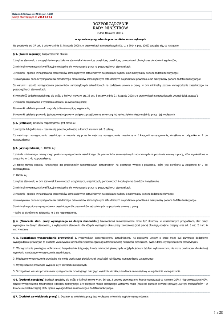 Dziennik Ustaw rok 2014 poz. 1786 wersja obowiązująca od 2014-12-11 ROZPORZĄDZENIE RADY MINISTRÓW z dnia 18 marca 2009 r. w sprawie wynagradzania pracowników samorządowych Na podstawie art. 37 ust. 1 ustawy z dnia 21 listopada 2008 r. o pracownikach samorządowych (Dz. U. z 2014 r. poz. 1202) zarządza się, co następuje: § 1. [Zakres regulacji] Rozporządzenie określa: 1) wykaz stanowisk, z uwzględnieniem podziału na stanowiska kierownicze urzędnicze, urzędnicze, pomocnicze i obsługi oraz doradców i asystentów; 2) minimalne wymagania kwalifikacyjne niezbędne do wykonywania pracy na poszczególnych stanowiskach; 3) warunki i sposób wynagradzania pracowników samorządowych zatrudnionych na podstawie wyboru oraz maksymalny poziom dodatku funkcyjnego; 4) maksymalny poziom wynagrodzenia zasadniczego pracowników samorządowych zatrudnionych na podstawie powołania oraz maksymalny poziom dodatku funkcyjnego; 5) warunki i sposób wynagradzania pracowników samorządowych zatrudnionych na podstawie umowy o pracę, w tym minimalny poziom wynagrodzenia zasadniczego na poszczególnych stanowiskach; 6) wysokość dodatku specjalnego dla osób, o których mowa w art. 36 ust. 3 ustawy z dnia 21 listopada 2008 r. o pracownikach samorządowych, zwanej dalej „ustawą”; 7) warunki przyznawania i wypłacania dodatku za wieloletnią pracę; 8) warunki ustalania prawa do nagrody jubileuszowej i jej wypłacania; 9) warunki ustalania prawa do jednorazowej odprawy w związku z przejściem na emeryturę lub rentę z tytułu niezdolności do pracy i jej wypłacania. § 2. [Definicje] Ilekroć w rozporządzeniu jest mowa o: 1) urzędzie lub jednostce – rozumie się przez to jednostki, o których mowa w art. 2 ustawy; 2) najniższym wynagrodzeniu zasadniczym – rozumie się przez to najniższe wynagrodzenie zasadnicze w I kategorii zaszeregowania, określone w załączniku nr 1 do rozporządzenia. § 3. [Wynagrodzenia] 1. Ustala się: 1) tabele minimalnego miesięcznego poziomu wynagrodzenia zasadniczego dla pracowników samorządowych zatrudnionych na podstawie umowy o pracę, które są określone w załączniku nr 1 do rozporządzenia; 2) tabelę stawek dodatku funkcyjnego dla pracowników samorządowych zatrudnionych na podstawie wyboru i powołania, która jest określona w załączniku nr 2 do rozporządzenia. 2. Ustala się: 1) wykaz stanowisk, w tym stanowisk kierowniczych urzędniczych, urzędniczych, pomocniczych i obsługi oraz doradców i asystentów, 2) minimalne wymagania kwalifikacyjne niezbędne do wykonywania pracy na poszczególnych stanowiskach, 3) warunki i sposób wynagradzania pracowników samorządowych zatrudnionych na podstawie wyboru i maksymalny poziom dodatku funkcyjnego, 4) maksymalny poziom wynagrodzenia zasadniczego pracowników samorządowych zatrudnionych na podstawie powołania i maksymalny poziom dodatku funkcyjnego, 5) minimalne poziomy wynagrodzenia zasadniczego dla pracowników zatrudnionych na podstawie umowy o pracę – które są określone w załączniku nr 3 do rozporządzenia. § 4. [Skrócenie stażu pracy wymaganego na danym stanowisku] Pracownikowi samorządowemu może być skrócony, w uzasadnionych przypadkach, staż pracy wymagany na danym stanowisku, z wyłączeniem stanowisk, dla których wymagany okres pracy zawodowej (staż pracy) określają odrębne przepisy oraz art. 5 ust. 2 i art. 6 ust. 4 ustawy. § 5. [Dodatkowe wynagrodzenie prowizyjne] 1. Pracownikowi samorządowemu zatrudnionemu na podstawie umowy o pracę może być przyznane dodatkowe wynagrodzenie prowizyjne za osobiste wykonywanie czynności z zakresu egzekucji administracyjnej należności pieniężnych, zwane dalej „wynagrodzeniem prowizyjnym”. 2. Wynagrodzenie prowizyjne, obliczane od bezpośrednio ściągniętej kwoty należności pieniężnych, objętych jednym tytułem wykonawczym, nie może przekraczać dwukrotnej wysokości najniższego wynagrodzenia zasadniczego. 3. Miesięczne wynagrodzenie prowizyjne nie może przekraczać pięciokrotnej wysokości najniższego wynagrodzenia zasadniczego. 4. Wynagrodzenie prowizyjne wypłaca się w okresach miesięcznych. 5. Szczegółowe warunki przyznawania wynagrodzenia prowizyjnego oraz jego wysokość określa pracodawca samorządowy w regulaminie wynagradzania. § 6. [Dodatek specjalny] Dodatek specjalny dla osób, o których mowa w art. 36 ust. 3 ustawy, przysługuje w kwocie wynoszącej co najmniej 20% i nieprzekraczającej 40% łącznie wynagrodzenia zasadniczego i dodatku funkcyjnego, a w urzędach miasta stołecznego Warszawy, miast (miast na prawach powiatu) powyżej 300 tys. mieszkańców – w kwocie nieprzekraczającej 50% łącznie wynagrodzenia zasadniczego i dodatku funkcyjnego. § 7. [Dodatek za wieloletnią pracę] 1. Dodatek za wieloletnią pracę jest wypłacany w terminie wypłaty wynagrodzenia: 1 z 28 1) począwszy od pierwszego dnia miesiąca kalendarzowego następującego po miesiącu, w którym pracownik nabył prawo do dodatku lub wyższej stawki dodatku, jeżeli nabycie prawa nastąpiło w ciągu miesiąca; 2) za dany miesiąc, jeżeli nabycie prawa do dodatku lub wyższej stawki dodatku nastąpiło pierwszego dnia miesiąca. 2. Dodatek za wieloletnią pracę przysługuje pracownikowi samorządowemu za dni, za które otrzymuje wynagrodzenie, oraz za dni nieobecności w pracy z powodu niezdolności do pracy wskutek choroby albo konieczności osobistego sprawowania opieki nad dzieckiem lub chorym członkiem rodziny, za które pracownik otrzymuje z tego tytułu zasiłek z ubezpieczenia społecznego. 3. Jeżeli praca w urzędzie lub jednostce stanowi dodatkowe zatrudnienie, do okresu dodatkowego zatrudnienia nie podlegają zaliczeniu okresy zatrudnienia podstawowego. 4. Pracownikowi samorządowemu, który wykonuje pracę w urzędzie lub jednostce w ramach urlopu bezpłatnego udzielonego przez pracodawcę w celu wykonywania tej pracy, do okresu dodatkowego zatrudnienia podlegają zaliczeniu zakończ