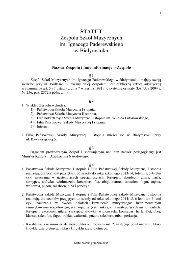 1 STATUT Zespołu Szkół Muzycznych im. Ignacego Paderewskiego w Białymstoku Nazwa Zespołu i inne informacje o Zespole §1 Zespół Szkół Muzycznych im. Ignacego Paderewskiego w Białymstoku, mający swoją siedzibę przy ul. Podleśnej 2, zwany dalej Zespołem, jest publiczną szkołą artystyczną w rozumieniu art. 5 i 7 ustawy z dnia 7 września 1991 r. o systemie oświaty (Dz. U. z 2004 r. Nr 256, poz. 2572 z późn. zm.). §2 1. W skład Zespołu wchodzą: 1) Państwowa Szkoła Muzyczna I stopnia, 2) Państwowa Szkoła Muzyczna II stopnia, 3) Ogólnokształcąca Szkoła Muzyczna II stopnia im. Witolda Lutosławskiego, 4) Filia Państwowej Szkoły Muzycznej I stopnia, 5) Internat. 2. Filia Państwowej Szkoły Muzycznej I stopnia mieści się w Białymstoku przy ul. Kawaleryjskiej 5. §3 Organem prowadzącym Zespół i sprawującym nad nim nadzór pedagogiczny jest Minister Kultury i Dziedzictwa Narodowego. §4 1. Państwowa Szkoła Muzyczna I stopnia i Filia Państwowej Szkoły Muzycznej I stopnia realizują, dla uczniów przyjętych do szkoły do roku szkolnego 2013/14, 6-letni lub 4-letni cykl nauczania w następujących specjalnościach: fortepian, akordeon, gitara, harfa, skrzypce, altówka, wiolonczela, kontrabas, flet, obój, klarnet, saksofon, fagot, trąbka, waltornia, puzon, sakshorn, tuba i perkusja. 2. Państwowa Szkoła Muzyczna I stopnia i Filia Państwowej Szkoły Muzycznej I stopnia realizują, dla uczniów przyjętych do szkoły od roku szkolnego 2014/15, 6-letni lub 4-letni cykl nauczania w dwóch działach kształcenia muzycznego: instrumentalnym i muzykowania zespołowego, realizując zajęcia nauki gry na następujących instrumentach: fortepian, akordeon, gitara, skrzypce, altówka, wiolonczela, kontrabas, harfa, flet, obój, klarnet, saksofon, fagot, trąbka, waltornia, puzon, sakshorn, tuba i perkusja. 3. Kwalifikacja uczniów do działów, o których mowa w ust. 2, następuje po ukończeniu klasy II cyklu czteroletniego i klasy III cyklu sześcioletniego. Statut wersja grudzień 2015 2 §5 1. Państwowa Szkoła Muzyczna II stopnia i Ogólnokształcąca Szkoła Muzyczna II stopnia, dla uczniów przyjętych do szkoły do roku szkolnego 2013/14, realizują 6-letni cykl nauczania w zawodzie muzyk na Wydziale Instrumentalnym w specjalności instrumentalista w zakresie gry na: fortepianie, klawesynie, organach, akordeonie, skrzypcach, altówce, wiolonczeli, kontrabasie, gitarze, harfie, flecie, oboju, klarnecie, saksofonie, fagocie, rogu, trąbce, puzonie, sakshornie, tubie i perkusji, oraz na Wydziale Rytmiki w specjalności rytmika. 2. Państwowa Szkoła Muzyczna II stopnia, dla uczniów przyjętych do szkoły do roku szkolnego 2013/14, realizuje 4-letni cykl nauczania w zawodzie muzyk na Wydziale Wokalnym w specjalności wokalista. 3. Państwowa Szkoła Muzyczna II stopnia i Ogólnokształcąca Szkoła Muzyczna II stopnia, dla uczniów przyjętych do szkoły od roku szkolnego 2014/15, realizują 6-letni cykl nauczania w zawodzie muzyk w specjalności instrumentalistyka w specjalizacjach: fortepian, klawesyn, organy, akordeon, skrzypce, altówka, wiolonczela, kontrabas, gitara, harfa, flet, obój, klarnet, saksofon, fagot, waltornia, trąbka, puzon, sakshorn, tuba i perkusja, oraz w specjalności rytmika. 4. Państwowa Szkoła Muzyczna II stopnia, dla uczniów przyjętych do szkoły od roku szkolnego 2014/15, realizuje 4-letni cykl nauczania w zawodzie muzyk w specjalności wokalistyka. §6 1. Szkoły realizują zajęcia dydaktyczne określone w ramowych planach nauczania publicznych szkół artystycznych. 2. Szkoły mogą wprowadzać inne przedmioty niż wymienione w ramowych planach nauczania. Decyzję o wprowadzeniu tych przedmiotów do szkolnego planu nauczania podejmuje dyrektor szkoły po uzyskaniu opinii Rady Rodziców i Rady Pedagogicznej. 3. Szkoły mogą prowadzić działalność innowacyjną i eksperymentalną. 3a. PSM II st. i OSM II st. uczestniczą w eksperymencie pedagogicznym pod nazwą „Pilotaż zmian programowych”, zwany „pilotażem”, który jest prowadzony od roku szkolnego 2013/2014. Zasady pilotażu są zawarte w załączniku nr 5 do Statutu. 4. Zasady kwalifikacji uczniów Państwowej Szkoły Muzycznej i Filii Państwowej Szkoły Muzycznej I stopnia do działów, zespołów oraz na zajęcia indywidualne wynikające z nowych planów nauczania określone są w załączniku nr 6 do Statutu. Cele i zadania szkół §7 1. Kształcenie w PSM I st. i w Filii PSM I st. ma na celu: 1) rozbudzanie i rozwijanie zdolności muzycznych uczniów, 2) przygotowanie kandydatów do szkół muzycznych II stopnia. Statut wersja grudzień 2015 3 2. W Filii PSM I stopnia realizowane są ponadto praktyki pedagogiczne w szczególności studentów UMFC Wydziału Instrumentalno-Pedagogicznego w Białymstoku. 3. Kształcenie w PSM II st. i OSM II st. ma na celu: 1) rozwijanie zdolności i umiejętności muzycznych uczniów w stopniu pozwalającym na czynną działalność zawodową, 2) przygotowanie uczniów do podjęcia studiów muzycznych, 3) przygotowanie uczniów do aktywnej działalności na rzecz kultury muzycznej. 4. Ponadto wszystkie szkoły Zespołu: 1) przygotowują wrażliwych i świadomych odbiorców muzyki, 4) aktywnie oddziałują na otoczenie w sferze kultury, 5) kształtują w uczniach nawyki samodzielnej i systematycznej pracy, 6) wyrabiają w uczniach pożądane cechy osobowościowe, takie jak: uczciwość, solidarność, odpowiedzialność, sprawiedliwość, wytrwałość, odporność na niepowodzenia i stresy. 5. Wszystkie szkoły Zespołu przy realizacji swych zadań współpracują z rodzicami (prawnymi opiekunami) uczniów. §8 1. Szkoły Zespołu realizują cele, o których mowa w § 7 poprzez: 1) prowadzenie zajęć praktycznych i teoretycznych w zakresie przedmiotów objętych szkolnym planem nauczania, 2) organizowanie dorocznych koncertów prezentujących dorobek poszczególnych szkół oraz przeglądów poszczególnych klas (spe