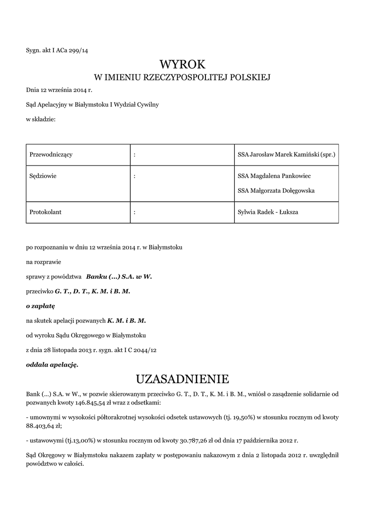 Sygn. akt I ACa 299/14 WYROK W IMIENIU RZECZYPOSPOLITEJ POLSKIEJ Dnia 12 września 2014 r. Sąd Apelacyjny w Białymstoku I Wydział Cywilny w składzie: Przewodniczący : SSA Jarosław Marek Kamiński (spr.) Sędziowie : SSA Magdalena Pankowiec SSA Małgorzata Dołęgowska Protokolant : Sylwia Radek - Łuksza po rozpoznaniu w dniu 12 września 2014 r. w Białymstoku na rozprawie sprawy z powództwa Banku (...) S.A. w W. przeciwko G. T., D. T., K. M. i B. M. o zapłatę na skutek apelacji pozwanych K. M. i B. M. od wyroku Sądu Okręgowego w Białymstoku z dnia 28 listopada 2013 r. sygn. akt I C 2044/12 oddala apelację. UZASADNIENIE Bank (...) S.A. w W., w pozwie skierowanym przeciwko G. T., D. T., K. M. i B. M., wniósł o zasądzenie solidarnie od pozwanych kwoty 146.845,54 zł wraz z odsetkami: - umownymi w wysokości półtorakrotnej wysokości odsetek ustawowych (tj. 19,50%) w stosunku rocznym od kwoty 88.403,64 zł; - ustawowymi (tj.13,00%) w stosunku rocznym od kwoty 30.787,26 zł od dnia 17 października 2012 r. Sąd Okręgowy w Białymstoku nakazem zapłaty w postępowaniu nakazowym z dnia 2 listopada 2012 r. uwzględnił powództwo w całości. G. i D. T. oraz K. i B. M. wnieśli zarzuty od tego nakazu zapłaty, w których domagali się oddalenia powództwa. Potwierdzili istnienie zadłużenia z tytułu zaciągniętego w powodowym Banku kredytu, ale jednocześnie podnosili, że spowodowane jest to trudną sytuacją finansową w jakiej się znajdują oraz brakiem woli Banku do zawarcia ugody, czy udzielenia kredytu konsolidacyjnego, co ułatwiłoby spłatę należności. Wyrokiem z dnia 28 listopada 2013 r. Sąd Okręgowy w Białymstoku utrzymał w całości w mocy nakaz zapłaty. Orzeczenie to zapadało w oparciu o następujące ustalenia faktyczne. (...) Bank (...) S.A. w W. zawarł w dniu 29 grudnia 2000 r. z G. T. umowę nr (...) o kredyt preferencyjny na utworzenie lub urządzenie gospodarstwa rolnego przez osoby, które nie przekroczyły 40 roku życia. Kwota udzielonego kredytu wynosiła 118.000 zł, a umowa została zawarta na okres 15 lat. Na dzień zawarcia umowy oprocentowanie kredytu wynosiło 24,94% z czego pozwany płacił 5,38% a pozostałość spłacała Agencja Restrukturyzacji i Modernizacji Rolnictwa. Celem zabezpieczeniem kredytu do długu przystąpiła żona kredytobiorcy D. T., zaś K. i B. małżonkowie M. udzielili poręczenia. Wobec braku wpłat w terminie i powstania zadłużenia przeterminowanego, powód w dniu 29 września 2009 r. wypowiedział umowę kredytu i postawił w stan natychmiastowej wymagalności zwrot pozostałej kwoty kredytu wraz z odsetkami umownymi oraz dodatkowo (zgodnie z § 9 ust. 3 pkt 2 umowy kredytowej) zobowiązanie do zwrotu otrzymanych dopłat wraz z odsetkami ustawowymi od tej kwoty. Kwota zadłużenia na dzień 16 października 2012 r. wynosiła 149.737,02 zł. (...) Bank (...) S.A. w W. został przejęty, w trybie art. 492 § 1 pkt 1 k.s.h., przez Bank (...) S.A., którego następcą prawnym na podstawie art. 531 k.s.h. jest Bank (...) S.A. w W.. W tak ustalonym stanie faktycznym, Sąd Okręgowy doszedł do przekonania, że powództwo zasługiwało na uwzględnienie. Wskazał, że G. T., który zaciągnął zobowiązanie z tytułu umowy kredytu, nie kwestionował wysokości ciążącego na nim długu i na podstawie art. 69 ust. 1 ustawy z dnia 29 sierpnia 1997 r. Prawo bankowe w zw. z § 1 i nast. umowy kredytowej w zw. z art. 3531 k.c., zobowiązany jest zapłacić powodowi całą dochodzoną przez niego kwotę. Z kolei źródłem zobowiązania D. T. jest zawarta przez nią umowa przystąpienia do długu męża, w której w § 2 ust. 2 zobowiązała się do jego spłaty na warunkach i w terminach określonych w umowie, jako współdłużnik solidarny. Skoro zatem istnienie długu jej męża, zarówno co do zasady, jak i wysokości było bezsporne, zatem także powództwo wobec niej było uzasadnione (art. 369 k.c.). W ocenie Sądu I instancji, nie było także podstaw do oddalenia powództwa wobec B. i K. M., którzy jako poręczyciele długu, zobowiązani są względem wierzyciela wykonać zobowiązanie nie wykonane przez dłużnika Banku (art. 876 k.c. w zw. z art. 881 k.c.). Apelację od tego wyroku wnieśli pozwani K. i B. małżonkowie M., którzy zarzucili Sądowi I instancji naruszenie: - art. 5 k.c. przez uwzględnienie powództwa pomimo, że sprzeciwiają się temu zasady współżycia społecznego; - art. 6 k.c. w zw. z art. 233§ 1 k.p.c. poprzez zasądzenie kwoty dochodzonej przez powoda, pomimo że ten nie wykazał wysokości zobowiązań pozwanych wobec Banku. Wnosili o zmianę wyroku poprzez obniżenie zasądzonego od nich zobowiązania albo rozłożenie go na raty. Sąd Apelacyjny zważył, co następuje: Apelacja nie zasługuje na uwzględnienie. Przede wszystkim chybiony jest zarzut naruszenia prawa procesowego w postaci art. 233 § 1 k.p.c. Z lektury uzasadnienia zaskarżonego wyroku nie wynika, aby Sąd I instancji dokonywał oceny dowodów w aspekcie ich mocy dowodowej i wiarygodności. Ustalając stan faktyczny sprawy na podstawie dokumentów, które były jedynym dowodem w sprawie, nie był też – w świetle treści art. 328 § 2 k.p.c. - zobowiązany do wskazywania przyczyn, dla których tym dowodom przyznał walor wiarygodności i mocy dowodowej. Zawarty w aktach materiał dowodowy sprawy, m.in. w postaci wyciągu z ksiąg bankowych obrazującego wysokość zadłużenia z tytułu umowy kredytu nr (...)- (...), był niesporny i nie został zakwestionowany przez żadną ze stron, zatem stawiany obecnie przez pozwanych zarzut naruszenia art. 233 § 1 k.p.c. nie mógł odnieść skutku, zwłaszcza, że z treści apelacji wynika, że jednak nie w naruszeniu przepisów postępowania, skarżący upatrywali wadliwości rozstrzygnięcia Sądu I instancji. Do postulowanej przez pozwanych korekty wyroku Sądu I instancji nie mogło doprowadzić także powołanie się przez skarżących na zasady współży