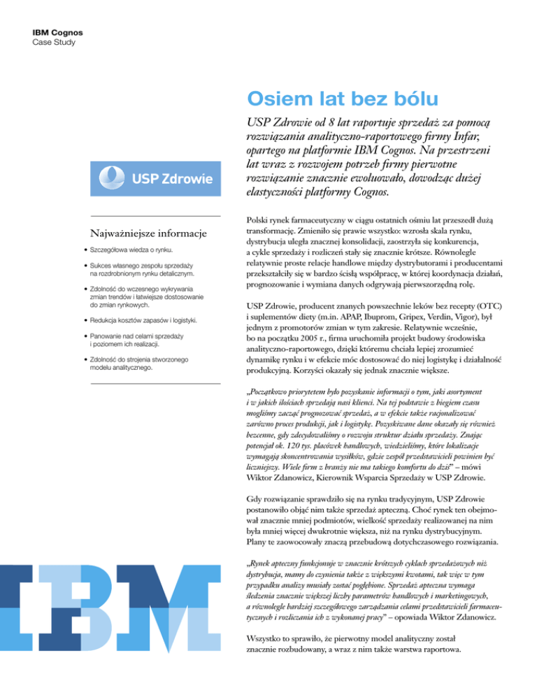IBM Cognos Case Study Osiem lat bez bólu USP Zdrowie od 8 lat raportuje sprzedaż za pomocą rozwiązania analityczno-raportowego firmy Infar, opartego na platformie IBM Cognos. Na przestrzeni lat wraz z rozwojem potrzeb firmy pierwotne rozwiązanie znacznie ewoluowało, dowodząc dużej elastyczności platformy Cognos. Najważniejsze informacje • Szczegółowa wiedza o rynku. • Sukces własnego zespołu sprzedaży na rozdrobnionym rynku detalicznym. • Zdolność do wczesnego wykrywania zmian trendów i łatwiejsze dostosowanie do zmian rynkowych. • Redukcja kosztów zapasów i logistyki. • Panowanie nad celami sprzedaży i poziomem ich realizacji. • Zdolność do strojenia stworzonego modelu analitycznego. Polski rynek farmaceutyczny w ciągu ostatnich ośmiu lat przeszedł dużą transformację. Zmieniło się prawie wszystko: wzrosła skala rynku, dystrybucja uległa znacznej konsolidacji, zaostrzyła się konkurencja, a cykle sprzedaży i rozliczeń stały się znacznie krótsze. Równolegle relatywnie proste relacje handlowe między dystrybutorami i producentami przekształciły się w bardzo ścisłą współpracę, w której koordynacja działań, prognozowanie i wymiana danych odgrywają pierwszorzędną rolę. USP Zdrowie, producent znanych powszechnie leków bez recepty (OTC) i suplementów diety (m.in. APAP, Ibuprom, Gripex, Verdin, Vigor), był jednym z promotorów zmian w tym zakresie. Relatywnie wcześnie, bo na początku 2005 r., firma uruchomiła projekt budowy środowiska analityczno-raportowego, dzięki któremu chciała lepiej zrozumieć dynamikę rynku i w efekcie móc dostosować do niej logistykę i działalność produkcyjną. Korzyści okazały się jednak znacznie większe. „Początkowo priorytetem było pozyskanie informacji o tym, jaki asortyment i w jakich ilościach sprzedają nasi klienci. Na tej podstawie z biegiem czasu mogliśmy zacząć prognozować sprzedaż, a w efekcie także racjonalizować zarówno proces produkcji, jak i logistykę. Pozyskiwane dane okazały się również bezcenne, gdy zdecydowaliśmy o rozwoju struktur działu sprzedaży. Znając potencjał ok. 120 tys. placówek handlowych, wiedzieliśmy, które lokalizacje wymagają skoncentrowania wysiłków, gdzie zespół przedstawicieli powinien być liczniejszy. Wiele firm z branży nie ma takiego komfortu do dziś” – mówi Wiktor Zdanowicz, Kierownik Wsparcia Sprzedaży w USP Zdrowie. Gdy rozwiązanie sprawdziło się na rynku tradycyjnym, USP Zdrowie postanowiło objąć nim także sprzedaż apteczną. Choć rynek ten obejmował znacznie mniej podmiotów, wielkość sprzedaży realizowanej na nim była mniej więcej dwukrotnie większa, niż na rynku dystrybucyjnym. Plany te zaowocowały znaczą przebudową dotychczasowego rozwiązania. „Rynek apteczny funkcjonuje w znacznie krótszych cyklach sprzedażowych niż dystrybucja, mamy do czynienia także z większymi kwotami, tak więc w tym przypadku analizy musiały zostać pogłębione. Sprzedaż apteczna wymaga śledzenia znacznie większej liczby parametrów handlowych i marketingowych, a równolegle bardziej szczegółowego zarządzania celami przedstawicieli farmaceutycznych i rozliczania ich z wykonanej pracy” – opowiada Wiktor Zdanowicz. Wszystko to sprawiło, że pierwotny model analityczny został znacznie rozbudowany, a wraz z nim także warstwa raportowa. IBM Cognos Case Study „Dzięki zastosowanym rozwiązaniom zyskaliśmy przewagę konkurencyjną. Dobrze poznaliśmy rynek, a pozyskaną wiedzę wykorzystaliśmy do zwiększenia sprzedaży. Informacje o bieżącym popycie przełożyły się na redukcję kosztów logistycznych, optymalizację zapasów, a także na lepsze planowanie produkcji, co w rezultacie ma pozytywny wpływ na rentowność firmy...” – Wiktor Zdanowicz, Kierownik Wsparcia Sprzedaży w USP Zdrowie. USP Zdrowie od początku koncentrowało się na definiowaniu założeń i celów dla rozwiązania analityczno-raportowego – utrzymanie oraz rozwój środowiska Cognos powierzone zostały firmie Infar z Zielonej Góry. „Na przestrzeni tych ośmiu lat rozwiązanie funkcjonujące w USP Zdrowie przeszło kilka zasadniczych zmian architektury. Wraz z kolejnymi wersjami środowiska Cognos, a było ich 3, rozszerzały się możliwości analityczne i raportowe, które na bieżąco dostosowywaliśmy do potrzeb klienta. Zmieniał się również model danych, oczekiwania w dziedzinie zakresu i poziomu szczegółowości analiz, struktura raportów, konstrukcje wskaźników, przybywało źródeł danych, słowników… Wszystko to dało się uwzględnić bez wymiany czy też zasadniczej zmiany koncepcji rozwiązania” – podkreśla Roman Ferster, Dyrektor ds. Wdrożeń w Infar Sp. z o.o. Obecnie USP Zdrowie korzysta ze środowiska Cognos 8. W portalu Cognos dostępne są liczne raporty standardowe oraz tematyczne bazy analityczne (kostki OLAP) zawierające przetworzone dane pochodzące z wielu źródeł. Są to m.in. raporty od dystrybutorów, dane z systemu SFA (Asseco EBI), dane z systemu ERP USP Zdrowie (SAP), a także dane o sprzedaży pochodzące ze źródeł zewnętrznych, np. raporty IMS. Rozwiązanie oparte na platformie Cognos na przestrzeni 8 lat wspierało pracowników USP Zdrowie w realizacji wielu ważnych celów operacyjnych i biznesowych. „Dzięki zastosowanym rozwiązaniom zyskaliśmy przewagę konkurencyjną. Dobrze poznaliśmy rynek, a pozyskaną wiedzę wykorzystaliśmy do zwiększenia sprzedaży. Informacje o bieżącym popycie przełożyły się na redukcję kosztów logistycznych, optymalizację zapasów, a także na lepsze planowanie produkcji, co w rezultacie ma pozytywny wpływ na rentowność firmy. Dane i analizy pomogły nam stawić czoła zmianom, którym w tym czasie podlegał rynek farmaceutyczny. Warto też podkreślić, że obecnie dysponujemy sprawdzonym, wielowymiarowym modelem analitycznym i mamy możliwość dostosowywania go do naszych potrzeb, dzięki cz