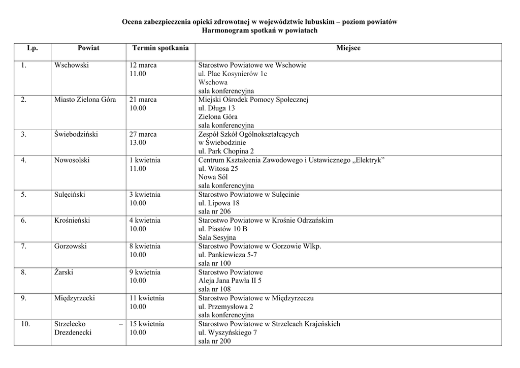 Ocena zabezpieczenia opieki zdrowotnej w województwie lubuskim – poziom powiatów Harmonogram spotkań w powiatach Lp. Powiat Termin spotkania 1. Wschowski 12 marca 11.00 2. Miasto Zielona Góra 21 marca 10.00 3. Świebodziński 27 marca 13.00 4. Nowosolski 1 kwietnia 11.00 5. Sulęciński 3 kwietnia 10.00 6. Krośnieński 4 kwietnia 10.00 7. Gorzowski 8 kwietnia 10.00 8. Żarski 9 kwietnia 10.00 9. Międzyrzecki 11 kwietnia 10.00 10. Strzelecko Drezdenecki – 15 kwietnia 10.00 Miejsce Starostwo Powiatowe we Wschowie ul. Plac Kosynierów 1c Wschowa sala konferencyjna Miejski Ośrodek Pomocy Społecznej ul. Długa 13 Zielona Góra sala konferencyjna Zespół Szkół Ogólnokształcących w Świebodzinie ul. Park Chopina 2 Centrum Kształcenia Zawodowego i Ustawicznego „Elektryk” ul. Witosa 25 Nowa Sól sala konferencyjna Starostwo Powiatowe w Sulęcinie ul. Lipowa 18 sala nr 206 Starostwo Powiatowe w Krośnie Odrzańskim ul. Piastów 10 B Sala Sesyjna Starostwo Powiatowe w Gorzowie Wlkp. ul. Pankiewicza 5-7 sala nr 100 Starostwo Powiatowe Aleja Jana Pawła II 5 sala nr 108 Starostwo Powiatowe w Międzyrzeczu ul. Przemysłowa 2 sala konferencyjna Starostwo Powiatowe w Strzelcach Krajeńskich ul. Wyszyńskiego 7 sala nr 200 11. Miasto Gorzów Wlkp. 12. Słubicki 17 kwietnia 11.00 25 kwietnia 10.00 Sala Herbowa Urzędu Miasta ul. Sikorskiego 3-4 Starostwo Powiatowe w Słubicach ul. Piłsudskiego 20 sala konferencyjna