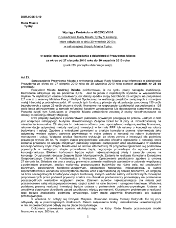 DUR.0055-8/10 Rada Miasta Tychy Wyciąg z Protokołu nr 0052/XLVII/10 z posiedzenia Rady Miasta Tychy V kadencji, które odbyło się w dniu 30 września 2010 r. w sali sesyjnej Urzędu Miasta Tychy. w części dotyczącej Sprawozdania z działalności Prezydenta Miasta za okres od 27 sierpnia 2010 roku do 30 września 2010 roku (punkt 23 porządku dziennego sesji). Ad 23. Sprawozdanie Prezydenta Miasta z wykonania uchwał Rady Miasta oraz informacja o działalności Prezydenta za okres od 27 sierpnia 2010 roku do 30 września 2010 roku stanowi załącznik nr 28 do protokołu. Prezydent Miasta Andrzej Dziuba poinformował, iż na rynku pracy nastąpiła stabilizacja. Bezrobocie utrzymuje się na poziomie 5,4%. Jest to jeden z najniższych wyników w województwie śląskim. W najbliższym czasie oczekiwany jest dalszy spadek stopy bezrobocia ze względu na pozyskanie 2,7 mln zł z rezerwy Ministra Pracy i Polityki Społecznej na realizację projektów związanych z rozwojem małej i średniej przedsiębiorczości. W ramach tych funduszy planuje się aktywizację zawodową 150 osób bezrobotnych z czego 25 osób otrzyma środki finansowe na rozpoczęcie działalności gospodarczej a 125 osób będą aktywizowane w ramach refundacji kosztów wyposażenia lub doposażenia stanowiska pracy. Ponadto dzięki tym funduszom w Urzędzie Miasta zatrudnione zostaną 2 osoby niepełnosprawne do obsługi monitoringu Straży Miejskiej. Dwa projekty związane z partnerstwem publiczno-prywatnym postępują do przodu. Jednym z nich jest adaptacja istniejącego budynku zlikwidowanego Zespołu Szkół Nr 3 przy ul. Nowokościelnej na mieszkania komunalne. 29 sierpnia br. dokonano odbioru prac, sporządzono wstępną analizę finansową, rekomendacje optymalnej metody realizacji inwestycji w formule PPP lub ustawy o koncesji na roboty budowlane i usługi. Zgodnie z wnioskami zawartymi w analizie kancelaria prawna rekomenduje jako optymalny wariant wyboru partnera prywatnego w trybie ustawy o koncesji na roboty budowlanomontażowe i usługi. Wstępna analiza finansowa wykazuje, że okres zwrotu z inwestycji dla podmiotu prawnego wynosi 25 lat. W drugim etapie przygotowane zostanie oficjalne ogłoszenie o koncesji, które zostanie przesłane do urzędu oficjalnych publikacji wspólnot europejskich oraz opublikowane w siedzibie koncesjonodawcy czyli Urzędu Miasta oraz na stronie internetowej. W przypadku zgłoszenia się podmiotów prywatnych w następnym etapie prowadzone będą negocjacje prowadzące do wyboru partnera koncesjonariusza. Efektem końcowym będzie wybór najkorzystniejszej oferty i zawarcie umowy na koncesję. Drugi projekt dotyczy Zespołu Szkół Municypalnych. Zadanie to realizuje Kancelaria Doradztwa Gospodarczego Cieślak & Kordasiewicz z Warszawy. Opracowanie przekazano zgodnie z umową 27 sierpnia br. Składało się ono z analizy prawnej w zakresie możliwych wariantów w zakresie współpracy z podmiotem prawnym, analizy wariantów przeznaczenia budynków na różne cele, od powierzchni biurowych, powierzchni handlowo-usługowych, działalność hotelarska, mieszkaniową, w sumie zaprezentowano 5 wariantów wykorzystania obiektu wraz z uproszczoną jej analizą finansową. Ze względu na brak szczegółowych kosztorysów części środkowej, których wartość zależy od konkretnych rozwiązań proponowanych przez podmiot prywatny analiza ma charakter porównawczy pozwalający na porównanie poszczególnych wariantów względem siebie. Zdaniem autorów najkorzystniejsze dla miasta jest przeznaczenie całej niezagospodarowanej części szkół na cele biurowe i usługowo-handlowe. Właściwą podstawą prawną realizacji inwestycji będzie ustawa o partnerstwie publiczno-prywatnym. Ustawa ta umożliwia elastyczne określenie zasad współpracy między partnerami. Kluczowym problemem w realizacji tego będzie znalezienie podmiotu prywatnego, który może zapewnić finansowanie tak dużego przedsięwzięcia. 5 września br. odbyły się Dożynki Miejskie. Dokonano zmiany formuły Dożynek. Do tej pory odbywały się w poszczególnych dzielnicach. Celem zwiększenia liczby mieszkańców uczestniczących w nin. imprezie Dożynki odbyły się na placu Baczyńskiego. Dokonano przekazania aparatu okulistycznego, na który Rada Miasta przeznaczyła środki finansowe w wys. 200 tys. zł. 1 Rozpoczął działalność Teatr Konesera. Pierwszy spektakl już się odbył – Teatr im. Stefana Jaracza w Łodzi. Kolejne będą odbywać się raz w miesiącu. W tym całorocznym cyklu uczestniczą najlepsze teatry polskie. Odbyły się Targi Solarne na placu Baczyńskiego. Idea dofinansowania solarów przez Narodowy Fundusz Ochrony Środowiska stała się bardzo popularna. Otwarto punkt informacyjny w Urzędzie Miasta. Na targach zaprezentowali się producenci solarów. Zainteresowanych było wielu. W ramach olimpiad specjalnych miasto gościła reprezentacja Włoch. Odbył się bieg ze zniczem olimpijskim, treningi zawodników. Natomiast sama olimpiada odbyła się w Stolicy. Prezydent zaprosił zebranych na XIII edycję Śląskiej Jesieni Gitarowej – jeden z najważniejszych festiwali gitarowych w Europie. Festiwal rozpocznie się 2 października eventem pod Żyrafą. Żyrafa na czas festiwalu przeobrażona została w gitarę. Zaproszeni zostali znani gitarzyści tj. Michał Czachowski, Leszek Winder, Julia Lauer oraz mieszkańcy miasta do wspólnego zagrania na gitarze utworu pt. Dom Wschodzącego Słońca. W tym celu także w gazecie wydrukowane zostały chwyty na gitarę do tego utworu. Sam festiwal rozpocznie się 9 października. W koncercie inauguracyjnym udział wezmą Krzysztof Pełech, Dariusz Kurpiński, Jakub Lubina oraz orkiestra miasta Tychy Aukso. Natomiast w środę 13 października wystąpi AL DI MEOLA amerykański gitarzysta jazzowy, jeden z najlepszych gitarzystów na świecie. Festiwal zakończy się w 16 października br. koncertem orkiestry Aukso z solistami. 1 października br.