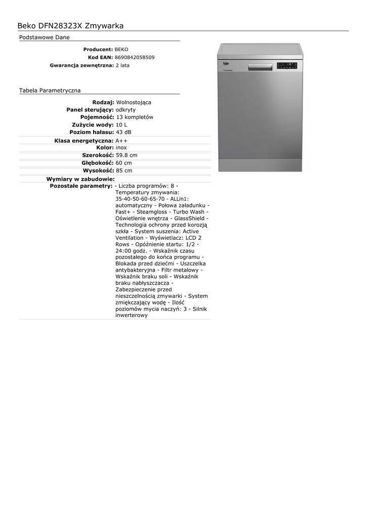 Beko DFN28323X Zmywarka Podstawowe Dane Producent: BEKO Kod EAN: 8690842058509 Gwarancja zewnętrzna: 2 lata Tabela Parametryczna Rodzaj: Wolnostojąca Panel sterujący: odkryty Pojemność: 13 kompletów Zużycie wody: 10 L Poziom hałasu: 43 dB Klasa energetyczna: A++ Kolor: inox Szerokość: 59.8 cm Głębokość: 60 cm Wysokość: 85 cm Wymiary w zabudowie: Pozostałe parametry: - Liczba programów: 8 Temperatury zmywania: 35-40-50-60-65-70 - ALLin1: automatyczny - Połowa załadunku Fast+ - Steamgloss - Turbo Wash Oświetlenie wnętrza - GlassShield Technologia ochrony przed korozją szkła - System suszenia: Active Ventilation - Wyświetlacz: LCD 2 Rows - Opóźnienie startu: 1/2 24:00 godz. - Wskaźnik czasu pozostałego do końca programu Blokada przed dziećmi - Uszczelka antybakteryjna - Filtr metalowy Wskaźnik braku soli - Wskaźnik braku nabłyszczacza Zabezpieczenie przed nieszczelnością zmywarki - System zmiękczający wodę - Ilość poziomów mycia naczyń: 3 - Silnik inwerterowy