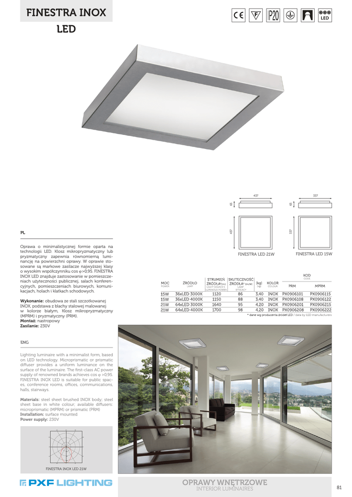 FINESTRA INOX LED PL Oprawa o minimalistycznej formie oparta na technologii LED. Klosz mikropryzmatyczny lub pryzmatyczny zapewnia równomierną luminancję na powierzchni oprawy. W oprawie stosowane są markowe zasilacze najwyższej klasy o wysokim współczynniku cos ϕ >0,95. FINESTRA INOX LED znajduje zastosowanie w pomieszczeniach użyteczności publicznej, salach konferencyjnych, pomieszczeniach biurowych, komunikacjach, holach i klatkach schodowych. 65 337 337 437 65 437 FINESTRA LED 21W FINESTRA LED 15W Wykonanie: obudowa ze stali szczotkowanej INOX, podstawa z blachy stalowej malowanej w kolorze białym, Klosz mikropryzmatyczny (MPRM) i pryzmatyczny (PRM). Montaż: nastropowy Zasilanie: 230V ENG Lighting luminaire with a minimalist form, based on LED technology. Microprismatic or prismatic diffuser provides a uniform luminance on the surface of the luminaire. The first-class AC power supply of renowned brands achieves cos ϕ >0,95. FINESTRA INOX LED is suitable for public spaces, conference rooms, offices, communications, halls, stairways. Materials: steel sheet brushed INOX body; steel sheet base in white colour; available diffusers: microprismatic (MPRM) or prismatic (PRM) Installation: surface mounted Power supply: 230V FINESTRA INOX LED 21W OPRAWY WNĘTRZOWE INTERIOR LUMINAIRES 81