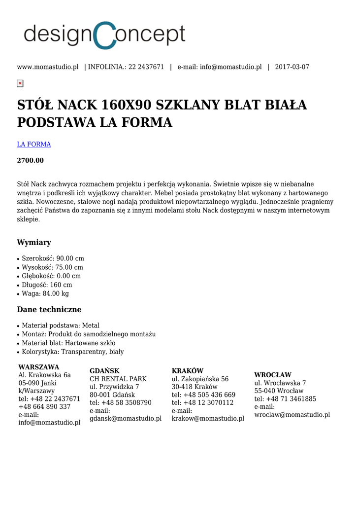 www.momastudio.pl | INFOLINIA.: 22 2437671 | e-mail: [email protected] | 2017-03-07 STÓŁ NACK 160X90 SZKLANY BLAT BIAŁA PODSTAWA LA FORMA LA FORMA 2700.00 Stół Nack zachwyca rozmachem projektu i perfekcją wykonania. Świetnie wpisze się w niebanalne wnętrza i podkreśli ich wyjątkowy charakter. Mebel posiada prostokątny blat wykonany z hartowanego szkła. Nowoczesne, stalowe nogi nadają produktowi niepowtarzalnego wyglądu. Jednocześnie pragniemy zachęcić Państwa do zapoznania się z innymi modelami stołu Nack dostępnymi w naszym internetowym sklepie. Wymiary ● ● ● ● ● Szerokość: 90.00 cm Wysokość: 75.00 cm Głębokość: 0.00 cm Długość: 160 cm Waga: 84.00 kg Dane techniczne ● ● ● ● Materiał podstawa: Metal Montaż: Produkt do samodzielnego montażu Materiał blat: Hartowane szkło Kolorystyka: Transparentny, biały WARSZAWA Al. Krakowska 6a 05-090 Janki k/Warszawy tel: +48 22 2437671 +48 664 890 337 e-mail: [email protected] GDAŃSK CH RENTAL PARK ul. Przywidzka 7 80-001 Gdańsk tel: +48 58 3508790 e-mail: [email protected] KRAKÓW ul. Zakopiańska 56 30-418 Kraków tel: +48 505 436 669 tel: +48 12 3070112 e-mail: [email protected] WROCŁAW ul. Wrocławska 7 55-040 Wrocław tel: +48 71 3461885 e-mail: [email protected]