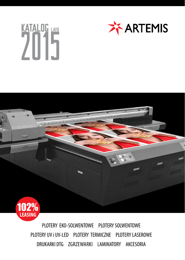 KATALOG LATO 2015 102% LEASING PLOTERY EKO-SOLWENTOWE PLOTERY SOLWENTOWE PLOTERY UV i UV-LED PLOTERY TERMICZNE PLOTERY LASEROWE DRUKARKI DTG ZGRZEWARKI LAMINATORY AKCESORIA PLOTERY EKO-SOLWENTOWE PLOTERY EKO-SOLWENTOWE Artemis 1601 HL / HLV NAJCZĘŚCIEJ WYBIERANY EKO-SOLWENT W POLSCE Podświetlenie diodami LED Głowica DX7 System stałego zasilania 20 m2/h Artemis 1621 NOWY PLOTER EKO-SOLWENTOWY Ułatwiony dostęp do głowic Głowica DX5 - druk falą System stałego zasilania Podwójny system suszący: promiennik IR + wentylatory System rolowy 102% LEASING HLV: technologia zmiennej kropli HLV: suszarka podczerwieni Główne zalety: - wysokiej jakości głowice DX7 - suszarka z promiennikiem IR (model 1601 HLV) lub powietrzna (1601 HL) - druk zmienną kroplą (model 1601 HLV) - niska cena oryginalnych, przyjaznych dla środowiska atramentów - system stałego zasilania obniżający koszty druku - automatyczny system nawijająco-rozwijający - zaawansowane oprogramowanie RIP - PhotoPrint - najwyższy stosunek jakości do ceny - szybki zwrot z inwestycji 2 102% Oprogramowanie PhotoPrint LEASING ARTEMIS 1601 HLV Atrament Szerokość materiału Szerokość zadruku Rozdzielczość Prędkość Gwarancja u klienta eko-solwent (CMYK) max. 1620 mm max. 1600 mm max. 720 x 2880 dpi max. 20 m2/h 12 miesięcy Stabilna konstrukcja SUSZARKA INFRA-RED (1601 HLV) STABILNY EKO-SOLWENT Technologia zmiennej wielkości kropli atramentu pozwala uzyskać „gładkie” wydruki bez tzw. efektu ziarna, które tworzą pojedyncze, widoczne gołym okiem krople atramentu. Dzięki automatycznej regulacji wielkości wystrzeliwanych z poszczególnych dysz kropli atramentu, mieszają się one ze sobą tworząc regularną powierzchnię. Efektem tego zabiegu jest wizualna poprawa jakości druku np. w miejscach o dużej liczbie detali. Znacząco poprawiają się także jednokolorowe aple i gładkie gradienty. Zewnętrzna suszarka Infra-Red, w której zamiast strumienia powietrza zastosowano promiennik podczerwieni znacząco poprawia schnięcie wydruków. Przekłada się to na możliwość stosowania szybszych trybów pracy z gwarancją dokładnego wysuszenia wydruku. Artemis 1621 to stabilny, wszechstronny ploter eko-solwentowy do produkcji grafik reklamowych, grafik na pojazdy, tapet, rollupów, grafik wystawienniczych, naklejek, dekoracji, itd. ARTEMIS PRINTERS KATALOG 2015 Ciężki, 2-silnikowy system nawijający Główne zalety: - wysokiej jakości głowice DX5 - druk falą - eliminujący paskowanie - stół z 3 niezależnymi grzałkami (przed, pod i za głowicą) - podwójny system suszący: promiennik podczerwieni + wentylatory - system stałego zasilania obniżający koszty druku - 2-silnikowy system nawijający - zaawansowane oprogramowanie RIP - PhotoPrint - najwyższy stosunek jakości do ceny - szybki zwrot z inwestycji ZMIENNA WIELKOŚĆ KROPLI ATRAMENTU (1601 HLV) Plotery 1601 HL i HLV posiadają parametry i stabilność pracy w niczym nie odbiegające od możliwości maszyn europejskich i japońskich. 16 m2/h ARTEMIS 1621 Atrament Szerokość materiału Szerokość zadruku Rozdzielczość Prędkość Gwarancja u klienta eko-solwent (CMYK) max. 1600 mm max. 1520 mm max. 1440 x 1440 dpi max. 16 m2/h 12 miesięcy Wyposażony jest w szereg profesjonalnych rozwiązań, m.in.: podwójny system suszący, druk falą, 3-strefowy stół, dwusilnikowy system nawijający, system stałego zasilania w atrament, itd. www.artemisprinters.eu 3 PLOTERY LED-UV (MEMBRANA) PLOTERY EKO-SOLWENTOWE Artemis 1801S MEMBRANE PREMIERA: PLOTER LED-UV DO DRUKU NA MEMBRANACH Fotograficzna jakość druku - 1440 x 1440 dpi Głowica DX5 Artemis 1800 jakość głowic DX5 Głowice DX5 (1440 dpi) System stałego zasilania System stałego zasilania Panel sterowania LCD 102% 102% LEASING Druk na membranach LEASING Podwójny system odwijający Specjalny system nawijający Wodne chłodzenie lamp UV System suszący System rolowy Artemis 1800 to ploter o szerokości 1800 mm. Pozwala na wzmocnienie mocy produkcyjnych istniejących parków maszynowych jak i zastąpienie maszyn starszej generacji. DRUKUJ NA MEMBRANIE Membrana to specjalny rodzaj materiału przypominający elastyczną ceratę. Przykładowe zastosowanie membran to: materace, przewijaki, zabawki, obrusy, sufity i inne dekoracje. Ploter Artemis 1801S umożliwia rozszerzenie produkcji o druk na nowym, atrakcyjnym nośniku. Technologia UV zastosowana w Artemis 1801S umożliwia także druk na „tradycyjnych” materiałach takich jak: folie samoprzylepne, papiery, banery, płótna oraz inne media powlekane i niepowlekane, itd. ARTEMIS 1801S MEMBRANE Atrament Szerokość materiału Szerokość zadruku Rozdzielczość Prędkość Gwarancja u klienta UV (CMYK) max. 1850 mm max. 1800 mm max. 1440 x 1440 dpi max. 18 m2/h (4 pasy) 12 miesięcy Sprawdzi się w druku pełno-kolorowych grafik reklamowych, elementów wyposażenia wnętrz, grafikach wystawienniczych, oznakowaniu informacyjnym, aplikacjach samochodowych i wielu innych. Wydruki zachowują odporność na warunki atmosferyczne (woda, światło UV) do 3 lat. SPECJALISTYCZNE SYSTEMY WYSOKA JAKOŚĆ GŁOWICE DX5 Artemis 1802 LED-UV wyposażony został w kilka unikalnych rozwiązań umożliwiających druk na membranach. Artemis 1800 dzięki najnowszym głowicom piezo Epson DX5 o 3.5 pikolitrowej kropli zapewni fotograficzną rozdzielczość 1440 x 1440 dpi. Ploter cechuje się maksymalną prędkością druku 35 m2/h. Zautomatyzowany system rolowy, wyposażony w sprzęgło elektro-magnetyczne utrzymuje stały naciąg materiału, eliminując jego fałdowanie i podwijanie podczas druku. Ploter wyposażony jest w automatyczny system chłodzący do lamp UV. Ciągłość produkcji zapewnia system stałego zasilania w atrament. 4 Eko-solwentowy Artemis cechuje się niskim kosztem eksploatacji jak i niskim kosztem zakupu. Posiada więc bardzo dobry wskaźnik zwrotu inwestycji. ARTEMIS PRINTERS ARTEMIS 1800 Atrament Szerokość materiału Szerokość zadr