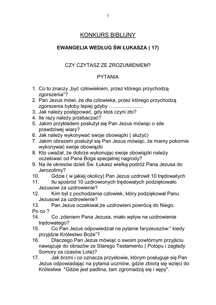 1 KONKURS BIBLIJNY EWANGELIA WEDŁUG ŚW ŁUKASZA ( 17) CZY CZYTASZ ZE ZROZUMIENIEM? PYTANIA 1. Co to znaczy „być człowiekiem, przez którego przychodzą zgorszenia”? 2. Pan Jezus mówi, że dla człowieka, przez którego przychodzą zgorszenia byłoby lepiej gdyby ……………….. 3. Jak należy postępować, gdy ktoś czyni zło? 4. Ile razy należy przebaczać? 5. Jakim przykładem posłużył się Pan Jezus mówiąc o sile prawdziwej wiary? 6. Jak należy wykonywać swoje obowiązki ( służyć) 7. Jakim obrazem posłużył się Pan Jezus mówiąc, że mamy pokornie wykonywać swoje obowiązki 8. Kto uważał, że dobrze wykonując swoje obowiązki należy oczekiwać od Pana Boga specjalnej nagrody? 9. Na ile okresów dzieli Św. Łukasz wielką podróż Pana Jezusa do Jerozolimy? 10. Gdzie ( w jakiej okolicy) Pan Jezus uzdrowił 10 trędowatych 11. Ilu spośród 10 uzdrowionych trędowatych podziękowało Jezusowi za uzdrowienie? 12. Kim był z pochodzenia człowiek, który podziękował Panu Jezusowi za uzdrowienie? 13. Pan Jezus oczekiwał,że uzdrowieni powrócą do Niego. Po co ? 14. Co ,zdaniem Pana Jezusa, miało wpływ na uzdrowienie trędowatego? 15. Co Pan Jezus odpowiedział na pytanie faryzeuszów:” kiedy przyjdzie Królestwo Boże”? 16. Dlaczego Pan Jezus mówiąc o swoim powtórnym przyjściu nawiązuje do obrazów ze Starego Testamentu ( Potopu i zagłady Somory za czasów Lota)? 17. Jak brzmi i co oznacza przysłowie, którym posługuje się Pan Jezus odpowiadając na pytania uczniów, gdzie zbiorą się wzięci do Królestwa "Gdzie jest padlina, tam zgromadzą się i sępy". 2 KONKURS BIBLIJNY EWANGELIA WEDŁUG ŚW ŁUKASZA ( Łk 17) CZY CZYTASZ ZE ZROZUMIENIEM? KLUCZ DO ODPOWIEDZI 1. 2. 3. 4. 5. Publicznie czynić zło. Dawać zły przykład …Kamień młyński zawieszono mu u szyi i wrzucono go w morze należy zwrócić uwagę należy przebaczyć mu jeżeli żałuje popełnionego zła należy przebaczać zawsze ( 7 razy) Nieustannie ( 7 razy) Pan rzekł: "Gdybyście mieli wiarę jak ziarnko gorczycy, powiedzielibyście tej morwie: "Wyrwij się z korzeniem i przesadź się w morze!", a byłaby wam posłuszna. 6. Z pokorą 7. Obrazem nieużytecznych sług : „Kto z was, mając sługę, który orze lub pasie, powie mu, gdy on wróci z pola: "Pójdź i siądź do stołu?" Czy nie powie mu raczej: "Przygotuj mi wieczerzę, przepasz się i usługuj mi, aż zjem i napiję się, a potem ty będziesz jadł i pił?" Czy dziękuje słudze za to, że wykonał to, co mu polecono? Tak mówcie i wy, gdy uczynicie wszystko, co wam polecono: "Słudzy nieużyteczni jesteśmy; wykonaliśmy to, co powinniśmy wykonać"". 8. Faryzeusze 9. Trzy 10. Na pograniczu Galilei i Samarii 11. 1 12. Samarytaninem ( Samarytanie nie utrzymywali kontaktów z Żydami. Byli u Żydów w pogardzie) 13. By oddać chwałę Bogu. 14. Jego wiara 15. Królestwo Boże urzeczywistnia się w dwóch etapach Jest obecne teraz, nawet jeśli nie w formie dostrzegalnej i wymaga decyzji i zaangażowania 3 W pełni zrealizuje się wówczas, gdy Jezus – po męce- powróci w chwale „ w dniu Jego” 16. Przybycie Jezusa będzie nagłą niespodzianką dla ludzi bezmyślnych, przywiązanych do bogactw ( tak jak sąd Boży był zaskoczeniem dla ludzi w czasach Noego i Lota). Będzie to dzień zagłady dla każdego, kto będzie chciał zachować swoje życie, a dzień zbawienia dla każdego , kto „ umie je stracić” 17. "Gdzie jest padlina, tam zgromadzą się i sępy". Jak sępy zlatują się gromadnie na miejsce gdzie jest padlina, tak wybrani zbiorą się w jednej chwili wokół Syna Człowieczego ( Chrystusa)