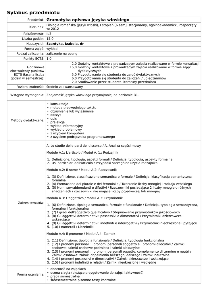 Sylabus przedmiotu Przedmiot: Gramatyka opisowa języka włoskiego Filologia romańska (język włoski), I stopień [6 sem], stacjonarny, ogólnoakademicki, rozpoczęty Kierunek: w: 2012 Rok/Semestr: II/3 Liczba godzin: 15,0 Nauczyciel: Szantyka, Izabela, dr Forma zajęć: wykład Rodzaj zaliczenia: zaliczenie na ocenę Punkty ECTS: 1,0 2,0 Godziny kontaktowe z prowadzącym zajęcia realizowane w formie konsultacji 15,0 Godziny kontaktowe z prowadzącym zajęcia realizowane w formie zajęć dydaktycznych 5,0 Przygotowanie się studenta do zajęć dydaktycznych 6,0 Przygotowanie się studenta do zaliczeń i/lub egzaminów 2,0 Studiowanie przez studenta literatury przedmiotu Godzinowe ekwiwalenty punktów ECTS (łączna liczba godzin w semestrze): Poziom trudności: średnio zaawansowany Wstępne wymagania: Znajomość języka włoskiego przynajmniej na poziomie B1. • • • • • Metody dydaktyczne: • • • • • konsultacje metoda przewodniego tekstu objaśnienie lub wyjaśnienie odczyt opis prelekcja wykład informacyjny wykład problemowy z użyciem komputera z użyciem podręcznika programowanego A. Lo studio delle parti del discorso / A. Analiza części mowy Modulo A.1: L'articolo / Moduł A. 1.: Rodzajnik 1. Definizione, tipologia, aspetti formali / Definicja, typologia, aspekty formalne 2. Usi particolari dell'articolo / Przypadki szczególne użycia rodzajnika Modulo A.2: Il nome / Moduł A.2: Rzeczownik 1. (3) Definizione, classificazione semantica e formale / Definicja, klasyfikacja semantyczna i formalna 2. (4) Formazione del plurale e del femminile / Tworzenie liczby mnogiej i rodzaju żeńskiego 3. (5) Nomi sovrabbondanti e difettivi / Rzeczowniki posiadające 2 liczby mnogie o różnych znaczeniach i rzeczowniki nie mające liczby pojedynczej lub mnogiej Modulo A.3: L'aggettivo / Moduł A.3: Przymiotnik Zakres tematów: 1. (6) Definizione, tipologia semantica, formale e funzionale / Definicja, typologia semantyczna, formalna i funkcjonalna 2. (7) I gradi dell'aggettivo qualificativo / Stopniowanie przymiotników jakościowych 3. (8) Gli aggettivi determinativi: possessivi e dimostrativi / Przymiotniki dzierżawcze i wskazujące 4. (9) Gli aggettivi determinativi: indefiniti e interrogativi / Przymiotniki nieokreślone i pytające 5. (10) I numerali / Liczebniki Modulo A.4: Il pronome / Moduł A.4: Zaimek 1. (11) Definizione, tipologia funzionale / Definicja, typologia funkcjonalna 2. (12) I pronomi personali: I pronomi personali soggetto e i pronomi allocutivi / Zaimki osobowe: zaimki osobowe podmiotu i zaimki alokucyjne 3. (13) I pronomi personali: I pronomi personali oggetto, complemento di termine e neutri / Zaimki osobowe: zaimki dopełnienia bliższego, dalszego i zaimki neutralne 4. (14) I pronomi possessivi e dimostrativi / Zaimki dzierżawcze i wskazujące 5. (15) I pronomi indefiniti e relativi / Zaimki nieokreślone i względne • • Forma oceniania: • • obecność na zajęciach ocena ciągła (bieżące przygotowanie do zajęć i aktywność) praca semestralna śródsemestralne pisemne testy kontrolne • • Warunki zaliczenia: • • Modułowe efekty kształcenia realizowane w ramach przedmiotu: obecność aktywny udział w zajęciach pozytywny wynik ze śródsemestralnych testów kontrolnych pozytywny wynik z analitycznej pracy zaliczeniowej 01 Student ma uporządkowaną ogólną wiedzę w zakresie kompleksowej natury języka włoskiego i jego funkcjonowania na różnych płaszczyznach (fonologicznym, morfosyntaktycznym i pragma-semantycznym). 02 Student dokonuje właściwej selekcji, analizy, oceny informacji przy zastosowaniu różnych metod badawczych. 03 Student posiada podstawowe umiejętności badawcze (tj. formułowanie i analizowanie problemów badawczych, dobór metod i narzędzi badawczych oraz opracowanie i prezentacja wyników), umożliwiające omówienie i zademonstrowanie określonych zagadnień z zakresu gramatyki opisowej języka włoskiego i językoznawstwa włoskiego. 04 Student umie formułować i analizować problemy badawcze, dobiera metody i narzędzia pozwalające na rozwiązywanie typowych problemów w obrębie gramatyki opisowej języka włoskiego i językoznawstwa włoskiego. 05 Student właściwie wykorzystuje nabytą wiedzę teoretyczną przy opracowywaniu poszczególnych zagadnień i rozwiązywaniu problemów z zakresu gramatyki opisowej języka włoskiego i językoznawstwa włoskiego. 06 Student właściwie rozumie, analizuje i interpretuje omawiane zagadnienia z dziedziny gramatyki opisowej języka włoskiego i językoznawstwa włoskiego w celu określenia ich znaczeń, oddziaływania społecznego, miejsca w procesie historyczno-kulturowym. 07 Student porozumiewa się przy użyciu różnych kanałów i technik komunikacyjnych w języku polskim i języku włoskim, operując podstawowymi pojęciami z zakresu językoznawstwa, nauki o komunikowaniu, poetyki, retoryki. 08 Student potrafi współpracować z osobami w grupie przy rozwiązywaniu zagadnień i problemów szczegółowych. 1. DARDANO, M. / TRIFONE, P. (1995):Grammatica italiana con nozioni di linguistica. Bologna: Zanichelli Editore. 2. BONOMI, I. / MASINI, A. / MORGANA, S. / PIOTTI, M. (2005): Elementi di linguistica italiana. Roma: Carocci. Literatura: 3. D'ACHILLE, P. (2003):L'italiano contemporaneo. Bologna:Il Mulino. 4. SERIANNI, L. (1997):Italiano. Grammatica, Sintassi, Dubbi.Torino: Garzanti Editore. 5. PROTO, B. (1988): Guida alla comunicazione linguistica. Firenze: Le Monnier. 6. LOBINA, A. M. / VIGNOTTO, F. / VIGNOTTO, S. (2003):Il libro della grammatica.Milano: La Nuova Italia. Dodatkowe informacje: Egzamin pisemny z przedmiotu przewidziany jest po IV semestrze.