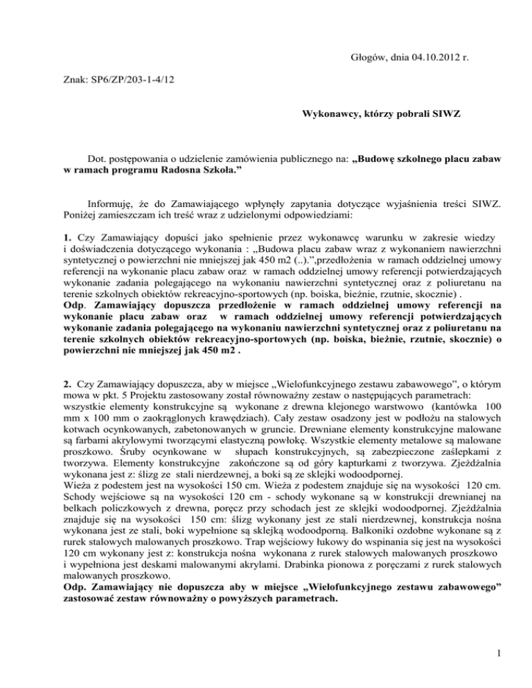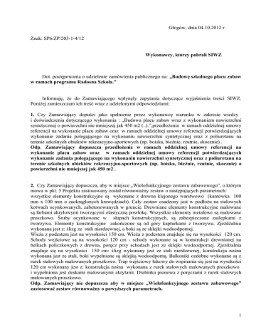 Głogów, dnia 04.10.2012 r. Znak: SP6/ZP/203-1-4/12 Wykonawcy, którzy pobrali SIWZ Dot. postępowania o udzielenie zamówienia publicznego na: „Budowę szkolnego placu zabaw w ramach programu Radosna Szkoła.” Informuję, że do Zamawiającego wpłynęły zapytania dotyczące wyjaśnienia treści SIWZ. Poniżej zamieszczam ich treść wraz z udzielonymi odpowiedziami: 1. Czy Zamawiający dopuści jako spełnienie przez wykonawcę warunku w zakresie wiedzy i doświadczenia dotyczącego wykonania : „Budowa placu zabaw wraz z wykonaniem nawierzchni syntetycznej o powierzchni nie mniejszej jak 450 m2 (..).”,przedłożenia w ramach oddzielnej umowy referencji na wykonanie placu zabaw oraz w ramach oddzielnej umowy referencji potwierdzających wykonanie zadania polegającego na wykonaniu nawierzchni syntetycznej oraz z poliuretanu na terenie szkolnych obiektów rekreacyjno-sportowych (np. boiska, bieżnie, rzutnie, skocznie) . Odp. Zamawiający dopuszcza przedłożenie w ramach oddzielnej umowy referencji na wykonanie placu zabaw oraz w ramach oddzielnej umowy referencji potwierdzających wykonanie zadania polegającego na wykonaniu nawierzchni syntetycznej oraz z poliuretanu na terenie szkolnych obiektów rekreacyjno-sportowych (np. boiska, bieżnie, rzutnie, skocznie) o powierzchni nie mniejszej jak 450 m2 . 2. Czy Zamawiający dopuszcza, aby w miejsce „Wielofunkcyjnego zestawu zabawowego”, o którym mowa w pkt. 5 Projektu zastosowany został równoważny zestaw o następujących parametrach: wszystkie elementy konstrukcyjne są wykonane z drewna klejonego warstwowo (kantówka 100 mm x 100 mm o zaokrąglonych krawędziach). Cały zestaw osadzony jest w podłożu na stalowych kotwach ocynkowanych, zabetonowanych w gruncie. Drewniane elementy konstrukcyjne malowane są farbami akrylowymi tworzącymi elastyczną powłokę. Wszystkie elementy metalowe są malowane proszkowo. Śruby ocynkowane w słupach konstrukcyjnych, są zabezpieczone zaślepkami z tworzywa. Elementy konstrukcyjne zakończone są od góry kapturkami z tworzywa. Zjeżdżalnia wykonana jest z: ślizg ze stali nierdzewnej, a boki są ze sklejki wodoodpornej. Wieża z podestem jest na wysokości 150 cm. Wieża z podestem znajduje się na wysokości 120 cm. Schody wejściowe są na wysokości 120 cm - schody wykonane są w konstrukcji drewnianej na belkach policzkowych z drewna, poręcz przy schodach jest ze sklejki wodoodpornej. Zjeżdżalnia znajduje się na wysokości 150 cm: ślizg wykonany jest ze stali nierdzewnej, konstrukcja nośna wykonana jest ze stali, boki wypełnione są sklejką wodoodporną. Balkoniki ozdobne wykonane są z rurek stalowych malowanych proszkowo. Trap wejściowy łukowy do wspinania się jest na wysokości 120 cm wykonany jest z: konstrukcja nośna wykonana z rurek stalowych malowanych proszkowo i wypełniona jest deskami malowanymi akrylami. Drabinka pionowa z poręczami z rurek stalowych malowanych proszkowo. Odp. Zamawiający nie dopuszcza aby w miejsce „Wielofunkcyjnego zestawu zabawowego” zastosować zestaw równoważny o powyższych parametrach. 1 3. Czy Zamawiający dopuszcza, aby w miejsce „Urządzenia wspinaczkowo-sprawnościowego”, o którym mowa w pkt. 5 Projektu zastosowany został równoważny zestaw o następujących parametrach: Wszystkie elementy konstrukcyjne wykonane są z drewna klejonego warstwowo (kantówka 100mmx100mm o zaokrąglonych krawędziach). Całe zestawy osadzony jest w podłożu na stalowych kotwach ocynkowanych, zabetonowanych w gruncie. Drewniane elementy konstrukcyjne malowane są farbami akrylowymi tworzącymi elastyczną powłokę. Wszystkie elementy metalowe są malowane proszkowo. Śruby ocynkowane w słupach konstrukcyjnych, są zabezpieczone zaślepkami z tworzywa. Elementy konstrukcyjne zakończone są od góry kapturkami z tworzywa. Liny w zestawie wykonane są z lin stalowych w oplocie polipropylenowym. Konstrukcja wykonana jest z sosnowego drewna klejonego. Przeplotnia pionowa z rurek stalowych malowanych proszkowo. Przeplotnia pionowa linowa wykonana jest z lin stalowych na oplocie polipropylenowym. Przeplotnia pozioma – pajęczyna z lin stalowych w oplocie polipropylenowym z poręczami z rurek stalowych malowanych proszkowo. Lina do wspinania się. Drążek do podciągania się jest z rurki stalowej malowanej proszkowo. Drabinka pionowa z poręczami z rurek stalowych malowanych proszkowo. Drążek do podciągania się jest z rurki stalowej malowanej proszkowo. Max. wysokość upadku 2,5 m. Odp. Zamawiający nie dopuszcza, aby w miejsce „Urządzenia wspinaczkowosprawnościowego” zastosować zestaw równoważny o powyższych parametrach. 4. Czy Zamawiający dopuszcza, aby w miejsce „Huśtawki wagowej do huśtania w pozycji na stojąco”, o którym mowa w pkt. 5 Projektu zastosowany został kiwak dwuosobowy o następujących parametrach: Sprężyny są ze stali ocynkowanej – ostatni pierścień sprężyn zabezpieczony jest przed pułapka na zakleszczenie. Całość wykonana jest ze sklejki wodoodpornej o grubości 25 mm. Rurki są stalowe malowane proszkowo. Urządzenie posiada dwa siedziska z oparciem. Odp. Zamawiający nie dopuszcza, aby w miejsce „Huśtawki wagowej do huśtania w pozycji na stojąco”, zastosować kiwak dwuosobowy o powyższych parametrach. 5. Czy Zamawiający dopuszcza, aby w miejsce „Zestawu równoważni”, o którym mowa w pkt. 5 Projektu zastosowany został zestaw równoważni o następujących parametrach: Wszystkie elementy konstrukcyjne wykonane z drewna klejonego warstwowo (kantówka 100 mm x 100 mm o zaokrąglonych krawędziach). Cały zestaw osadzony w podłożu na stalowych kotwach ocynkowanych, zabetonowanych w gruncie. Drewniane elementy konstrukcyjne malowane farbami akrylowymi tworzącymi elastyczną powłokę. Wszystkie elementy wykonane z rurek malowane proszkowo w kolorze. Śruby ocynkowane w słupach konstrukcyjnych, zabezpieczone zaślepkami z tworzywa. Odp. Zamawiający nie dopus