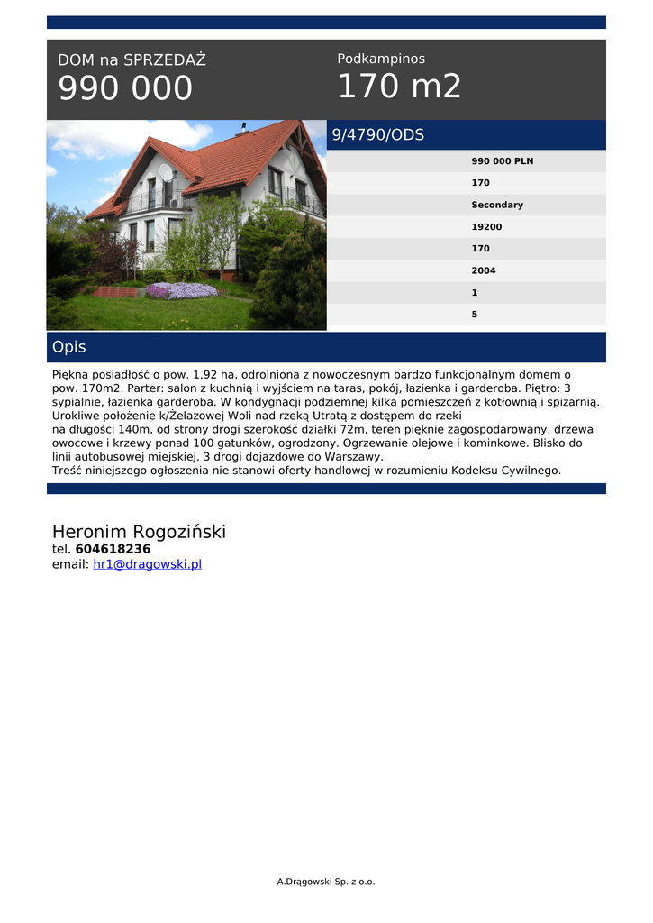 DOM na SPRZEDAŻ 990 000 Podkampinos 170 m2 9/4790/ODS 990 000 PLN 170 Secondary 19200 170 2004 1 5 Opis Piękna posiadłość o pow. 1,92 ha, odrolniona z nowoczesnym bardzo funkcjonalnym domem o pow. 170m2. Parter: salon z kuchnią i wyjściem na taras, pokój, łazienka i garderoba. Piętro: 3 sypialnie, łazienka garderoba. W kondygnacji podziemnej kilka pomieszczeń z kotłownią i spiżarnią. Urokliwe położenie k/Żelazowej Woli nad rzeką Utratą z dostępem do rzeki na długości 140m, od strony drogi szerokość działki 72m, teren pięknie zagospodarowany, drzewa owocowe i krzewy ponad 100 gatunków, ogrodzony. Ogrzewanie olejowe i kominkowe. Blisko do linii autobusowej miejskiej, 3 drogi dojazdowe do Warszawy. Treść niniejszego ogłoszenia nie stanowi oferty handlowej w rozumieniu Kodeksu Cywilnego. Heronim Rogoziński tel. 604618236 email: [email protected] A.Drągowski Sp. z o.o. Powered by TCPDF (www.tcpdf.org)