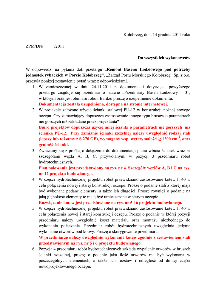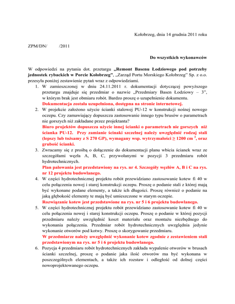 Kołobrzeg, dnia 14 grudnia 2011 roku ZPM/DN/ /2011 Do wszystkich wykonawców W odpowiedzi na pytania dot. przetargu „Remont Basenu Łodziowego pod potrzeby jednostek rybackich w Porcie Kołobrzeg”, „Zarząd Portu Morskiego Kołobrzeg” Sp. z o.o. przesyła poniŜej zestawienie pytań wraz z odpowiedziami. 1. W zamieszczonej w dniu 24.11.2011 r. dokumentacji dotyczącej powyŜszego przetargu znajduje się przedmiar o nazwie „Przedmiary Basen Łodziowy – 3”, w którym brak jest obmiaru robót. Bardzo proszę o uzupełnienie dokumentu. Dokumentacja została uzupełniona, dostępna na stronie internetowej. 2. W projekcie załoŜono uŜycie ścianki stalowej PU-12 w konstrukcji nośnej nowego oczepu. Czy zamawiający dopuszcza zastosowanie innego typu brusów o parametrach nie gorszych niŜ zakładane przez projektanta? Biuro projektów dopuszcza uŜycie innej ścianki o parametrach nie gorszych niŜ ścianka PU-12. Przy zamianie ścinaki szczelnej naleŜy uwzględnić rodzaj stali (lepszy lub toŜsamy z S 270 GP), wymagany wsp. wytrzymałości ≥ 1200 cm 3, oraz grubość ścianki. 3. Zwracamy się z prośbą o dołączenie do dokumentacji planu wbicia ścianek wraz ze szczegółami węzła A, B, C, przywołanymi w pozycji 3 przedmiaru robót hydrotechnicznych. Plan palowania jest przedstawiony na rys. nr 4. Szczegóły węzłów A, B i C na rys. nr 12 projektu budowlanego. 4. W części hydrotechnicznej projektu robót przewidziano zastosowanie kotew fi 40 w celu połączenia nowej i starej konstrukcji oczepu. Proszę o podanie stali z której mają być wykonane podane elementy, a takŜe ich długości. Proszę równieŜ o podanie na jaką głębokość elementy te mają być umieszczone w starym oczepie. Rozwiązanie kotew jest przedstawione na rys. nr 5 i 6 projektu budowlanego. 5. W części hydrotechnicznej projektu robót przewidziano zastosowanie kotew fi 40 w celu połączenia nowej i starej konstrukcji oczepu. Proszę o podanie w której pozycji przedmiaru naleŜy uwzględnić koszt materiału oraz montaŜu niezbędnego do wykonania połączenia. Przedmiar robót hydrotechnicznych uwzględnia jedynie wykonanie otworów pod kotwy. Proszę o skorygowanie przedmiaru. W przedmiarze naleŜy uwzględnić wykonanie kotew zgodnie z zestawieniem stali przedstawionym na rys. nr 5 i 6 projektu budowlanego. 6. Pozycja 4 przedmiaru robót hydrotechnicznych zakłada wypalenie otworów w brusach ścianki szczelnej, proszę o podanie jaka ilość otworów ma być wykonana w poszczególnych elementach, a takŜe ich rozstaw i odległość od dolnej części nowoprojektowanego oczepu. NaleŜy wypalić łącznie ok. 200 otworów filtracyjnych o wymiarach 15 x 1,5 cm, 3 otwory w jednym brusie, co drugi brus. Odległość od dolnej części oczepu wynosi 30 cm. Odległość pomiędzy otworami 30,0 cm. Otwory pod przepuszczenie strzemion wykonać zgodnie z rys 10. 7. Na rys. 3 części hydrotechnicznej przedstawiono zestawienie elementów stalowych, w którym załoŜono uŜycie pręta fi 40 jako ściąg w ilości 130 sztuk. Z rysunku wynika jednak, iŜ rozstawie co 1,2 m ilości prętów jest prawie dwa razy mniejsza. Proszę o ustosunkowanie się. Ściągi naleŜy wykonać w ilości wynikającej z rys zamieszczonego w projekcie budowlanym. 8. Pozycja 11 przedmiaru robót hydrotechnicznych zakłada wykonanie filtra odwrotnego za ścianami konstrukcji. Proszę o podanie z jakiego materiału ma być wykonany filtr, a takŜe o zamieszczenie rysunku uwzględniającego jego połoŜenie. Brak takiego rysunku uniemoŜliwia skorygowanie pozycji przedmiaru. Biuro projektów uwzględnia moŜliwość odstąpienia od wykonania zasypów pod płytą slipu oraz za nabrzeŜem, w związku z czym nie będzie konieczności wykonania filtra odwrotnego. 9. Pozycja 12 przedmiaru robót hydrotechnicznych zakłada wykonanie zasypu wnęk za ścianami konstrukcji. Proszę o podanie z jakiego materiału ma być wykonany zasyp, a takŜe zamieszczenie rysunku uwzględniającego jego połoŜenie. Brak takiego rysunku uniemoŜliwia skorygowanie pozycji przedmiaru. Biuro projektów uwzględnia moŜliwość odstąpienia od wykonania zasypów. 10. Pozycja 15 zakłada zbrojenie nabrzeŜa, brak jednak jakichkolwiek rysunków i opisów dotyczących tej pozycji. Proszę o uzupełnienie dokumentacji. Zbrojenie jest przedstawione na rys. 10 i 11 proj. budowlanego. 11. Pozycja 16 zakłada betonowanie oczepu. Proszę o podanie parametrów betonu załoŜonego do wykonania konstrukcji. Beton C25/30 (B30), klasa wodoodporności W-6, klasa mrozoodporności F150. 12. Pozycje rozdziału 2 przedmiaru robót hydrotechnicznych uwzględniają montaŜ takich elementów jak: pompa do odbioru ścieków, odbojnice, pachoły rurowe, drabinki. Proszę o załączenie rysunków oraz dokumentacji dotyczącej tych elementów. Rysunki są zamieszczone w poszczególnych projektach budowlanych. 13. Pozycje rozdziału 3 przedmiaru robót hydrotechnicznych uwzględniają roboty nawierzchniowe. Proszę o załączenie dokumentacji dotyczącej tego zakresu: rzuty, przekroje nawierzchni wraz z jasnym określeniem przewidzianych do zastosowania materiałów. Nawierzchnię wykonać z płyt chodnikowych. Przekrój jest przedstawiony na rys. nr. 5, rzut nawierzchni jest przedstawiony na rys. zagospodarowania terenu. 14. SIWZ pkt 3.2 jako przedmiot zamówienia określa m.in.: Zadanie 1: a) Pkt 5 – wykonanie kraty do wodowania jednostek ze slipu, Ma być zaczep o szerokości nowobudowanego slipu, o długości 2,40 m b) Pkt 6 – wyposaŜenie nabrzeŜa w sprzęt ratowniczy, 2 Zgodnie z obowiązującymi przepisami, w szczególności: ROZPORZĄDZENIE MINISTRA TRANSPORTU I GOSPODARKI MORSKIEJ z dnia 6 lipca 1993 r. w sprawie bezpieczeństwa i higieny pracy w portach morskich i śródlądowych.(Dz. U. z dnia 9 sierpnia 1993 r.); ROZPORZĄDZENIE MINISTRA TRANSPORTU I GOSPODARKI MORSKIEJ z dnia 1 czerwca 1998 r. w sprawie warunków technicznych, jakim powinny odpowiada