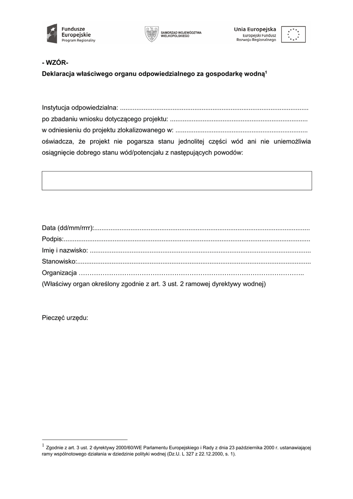 - WZÓRDeklaracja właściwego organu odpowiedzialnego za gospodarkę wodną1 Instytucja odpowiedzialna: ........................................................................................................ po zbadaniu wniosku dotyczącego projektu: ............................................................................ w odniesieniu do projektu zlokalizowanego w: ......................................................................... oświadcza, że projekt nie pogarsza stanu jednolitej części wód ani nie uniemożliwia osiągnięcie dobrego stanu wód/potencjału z następujących powodów: Data (dd/mm/rrrr):....................................................................................................................... Podpis:........................................................................................................................................ Imię i nazwisko: .......................................................................................................................... Stanowisko:................................................................................................................................. Organizacja ………………………………………………………………………………………….. (Właściwy organ określony zgodnie z art. 3 ust. 2 ramowej dyrektywy wodnej) Pieczęć urzędu: 1 Zgodnie z art. 3 ust. 2 dyrektywy 2000/60/WE Parlamentu Europejskiego i Rady z dnia 23 października 2000 r. ustanawiającej ramy wspólnotowego działania w dziedzinie polityki wodnej (Dz.U. L 327 z 22.12.2000, s. 1).
