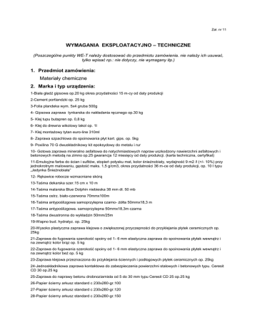 Zał. nr 11 WYMAGANIA EKSPLOATACYJNO – TECHNICZNE (Poszczególne punkty WE-T należy dostosować do przedmiotu zamówienia. nie należy ich usuwać, tylko wpisać np.: nie dotyczy, nie wymagany itp.) 1. Przedmiot zamówienia: Materiały chemiczne 2. Marka i typ urządzenia: 1-Biała gładź gipsowa op.20 kg okres przydatności 15 m-cy od daty produkcji 2-Cement portlandzki op. 25 kg 3-Folia plandeka wym. 5x4 gruba 500g 4- Gipsowa zaprawa tynkarska do nakładania ręcznego op.30 kg 5- Klej tupu butapren op. 0,8 kg 6- Klej do drewna wikolowy lakol op. 1l 7- Klej montażowy tytan euro-line 310ml 8- Zaprawa szpachlowa do spoinowania płyt kart. gips. op. 5kg 9- Poxilina 70 G dwuskładnikowy kit epoksydowy do metalu i rur 10- Gotowa zaprawa mineralno asfaltowa do natychmiastowych napraw uszkodzony nawierzchni asfaltowych i betonowych metodą na zimno op.25 gwarancja 12 miesięcy od daty produkcji. (karta techniczna, certyfikat) 11-Emulsyjna farba do ścian i sufitów, stopień połysku mat, kolor śnieżnobiały, wydajność 9 m2 /l (+/- 10%) przy jednokrotnym malowaniu, gęstość maks. 1,5 g/cm3, okres przydatności 36 m-ce od daty produkcji, op. 10 l typu „Jedynka Śnieżnobiała” 12- Rękawice robocze wzmacniane skórą 13-Taśma dekarska szer.15 cm x 10 m 14-Taśma malarska Blue Dolphin niebieska 38 mm dł. 50 mb 15-Taśma ostrz. biało-czerwona 70mmx100m 16-Taśma antypoślizgowa samoprzylepna czarno- żółta 50mmx18,3 m 17-Taśma antypoślizgowa. samoprzylepna 50mmx18,3m czarna 18-Taśma dwustronna do wykładzin 50mm/25m 19-Wapno bud. hydratyz. op. 25kg 20-Wysoko plastyczna zaprawa klejowa o zwiększonej przyczepności do przyklejania płytek ceramicznych op. 25kg 21-Zaprawa do fugowania szerokość spoiny od 1- 6 mm elastyczna zaprawa do spoinowania płytek wewnątrz i na zewnątrz kolor brąz op. 5 kg 22-Zaprawa do fugowania szerokość spoiny od 1- 6 mm elastyczna zaprawa do spoinowania płytek wewnątrz i na zewnątrz kolor beż op. 5 kg 23-Zaprawa klejowa przeznaczona do przyklejania ściennych i podłogowych płytek ceramicznych op. 25kg 24-Jednoskładnikowa zaprawa kontaktowa do zabezpieczenia powierzchni stalowych i betonowych typu. Ceresit CD 30 op.25 kg 25-Zaprawa do naprawy betonu drobnoziarnista od 5 do 30 mm typu Ceresit CD 25 op.25 kg 26-Papier ścierny arkusz standard c 230x280-gr.100 27-Papier ścierny arkusz standard c 230x280-gr.120 28-Papier ścierny arkusz standard c 230x280-gr.150 29-Papier ścierny arkusz standard c 230x280-gr.180 30-Papier ścierny arkusz standard c 230x280-gr.60 31-Papier ścierny arkusz standard c 230x280-gr.80 32-Gwóźdź budowlany 4x80 fe/zn pn10230 33-Gwóźdź budowlany 4x90 pn10230 34-Gwóźdź budowlany 4x100 35-Gwóźdź budowlany 4,5x125 36-Kołek rozporowy uniwersalny wkręt stożkowy do pustych powierzchni 6x60 37-Kołek rozporowy z wkrętem łeb stożkowy 10x50 38-Kołek rozporowy z wkrętem łeb stożkowy 6x40 39-Kołek rozporowy z wkrętem łeb stożkowy 8x45 40-Kołek rozporowy z wkrętem łeb stożkowy 8x60 41-Kołek szybki montaż 6x60 42-Kołek rozporowy szybki montaż 6x40 43-Kołek szybki montaż 6x80 44-Kołek szybki montaż 8x80 45-Kołki do mocowania ościeżnic 10x112 46-Kołki do mocowania ościeżnic 10x152 47-Pędzel angielski 102mm płaski (włosie mieszane, naturalna szczecina 50%i poliester50% raczka lakierowana) 48-Pędzel angielski 76mm płaski(włosie mieszane, naturalna szczecina 50%i poliester50% raczka lakierowana) 49-Pędzel angielski 63mm płaski(włosie mieszane, naturalna szczecina 50%i poliester50% raczka lakierowana) 50-Pędzel angielski 50mm płaski(włosie mieszane, naturalna szczecina 50%i poliester50% raczka lakierowana) 51-Pędzel angielski 25mm płaski (włosie mieszane, naturalna szczecina 50%i poliester50% raczka lakierowana) 52-Pędzel płaski angielski 36 lakierowana) (włosie mieszane, naturalna szczecina 50%i poliester50% raczka 53-Pędzel ławkowiec 190x90mm (naturalne szczecina, korpus i trzonek drewniany lakierowany) 54-Pędzel okrągły fi 25mm (naturalna szczecina ,trzonek drewniany lakierowany) 55-Pędzel pierścieniowy 40 mm(naturalna szczecina ,trzonek drewniany lakierowany ) 56-Pędzel pierścieniowy 50 mm (naturalna szczecina ,trzonek drewniany lakierowany ) 57-Pędzel kaloryferowy 50x8 mm (naturalna szczecina ,trzonek drewniany) 58-Wałek malarski 180x80 mm z wkładem do farb emulsyjnych z rączką 60-Zapas do wałka malarskiego (włókno akrylowe, wysokość runa 18 mm do farb emulsyjnych) Numer indeksowy: 3. Wymagania techniczne: …………………………………………………………………………………………….. 4. Wymagania dotyczące ochrony informacji niejawnych: Nie dotyczy ………………………………….………………………….……………….. 5. Wymagania co do oceny zgodności wyrobu: Wyroby powinny posiadać certyfikaty (deklaracje) zgodności z obowiązującymi normami lub aprobatę techniczną i oznakowanie CE zgodnie z ustawą o wyrobach budowlanych z dnia 16.04.2004 r. (Dz. U. Nr 92 poz. 881 z późn. zm.). Wykonawca dołączy do dostaw szczegółową specyfikację dostarczonych wyrobów. 6. Wymagania dotyczące jakości wyrobu: Wyroby powinny być kategorii pierwszej, w oryginalnym opakowywaniu producenta (produkcja nie wcześniej niż w roku dostawy lub IV kwartał 2014), nieużywany, wolny od wad prawnych i fizycznych oraz roszczeń osób trzecich. 7. Wymagania gwarancyjne oraz w zakresie serwisowania. 7.1. Gwarantowany okres bezawaryjnej pracy powinien wynosić 12 miesięcy. 8. Wymagania dotyczące kodyfikacji: Nie dotyczy ..………………………………..……………………………………………. 9. Wymagania w zakresie dozoru technicznego: Nie dotyczy ………………………………………..……………………………………... 10. Wymagania w zakresie metrologii: Nie dotyczy ………………………….……………….…………………………………... 11. Wymagani