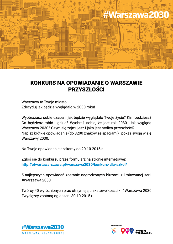 KONKURS NA OPOWIADANIE O WARSZAWIE PRZYSZŁOŚCI Warszawa to Twoje miasto! Zdecyduj jak będzie wyglądało w 2030 roku! Wyobrażasz sobie czasem jak będzie wyglądało Twoje życie? Kim będziesz? Co będziesz robić i gdzie? Wyobraź sobie, że jest rok 2030. Jak wygląda Warszawa 2030? Czym się zajmujesz i jaka jest stolica przyszłości? Napisz krótkie opowiadanie (do 3200 znaków ze spacjami) i pokaż swoją wizję Warszawy 2030. Na Twoje opowiadanie czekamy do 20.10.2015 r. Zgłoś się do konkursu przez formularz na stronie internetowej: http://otwartawarszawa.pl/warszawa2030/konkurs-dla-szkol/ 5 najlepszych opowiadań zostanie nagrodzonych bluzami z limitowanej serii #Warszawa 2030. Twórcy 40 wyróżnionych prac otrzymają unikatowe koszulki #Warszawa 2030. Zwycięzcy zostaną ogłoszeni 30.10.2015 r.