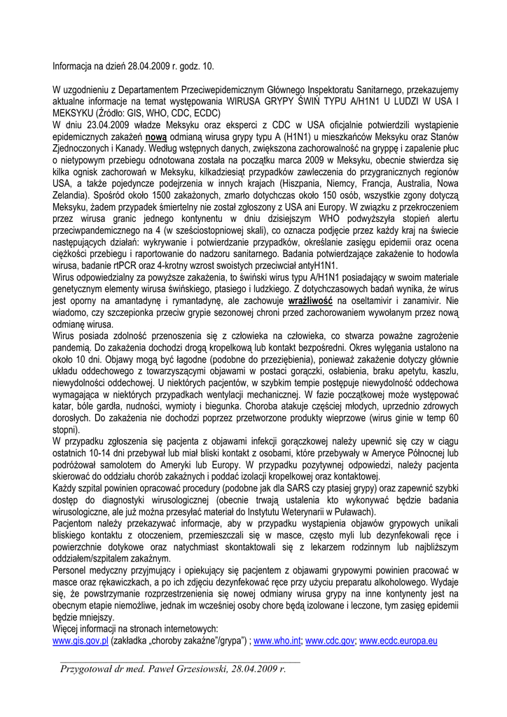 Informacja na dzień 28.04.2009 r. godz. 10. W uzgodnieniu z Departamentem Przeciwepidemicznym Głównego Inspektoratu Sanitarnego, przekazujemy aktualne informacje na temat występowania WIRUSA GRYPY ŚWIŃ TYPU A/H1N1 U LUDZI W USA I MEKSYKU (Źródło: GIS, WHO, CDC, ECDC) W dniu 23.04.2009 władze Meksyku oraz eksperci z CDC w USA oficjalnie potwierdzili wystąpienie epidemicznych zakażeń nową odmianą wirusa grypy typu A (H1N1) u mieszkańców Meksyku oraz Stanów Zjednoczonych i Kanady. Według wstępnych danych, zwiększona zachorowalność na gryppę i zapalenie płuc o nietypowym przebiegu odnotowana została na początku marca 2009 w Meksyku, obecnie stwierdza się kilka ognisk zachorowań w Meksyku, kilkadziesiąt przypadków zawleczenia do przygranicznych regionów USA, a także pojedyncze podejrzenia w innych krajach (Hiszpania, Niemcy, Francja, Australia, Nowa Zelandia). Spośród około 1500 zakażonych, zmarło dotychczas około 150 osób, wszystkie zgony dotyczą Meksyku, żadem przypadek śmiertelny nie został zgłoszony z USA ani Europy. W związku z przekroczeniem przez wirusa granic jednego kontynentu w dniu dzisiejszym WHO podwyższyła stopień alertu przeciwpandemicznego na 4 (w sześciostopniowej skali), co oznacza podjęcie przez każdy kraj na świecie następujących działań: wykrywanie i potwierdzanie przypadków, określanie zasięgu epidemii oraz ocena ciężkości przebiegu i raportowanie do nadzoru sanitarnego. Badania potwierdzające zakażenie to hodowla wirusa, badanie rtPCR oraz 4-krotny wzrost swoistych przeciwciał antyH1N1. Wirus odpowiedzialny za powyższe zakażenia, to świński wirus typu A/H1N1 posiadający w swoim materiale genetycznym elementy wirusa świńskiego, ptasiego i ludzkiego. Z dotychczasowych badań wynika, że wirus jest oporny na amantadynę i rymantadynę, ale zachowuje wrażliwość na oseltamivir i zanamivir. Nie wiadomo, czy szczepionka przeciw grypie sezonowej chroni przed zachorowaniem wywołanym przez nową odmianę wirusa. Wirus posiada zdolność przenoszenia się z człowieka na człowieka, co stwarza poważne zagrożenie pandemią. Do zakażenia dochodzi drogą kropelkową lub kontakt bezpośredni. Okres wylęgania ustalono na około 10 dni. Objawy mogą być łagodne (podobne do przeziębienia), ponieważ zakażenie dotyczy głównie układu oddechowego z towarzyszącymi objawami w postaci gorączki, osłabienia, braku apetytu, kaszlu, niewydolności oddechowej. U niektórych pacjentów, w szybkim tempie postępuje niewydolność oddechowa wymagająca w niektórych przypadkach wentylacji mechanicznej. W fazie początkowej może występować katar, bóle gardła, nudności, wymioty i biegunka. Choroba atakuje częściej młodych, uprzednio zdrowych dorosłych. Do zakażenia nie dochodzi poprzez przetworzone produkty wieprzowe (wirus ginie w temp 60 stopni). W przypadku zgłoszenia się pacjenta z objawami infekcji gorączkowej należy upewnić się czy w ciągu ostatnich 10-14 dni przebywał lub miał bliski kontakt z osobami, które przebywały w Ameryce Północnej lub podróżował samolotem do Ameryki lub Europy. W przypadku pozytywnej odpowiedzi, należy pacjenta skierować do oddziału chorób zakaźnych i poddać izolacji kropelkowej oraz kontaktowej. Każdy szpital powinien opracować procedury (podobne jak dla SARS czy ptasiej grypy) oraz zapewnić szybki dostęp do diagnostyki wirusologicznej (obecnie trwają ustalenia kto wykonywać będzie badania wirusologiczne, ale już można przesyłać materiał do Instytutu Weterynarii w Puławach). Pacjentom należy przekazywać informacje, aby w przypadku wystąpienia objawów grypowych unikali bliskiego kontaktu z otoczeniem, przemieszczali się w masce, często myli lub dezynfekowali ręce i powierzchnie dotykowe oraz natychmiast skontaktowali się z lekarzem rodzinnym lub najbliższym oddziałem/szpitalem zakaźnym. Personel medyczny przyjmujący i opiekujący się pacjentem z objawami grypowymi powinien pracować w masce oraz rękawiczkach, a po ich zdjęciu dezynfekować ręce przy użyciu preparatu alkoholowego. Wydaje się, że powstrzymanie rozprzestrzenienia się nowej odmiany wirusa grypy na inne kontynenty jest na obecnym etapie niemożliwe, jednak im wcześniej osoby chore będą izolowane i leczone, tym zasięg epidemii będzie mniejszy. Więcej informacji na stronach internetowych: www.gis.gov.pl (zakładka „choroby zakaźne”/grypa”) ; www.who.int; www.cdc.gov; www.ecdc.europa.eu _______________________________________________ Przygotował dr med. Paweł Grzesiowski, 28.04.2009 r.