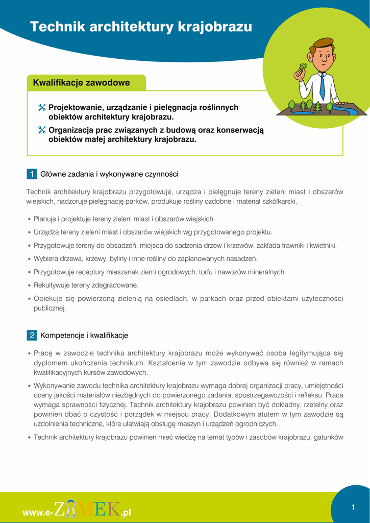 Technik architektury krajobrazu Kwalifikacje zawodowe Projektowanie, urządzanie i pielęgnacja roślinnych obiektów architektury krajobrazu. Organizacja prac związanych z budową oraz konserwacją obiektów małej architektury krajobrazu. 1 Główne zadania i wykonywane czynności Technik architektury krajobrazu przygotowuje, urządza i pielęgnuje tereny zieleni miast i obszarów wiejskich, nadzoruje pielęgnację parków, produkuje rośliny ozdobne i materiał szkółkarski. Planuje i projektuje tereny zieleni miast i obszarów wiejskich. Urządza tereny zieleni miast i obszarów wiejskich wg przygotowanego projektu. Przygotowuje tereny do obsadzeń, miejsca do sadzenia drzew i krzewów, zakłada trawniki i kwietniki. Wybiera drzewa, krzewy, byliny i inne rośliny do zaplanowanych nasadzeń. Przygotowuje receptury mieszanek ziemi ogrodowych, torfu i nawozów mineralnych. Rekultywuje tereny zdegradowane. Opiekuje się powierzoną zielenią na osiedlach, w parkach oraz przed obiektami użyteczności publicznej. 2 Kompetencje i kwalifikacje Pracę w zawodzie technika architektury krajobrazu może wykonywać osoba legitymująca się dyplomem ukończenia technikum. Kształcenie w tym zawodzie odbywa się również w ramach kwalifikacyjnych kursów zawodowych. Wykonywanie zawodu technika architektury krajobrazu wymaga dobrej organizacji pracy, umiejętności oceny jakości materiałów niezbędnych do powierzonego zadania, spostrzegawczości i refleksu. Praca wymaga sprawności fizycznej. Technik architektury krajobrazu powinien być dokładny, rzetelny oraz powinien dbać o czystość i porządek w miejscu pracy. Dodatkowym atutem w tym zawodzie są uzdolnienia techniczne, które ułatwiają obsługę maszyn i urządzeń ogrodniczych. Technik architektury krajobrazu powinien mieć wiedzę na temat typów i zasobów krajobrazu, gatunków 1 roślin ozdobnych, typów i rodzajów gleb, sprzętu i maszyn do uprawy i pielęgnacji roślin ozdobnych, rodzajów zabiegów uprawowych, nawozów i ich wpływu na glebę i rośliny, chorób i szkodników roślin ozdobnych, zabiegów stosowanych w pielęgnacji terenów zieleni. Powinien rozróżniać rodzaje dokumentacji dotyczącej budowy obiektów architektury krajobrazu, rodzaje obiektów terenów zieleni, rodzaje materiałów budowlanych oraz znać ich zastosowanie w obiektach małej architektury. Powinien też rozróżniać sprzęt geodezyjny stosowany do pomiarów w terenie. Aby wykonywać zawód technika architektury krajobrazu, trzeba mieć doświadczenie w opracowywaniu projektów obiektów terenów zieleni, urządzaniu i pielęgnacji terenów zieleni i zadrzewień, urządzaniu i konserwacji obiektów małej architektury krajobrazu. Technik architektury krajobrazu powinien umieć prowadzić ciągnik rolniczy z przyczepą, a także posługiwać się dokumentacją projektową w poszczególnych etapach realizacji i konserwacji terenów zieleni. 3 Środowisko i charakter pracy Miejscem pracy technika architektury krajobrazu mogą być parki, zieleńce, skwery oraz inne obszary przeznaczone do zagospodarowania w przestrzeni publicznej i prywatnej. Może być zatrudniany w firmach zajmujących się zakładaniem i pielęgnowaniem terenów zieleni lub prowadzić własną działalność gospodarczą w tym zakresie. W zawodzie technika architektury krajobrazu zagrożenie dla zdrowia i życia stwarzają: ruch uliczny, hałas, spaliny, drgania, zapylenie, zmienne warunki atmosferyczne, prace na wysokości, praca w wymuszonej, pochylonej pozycji ciała oraz kontakt z chemicznymi środkami ochrony roślin. Praca odbywa się w systemie jedno- bądź dwuzmianowym, charakteryzuje się sezonowością z nasileniem prac w okresie wiosennym i jesiennym oraz dużą zmiennością warunków. Praca jest nadzorowana, czynności najczęściej są wykonywane samodzielnie. 2