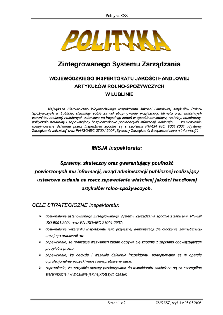 Polityka ZSZ Zintegrowanego Systemu Zarządzania WOJEWÓDZKIEGO INSPEKTORATU JAKOŚCI HANDLOWEJ ARTYKUŁÓW ROLNO-SPOŻYWCZYCH W LUBLINIE Najwyższe Kierownictwo Wojewódzkiego Inspektoratu Jakości Handlowej Artykułów RolnoSpożywczych w Lublinie, stawiając sobie za cel utrzymywanie przyjaznego klimatu oraz właściwych warunków realizacji nałożonych ustawowo na Inspekcję zadań w sposób zawodowy, rzetelny, bezstronny, politycznie neutralny i zapewniający bezpieczeństwo posiadanych informacji, deklaruje, że wszystkie podejmowane działania przez Inspektorat zgodne są z zapisami PN-EN ISO 9001:2001 „Systemy Zarządzania Jakością” oraz PN-ISO/IEC 27001:2007 „Systemy Zarządzania Bezpieczeństwem Informacji”. MISJA Inspektoratu: Sprawny, skuteczny oraz gwarantujący poufność powierzonych mu informacji, urząd administracji publicznej realizujący ustawowe zadania na rzecz zapewnienia właściwej jakości handlowej artykułów rolno-spożywczych. CELE STRATEGICZNE Inspektoratu: doskonalenie ustanowionego Zintegrowanego Systemu Zarządzania zgodnie z zapisami PN-EN ISO 9001:2001 oraz PN-ISO//IEC 27001:2007; doskonalenie wizerunku Inspektoratu jako przyjaznej administracji dla otoczenia zewnętrznego oraz jego pracowników; zapewnienie, że realizacja wszystkich zadań odbywa się zgodnie z zapisami obowiązujących przepisów prawa; zapewnienie, że decyzje i wszelkie działanie Inspektoratu podejmowane są w oparciu o profesjonalnie pozyskiwane i interpretowane dane; zapewnienie, że wszystkie sprawy przekazywane do Inspektoratu załatwiane są ze szczególną starannością i w możliwie jak najkrótszym czasie; Strona 1 z 2 Z8/KZSZ, wyd.1 z 05.05.2008 Polityka ZSZ zapewnienie poufności informacji w sytuacjach, kiedy powierzone Inspektoratowi dane nie są danymi powszechnie dostępnymi; zapewnienie dostępności do informacji, które Inspektorat ma obowiązek udostępnić w ramach wykonywania swoich zadań; zapewnienie integralności informacji gwarantujące, że żadne przetwarzane dane nie zostaną zmienione w sposób niezgodny z przyjętymi w Inspektoracie zasadami; zapewnienie, że wszyscy pracownicy są świadomi swojej odpowiedzialności w zakresie ochrony posiadanych informacji; zapewnienie, że wdrożone zasady wynikające z zapisów PN-ISO/IEC 27001:2007 zminimalizują ryzyko utraty informacji lub niewłaściwego ich udostępnienia; zapewnienie właściwego szacowania ryzyka dla wszystkich informacji zarządzanych przez Inspektorat; zapewnienie, że każdy pracownik pełen świadomej odpowiedzialności, postępuje zgodnie z przyjętymi zasadami i minimalizuje zagrożenia wynikające z błędów ludzkich. Misję oraz cele strategiczne Inspektorat może osiągnąć poprzez: aktywny udział wszystkich pracowników Inspektoratu w doskonaleniu organizacji Inspektoratu; współpracę wszystkich pracowników w zakresie rozwiązywania problemów i zapobiegania przyczynom powstawania nieprawidłowości; tworzenie partnerskich relacji pomiędzy Inspektoratem a wszystkimi podmiotami tworzącymi i realizującymi cele polityki rządu; dbałość o ciągłe doskonalenie komunikacji pomiędzy Klientem a Inspektoratem, jak również pomiędzy pracownikami Inspektoratu; ciągłe kształtowanie przekonań, że za jakość i wizerunek Inspekcji odpowiedzialny jest każdy pracownik – na swoim stanowisku pracy i przy każdym kontakcie z Klientem; systematyczne szkolenie załogi w zakresie kwalifikacji zawodowych; ciągłe doskonalenie wprowadzonych, skutecznych zasad ochrony informacji oraz zarządzania dostępem do nich; ciągłe doskonalenie działań na wypadek naruszenia bezpieczeństwa informacji; utrzymywanie wysokiego poziomu jakości przetwarzania informacji; ciągłe doskonalenie metodyki szacowania ryzyka dla informacji zarządzanych przez Inspektorat; stała edukacja użytkowników systemu informacyjnego. Polityka ZSZ została zatwierdzona w dniu 06 lipca 2007 r. przez Lubelskiego Wojewódzkiego Inspektora i stanowi załącznik do Zarządzenia Nr 4/SZJ/07 Strona 2 z 2 Z8/KZSZ, wyd.1 z 05.05.2008