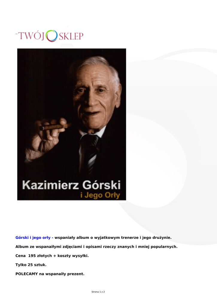 Górski i jego orły - wspaniały album o wyjatkowym trenerze i jego drużynie. Album ze wspanaiłymi zdjęciami i opisami rzeczy znanych i mniej popularnych. Cena 195 złotych + koszty wysyłki. Tylko 25 sztuk. POLECAMY na wspanaiły prezent. Strona 1 z 2 Strona 2 z 2