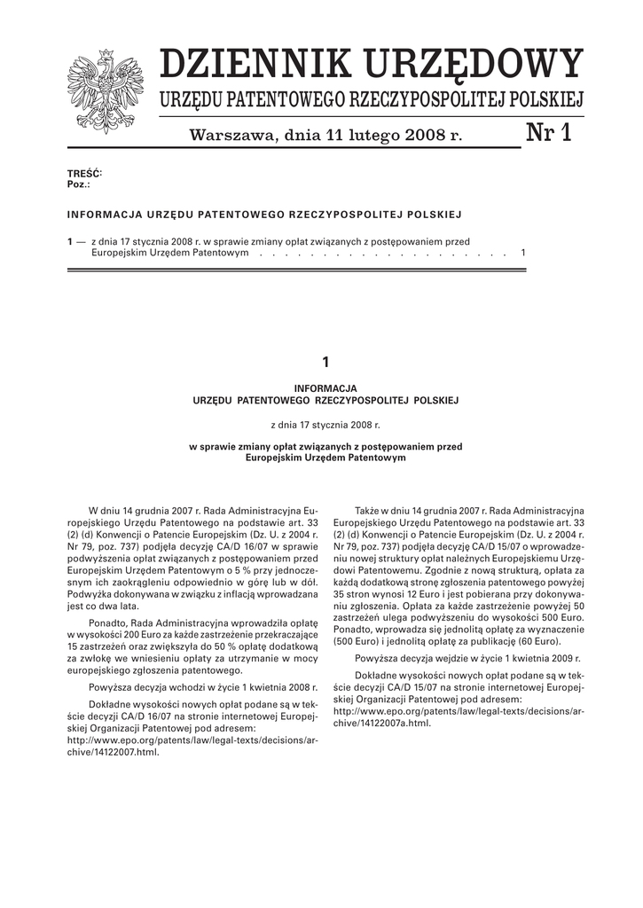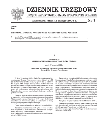 DZIENNIK URZĘDOWY URZĘDU PATENTOWEGO RZECZYPOSPOLITEJ POLSKIEJ Nr 1 Warszawa, dnia 11 lutego 2008 r. TREŚĆ : Poz.: I N F O R M AC JA U R Z Ę D U PAT E N T O W E G O R Z E C Z Y P O S P O L I T E J P O L S K I E J 1 — z dnia 17 stycznia 2008 r. w sprawie zmiany opłat związanych z postępowaniem przed Europejskim Urzędem Patentowym . . . . . . . . . . . . . . . . . . . . 1 1 INFORMACJA URZĘDU PATENTOWEGO RZECZYPOSPOLITEJ POLSKIEJ z dnia 17 stycznia 2008 r. w sprawie zmiany opłat związanych z postępowaniem przed Europejskim Urzędem Patentowym W dniu 14 grudnia 2007 r. Rada Administracyjna Europejskiego Urzędu Patentowego na podstawie art. 33 (2) (d) Konwencji o Patencie Europejskim (Dz. U. z 2004 r. Nr 79, poz. 737) podjęła decyzję CA/D 16/07 w sprawie podwyższenia opłat związanych z postępowaniem przed Europejskim Urzędem Patentowym o 5 % przy jednoczesnym ich zaokrągleniu odpowiednio w górę lub w dół. Podwyżka dokonywana w związku z inflacją wprowadzana jest co dwa lata. Ponadto, Rada Administracyjna wprowadziła opłatę w wysokości 200 Euro za każde zastrzeżenie przekraczające 15 zastrzeżeń oraz zwiększyła do 50 % opłatę dodatkową za zwłokę we wniesieniu opłaty za utrzymanie w mocy europejskiego zgłoszenia patentowego. Powyższa decyzja wchodzi w życie 1 kwietnia 2008 r. Dokładne wysokości nowych opłat podane są w tekście decyzji CA/D 16/07 na stronie internetowej Europejskiej Organizacji Patentowej pod adresem: http://www.epo.org/patents/law/legal-texts/decisions/archive/14122007.html. Także w dniu 14 grudnia 2007 r. Rada Administracyjna Europejskiego Urzędu Patentowego na podstawie art. 33 (2) (d) Konwencji o Patencie Europejskim (Dz. U. z 2004 r. Nr 79, poz. 737) podjęła decyzję CA/D 15/07 o wprowadzeniu nowej struktury opłat należnych Europejskiemu Urzędowi Patentowemu. Zgodnie z nową strukturą, opłata za każdą dodatkową stronę zgłoszenia patentowego powyżej 35 stron wynosi 12 Euro i jest pobierana przy dokonywaniu zgłoszenia. Opłata za każde zastrzeżenie powyżej 50 zastrzeżeń ulega podwyższeniu do wysokości 500 Euro. Ponadto, wprowadza się jednolitą opłatę za wyznaczenie (500 Euro) i jednolitą opłatę za publikację (60 Euro). Powyższa decyzja wejdzie w życie 1 kwietnia 2009 r. Dokładne wysokości nowych opłat podane są w tekście decyzji CA/D 15/07 na stronie internetowej Europejskiej Organizacji Patentowej pod adresem: http://www.epo.org/patents/law/legal-texts/decisions/archive/14122007a.html. –2– Aktualne i poprzednio wydane egzemplarze można nabyć w Departamencie Wydawnictw, Al. Niepodległości 188/192, 00-950 Warszawa Zamówienia na prenumeratę należy składać do Departamentu Wydawnictw, Al. Niepodległości 188, 00-950 Warszawa, tel. (0 22) 579 01 07, (0 22) 579 02 24 fax. (0 22) 579 04 55, e-mail: [email protected] Wydawca: Urząd Patentowy Rzeczypospolitej Polskiej Redakcja: Urząd Patentowy RP, Al. Niepodległości 188/192, 00-950 Warszawa Gabinet Prezesa, tel. (0 22) 579 01 29, fax. (0 22) 579 04 37, e-mail: [email protected] Skład, druk i rozpowszechnianie: Urząd Patentowy RP, Al. Niepodległości 188/192, 00-950 Warszawa Departament Wydawnictw tel. (0 22) 579 01 07, (0 22) 579 02 24, fax. (0 22) 579 04 55, e-mail: [email protected] Dziennik Urzędowy jest wyłożony do wglądu w Bibliotece Urzędu Patentowego Rzeczypospolitej Polskiej w godzinach pracy Urzędu. Tłoczono z polecenia Prezesa Urzędu Patentowego Rzeczypospolitej Polskiej w Departamencie Wydawnictw Zam.: 54/2008 ISSN 1643-0832 Cena 1,07 zł (w tym 7% VAT)