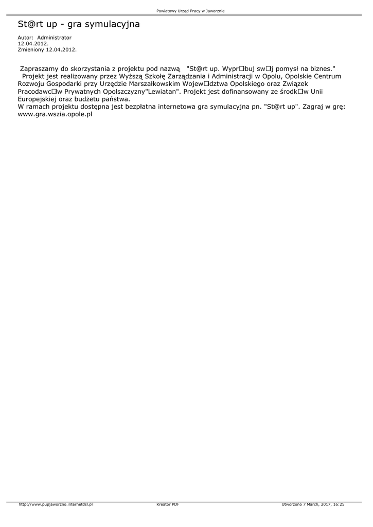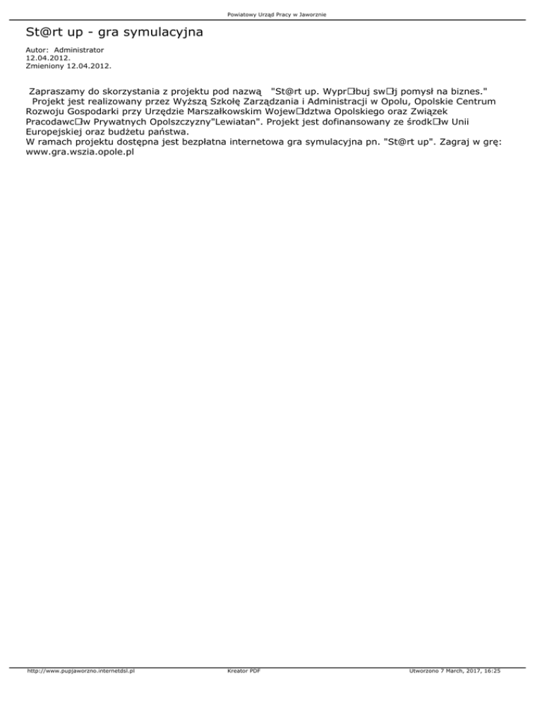 Powiatowy Urząd Pracy w Jaworznie St@rt up - gra symulacyjna Autor: Administrator 12.04.2012. Zmieniony 12.04.2012. Zapraszamy do skorzystania z projektu pod nazwą "St@rt up. WyprÃłbuj swÃłj pomysł na biznes." Projekt jest realizowany przez Wyższą Szkołę Zarządzania i Administracji w Opolu, Opolskie Centrum Rozwoju Gospodarki przy Urzędzie Marszałkowskim WojewÃłdztwa Opolskiego oraz Związek PracodawcÃłw Prywatnych Opolszczyzny"Lewiatan". Projekt jest dofinansowany ze środkÃłw Unii Europejskiej oraz budżetu państwa. W ramach projektu dostępna jest bezpłatna internetowa gra symulacyjna pn. "St@rt up". Zagraj w grę: www.gra.wszia.opole.pl http://www.pupjaworzno.internetdsl.pl Kreator PDF Utworzono 7 March, 2017, 16:25