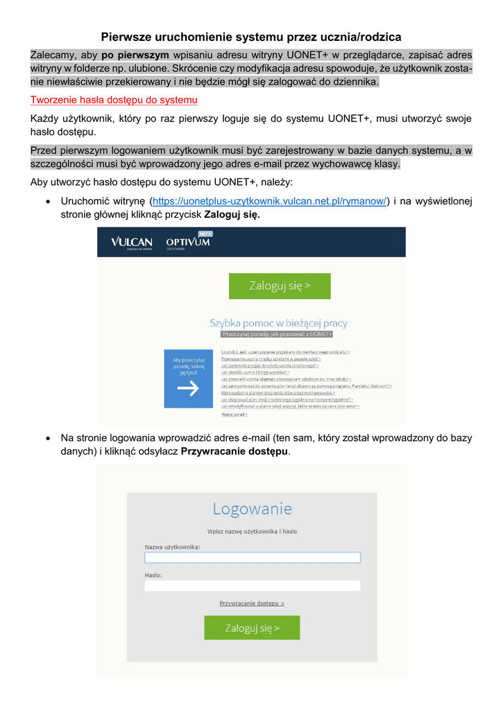 Pierwsze uruchomienie systemu przez ucznia/rodzica Zalecamy, aby po pierwszym wpisaniu adresu witryny UONET+ w przeglądarce, zapisać adres witryny w folderze np. ulubione. Skrócenie czy modyfikacja adresu spowoduje, że użytkownik zostanie niewłaściwie przekierowany i nie będzie mógł się zalogować do dziennika. Tworzenie hasła dostępu do systemu Każdy użytkownik, który po raz pierwszy loguje się do systemu UONET+, musi utworzyć swoje hasło dostępu. Przed pierwszym logowaniem użytkownik musi być zarejestrowany w bazie danych systemu, a w szczególności musi być wprowadzony jego adres e-mail przez wychowawcę klasy. Aby utworzyć hasło dostępu do systemu UONET+, należy: Uruchomić witrynę (https://uonetplus-uzytkownik.vulcan.net.pl/rymanow/) i na wyświetlonej stronie głównej kliknąć przycisk Zaloguj się. Na stronie logowania wprowadzić adres e-mail (ten sam, który został wprowadzony do bazy danych) i kliknąć odsyłacz Przywracanie dostępu. Na stronie Przywracanie dostępu dokonać autoryzacji operacji poprzez przepisanie liter z obrazka. Jeśli tekst jest nieczytelny, można wygenerować następny za pomocą ikony Zmień próbkę. Następnie wprowadzić adres email i kliknąć przycisk Wyślij wiadomość Wyświetli się strona Podsumowanie operacji informująca, że na zapisany w systemie adres wysłano wiadomość, zawierającą dalsze instrukcje. Odebrać wiadomość, przeczytać ją i kliknąć odsyłacz do strony, na której możliwe będzie wprowadzenie hasła dostępu. Na stronie Aktywacja konta dokonać ponownie autoryzacji operacji, wprowadzić hasło w polach Nowe hasło i Powtórz nowe hasło i kliknąć przycisk Ustaw nowe hasło. Wyświetli się strona Podsumowanie operacji zawierająca informację, że hasło zostało zmienione. Zamknąć okno przeglądarki. Po utworzeniu hasła dostępu należy ponownie uruchomić witrynę systemu i zalogować się. Wówczas nastąpi przekierowanie użytkownika na jego stronę startową, która zawiera komplet informacji kierowanych do niego. Ze strony startowej użytkownik może również uruchamiać moduły, do których ma dostęp. Ustalanie nowego hasła Po 30 dniach ustalone hasło wygasa i staje się nieaktywne. Aby zalogować się do systemu należy ustalić nowe unikalne hasło: Na stronie logowania wprowadzić adres e-mail (ten sam, który został wprowadzony do bazy danych) i kliknąć odsyłacz Przywracanie dostępu. W oknie Przywracanie dostępu w polu Hasło wprowadzić stare hasło. A następnie wpisać nowe hasło w polach Nowe hasło i Powtórz i kliknąć przycisk Ustaw nowe hasło. Nowe hasło zostało ustalone.