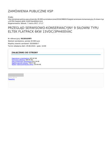 ZAMÓWIENIA PUBLICZNE KSP Źródło: http://przetargi.policja.waw.pl/zam/do-30-000-euro/zakonczone/2016/39800,Przeglad-serwisowo-konserwacyjny-9-silowni-typ u-ELTEK-Flatpack-6kW-15VDC3ph400VA.html Wygenerowano: Wtorek, 7 marca 2017, 17:17 PRZEGLĄD SERWISOWO-KONSERWACYJNY 9 SIŁOWNI TYPU ELTEK FLATPACK 6KW 15VDC/3PH400VAC Nr referencyjny: 93/2016/WTI Wartość zamówienia: poniżej 30 000 euro Wspólny słownik zamówień: 50330000-7 Termin składania ofert: 29.08.2016 r. godz. 14:00 ZAŁĄCZNIKI DO STRONY Ogłoszenie o zamówieniu 402.62 KB Formularz ofertowy 280.95 KB Opis przedmiotu zamówienia 824.36 KB Ogólne warunki umowy 746.07 KB Wybór najkorzystniejszej oferty 318.94 KB Ocena: 0/5 (0) Tweetnij