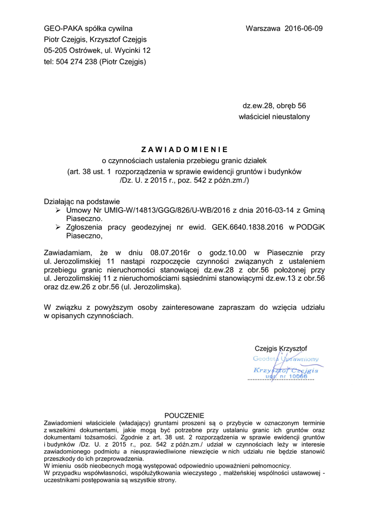 GEO-PAKA spółka cywilna Piotr Czejgis, Krzysztof Czejgis 05-205 Ostrówek, ul. Wycinki 12 tel: 504 274 238 (Piotr Czejgis) Warszawa 2016-06-09 dz.ew.28, obręb 56 właściciel nieustalony ZAWIADOMIENIE o czynnościach ustalenia przebiegu granic działek (art. 38 ust. 1 rozporządzenia w sprawie ewidencji gruntów i budynków /Dz. U. z 2015 r., poz. 542 z późn.zm./) Działając na podstawie Umowy Nr UMIG-W/14813/GGG/826/U-WB/2016 z dnia 2016-03-14 z Gminą Piaseczno. Zgłoszenia pracy geodezyjnej nr ewid. GEK.6640.1838.2016 w PODGiK Piaseczno, Zawiadamiam, że w dniu 08.07.2016r o godz.10.00 w Piasecznie przy ul. Jerozolimskiej 11 nastąpi rozpoczęcie czynności związanych z ustaleniem przebiegu granic nieruchomości stanowiącej dz.ew.28 z obr.56 położonej przy ul. Jerozolimskiej 11 z nieruchomościami sąsiednimi stanowiącymi dz.ew.13 z obr.56 oraz dz.ew.26 z obr.56 (ul. Jerozolimska). W związku z powyższym osoby zainteresowane zapraszam do wzięcia udziału w opisanych czynnościach. Czejgis Krzysztof ....................................... POUCZENIE Zawiadomieni właściciele (władający) gruntami proszeni są o przybycie w oznaczonym terminie z wszelkimi dokumentami, jakie mogą być potrzebne przy ustalaniu granic ich gruntów oraz dokumentami tożsamości. Zgodnie z art. 38 ust. 2 rozporządzenia w sprawie ewidencji gruntów i budynków /Dz. U. z 2015 r., poz. 542 z późn.zm./ udział w czynnościach leży w interesie zawiadomionego podmiotu a nieusprawiedliwione niewzięcie w nich udziału nie będzie stanowić przeszkody do ich przeprowadzenia. W imieniu osób nieobecnych mogą występować odpowiednio upoważnieni pełnomocnicy. W przypadku współwłasności, współużytkowania wieczystego , małżeńskiej wspólności ustawowej uczestnikami postępowania są wszystkie strony.