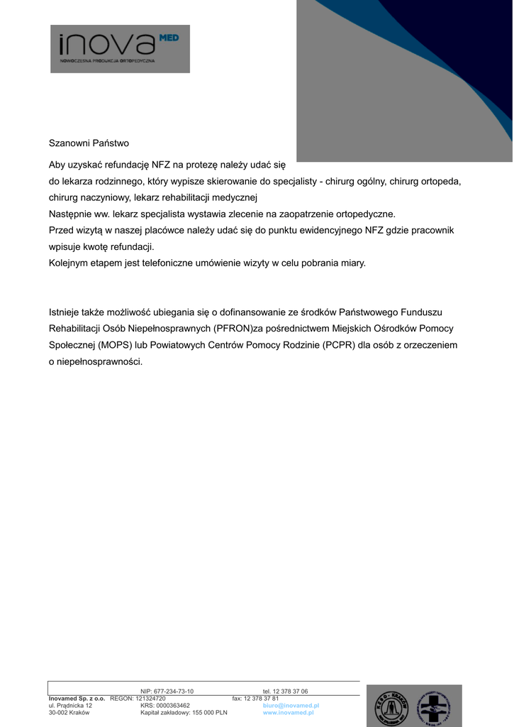 Szanowni Państwo Aby uzyskać refundację NFZ na protezę należy udać się do lekarza rodzinnego, który wypisze skierowanie do specjalisty - chirurg ogólny, chirurg ortopeda, chirurg naczyniowy, lekarz rehabilitacji medycznej Następnie ww. lekarz specjalista wystawia zlecenie na zaopatrzenie ortopedyczne. Przed wizytą w naszej placówce należy udać się do punktu ewidencyjnego NFZ gdzie pracownik wpisuje kwotę refundacji. Kolejnym etapem jest telefoniczne umówienie wizyty w celu pobrania miary. Istnieje także możliwość ubiegania się o dofinansowanie ze środków Państwowego Funduszu Rehabilitacji Osób Niepełnosprawnych (PFRON)za pośrednictwem Miejskich Ośrodków Pomocy Społecznej (MOPS) lub Powiatowych Centrów Pomocy Rodzinie (PCPR) dla osób z orzeczeniem o niepełnosprawności. NIP: 677-234-73-10 tel. 12 378 37 06 Inovamed Sp. z o.o. REGON: 121324720 fax: 12 378 37 81 ul. Prądnicka 12 KRS: 0000363462 [email protected] 30-002 Kraków Kapitał zakładowy: 155 000 PLN www.inovamed.pl