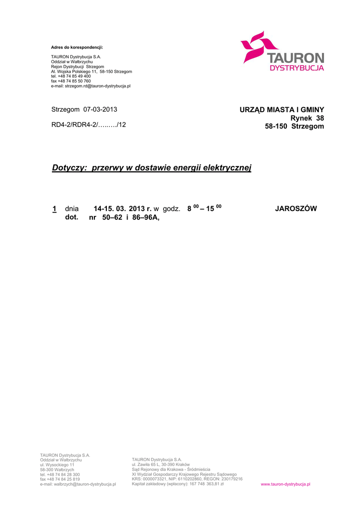 Adres do korespondencji: TAURON Dystrybucja S.A. Oddział w Wałbrzychu Rejon Dystrybucji Strzegom Al. Wojska Polskiego 11, 58-150 Strzegom tel. +48 74 85 49 400 fax +48 74 85 50 760 e-mail: [email protected] Strzegom 07-03-2013 URZĄD MIASTA I GMINY Rynek 38 58-150 Strzegom RD4-2/RDR4-2/…..…./12 Dotyczy: przerwy w dostawie energii elektrycznej 1 dnia dot. 14-15. 03. 2013 r. w godz. 8 00 – 15 00 nr 50–62 i 86–96A, TAURON Dystrybucja S.A. Oddział w Wałbrzychu ul. Wysockiego 11 58-300 Wałbrzych tel. +48 74 84 28 300 fax +48 74 84 25 819 e-mail: [email protected] TAURON Dystrybucja S.A. ul. Zawiła 65 L, 30-390 Kraków Sąd Rejonowy dla Krakowa - Śródmieścia XI Wydział Gospodarczy Krajowego Rejestru Sądowego KRS: 0000073321, NIP: 6110202860, REGON: 230179216 Kapitał zakładowy (wpłacony): 167 748 363,81 zł JAROSZÓW www.tauron-dystrybucja.pl Adres do korespondencji: TAURON Dystrybucja S.A. Oddział w Wałbrzychu Rejon Dystrybucji Strzegom Al. Wojska Polskiego 11, 58-150 Strzegom tel. +48 74 85 49 400 fax +48 74 85 50 760 e-mail: [email protected] Strzegom 01-03-2013 RD4-2/RDR4-2/…..…./12 URZĄD MIASTA I GMINY Rynek 38 58-150 Strzegom Dotyczy: przerwy w dostawie energii elektrycznej 1 dnia dot. 8. 03. 2013 r. w godz. 8 00 – 15 00 STRZEGOM ul. Brzegowa 1 do 11, Malinowa, Świdnicka 47 do 49 i 48 do 52, Olszowa 1 do 39 i 2 do 38, Lipowa, Kwiatowa, Wrzosowa 1 do 19 i 2 do 20, Polna, Starzyńskiego 1 do 27 i 2 do 20, Słoneczna 1 do 7, Brzozowa 1 do 15 i 2 do 70, Limanowskiego, TAURON Dystrybucja S.A. Oddział w Wałbrzychu ul. Wysockiego 11 58-300 Wałbrzych tel. +48 74 84 28 300 fax +48 74 84 25 819 e-mail: [email protected] TAURON Dystrybucja S.A. ul. Zawiła 65 L, 30-390 Kraków Sąd Rejonowy dla Krakowa - Śródmieścia XI Wydział Gospodarczy Krajowego Rejestru Sądowego KRS: 0000073321, NIP: 6110202860, REGON: 230179216 Kapitał zakładowy (wpłacony): 167 748 363,81 zł www.tauron-dystrybucja.pl Adres do korespondencji: TAURON Dystrybucja S.A. Oddział w Wałbrzychu Rejon Dystrybucji Strzegom Al. Wojska Polskiego 11, 58-150 Strzegom tel. +48 74 85 49 400 fax +48 74 85 50 760 e-mail: [email protected] Strzegom 01-03-2013 URZĄD MIASTA I GMINY Rynek 38 58-150 Strzegom RD4-2/RDR4-2/…..…./12 Dotyczy: przerwy w dostawie energii elektrycznej 1 dnia dot. 11. 03. 2013 r. w godz. 8 00 – 15 00 ul. Szarych Szeregów 16, TAURON Dystrybucja S.A. Oddział w Wałbrzychu ul. Wysockiego 11 58-300 Wałbrzych tel. +48 74 84 28 300 fax +48 74 84 25 819 e-mail: [email protected] TAURON Dystrybucja S.A. ul. Zawiła 65 L, 30-390 Kraków Sąd Rejonowy dla Krakowa - Śródmieścia XI Wydział Gospodarczy Krajowego Rejestru Sądowego KRS: 0000073321, NIP: 6110202860, REGON: 230179216 Kapitał zakładowy (wpłacony): 167 748 363,81 zł STRZEGOM www.tauron-dystrybucja.pl