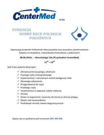 oraz FUNDACJA DOBRE RĘCE POLSKICH POŁOŻNYCH Zapraszają studentki Politechniki Warszawskiej oraz wszystkie zainteresowane kobiety na bezpłatne, indywidualne konsultacje z położnymi! 08.06.2016r. – Waryńskiego 10a (Przychodnia CenterMed) 1100 – 1400 Jeśli masz pytania dotyczące:            Zdrowia prokreacyjnego, płodności Fizjologii cyklu miesiączkowego Suplementacji i naturalnych metod pielęgnacji ciała Zdrowego odżywiania Przygotowania do ciąży Przebiegu ciąży Uczestnictwa w zajęciach szkoły rodzenia Porodu Zmian w organizmie i powrotu do formy w okresie połogu Opieki nad noworodkiem Profilaktyki chorób, badań diagnostycznych Zapisz się na spotkanie pod numerem 801 404 402