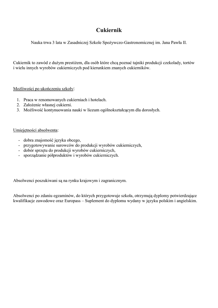 Cukiernik Nauka trwa 3 lata w Zasadniczej Szkole Spożywczo-Gastronomicznej im. Jana Pawła II. Cukiernik to zawód z dużym prestiżem, dla osób które chcą poznać tajniki produkcji czekolady, tortów i wielu innych wyrobów cukierniczych pod kierunkiem znanych cukierników. Możliwości po ukończeniu szkoły: 1. Praca w renomowanych cukierniach i hotelach. 2. Założenie własnej cukierni. 3. Możliwość kontynuowania nauki w liceum ogólnokształcącym dla dorosłych. Umiejętności absolwenta: - dobra znajomość języka obcego, przygotowywanie surowców do produkcji wyrobów cukierniczych, dobór sprzętu do produkcji wyrobów cukierniczych, sporządzanie półproduktów i wyrobów cukierniczych. Absolwenci poszukiwani są na rynku krajowym i zagranicznym. Absolwenci po zdaniu egzaminów, do których przygotowuje szkoła, otrzymują dyplomy potwierdzające kwalifikacje zawodowe oraz Europass – Suplement do dyplomu wydany w języku polskim i angielskim.