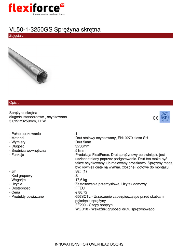 VL50-1-3250GS Sprężyna skrętna Zdjęcia : Opis : Sprężyna skrętna długości standardowe , ocynkowana 5.0x51x3250mm, LHW - Pełne opakowanie - Materiał - Wymiary - Długość - Średnica wewnętrzna - Funkcja - Jm - Kod grupowy - Waga/jm - Użycie - Dostępność - Cena - Produkty powiązane :1 : Drut stalowy ocynkowany, EN10270 klasa SH : Drut 5mm : 3250mm : 51mm : Produkcja FlexiForce. Drut sprężynowy po zwinięciu jest uszlachetniany poprzez podgrzewanie. Drut ten może być także ocynkowany lub malowany proszkowo. Sprężyny mogą być również cięte na wymiar, złożone i gotowe do montażu. : Szt. (1) :S : 17,6 kg : Zastosowania przemysłowe, Użytek domowy : FFEU : € 86,72 : 656SCTL - Urządzenie zabezpieczające przed skutkami pęknięcia sprężyny FF200 - Czopy sprężyn WGD10 - Wskaźnik grubości drutu sprężynowego INNOVATIONS FOR OVERHEAD DOORS