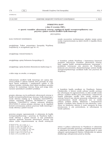 178 PL Dziennik Urzędowy Unii Europejskiej 03/t. 9 DZIENNIK URZĘDOWY WSPÓLNOT EUROPEJSKICH L 302/1 31989L0556 19.10.1989 DYREKTYWA RADY z dnia 25 września 1989 r. w sprawie warunków zdrowotnych zwierząt, regulujących handel wewnątrzwspólnotowy oraz przywóz z państw trzecich zarodków bydła domowego (89/556/EWG) RADA WSPÓLNOT EUROPEJSKICH, zostało rzeczywiście wyeliminowane; jednakże istnieje pewne ryzyko rozprzestrzeniania się takich chorób w wypadku obrotu zarodkami; uwzględniając Traktat ustanawiający Europejską Wspólnotę Gospodarczą, w szczególności jego art. 43, uwzględniając wniosek Komisji (1), uwzględniając opinię Parlamentu Europejskiego (2), uwzględniając opinię Komitetu Ekonomiczno-Społecznego (3), w kontekście polityki Wspólnoty i harmonizacji krajowych przepisów dotyczących warunków zdrowotnych zwierząt, które regulują handel wewnątrzwspólnotowy zwierzętami i produktami zwierzęcymi oraz przywóz do Wspólnoty, konieczne jest stworzenie zharmonizowanego systemu handlu wewnątrzwspólnotowego zarodkami bydła oraz przywozu do Wspólnoty; a także mając na uwadze, co następuje: wykorzystanie zarodków bydła domowego jest częścią efektywnej polityki w zakresie hodowli, która prowadzi do osiągnięcia lepszej wydajności i zwiększonych zysków w tym sektorze; ponadto, swobodny obrót takimi zarodkami powinien zachęcać do racjonalnego rozwoju, biorąc pod uwagę wykorzystanie optymalnych czynników produkcji; przepisy odnoszące się do problemów zdrowotnych zwierząt w handlu wewnątrzwspólnotowego dotyczące bydła domowego i trzody chlewnej znajdują się w dyrektywie 64/432/EWG (4), ostatnio zmienionej dyrektywą 89/360/EWG (5); ponadto dyrektywa 72/462/EWG (6), ostatnio zmieniona dyrektywą 89/227/EWG (7) zawiera przepisy odnoszące się do zagadnień kontroli weterynaryjnej podczas przywozu bydła domowego i trzody chlewnej z państw trzecich; w kontekście handlu zarodkami we Wspólnocie, Państwo Członkowskie, w którym zostały pobrane zarodki, powinno być zobowiązane do zagwarantowania, że takie zarodki zostały pobrane i poddane obróbce przez zatwierdzone i nadzorowane zespoły pobierające zarodki, które zostały uzyskane od zwierząt, których stan zdrowia gwarantuje wykluczenie ryzyka rozprzestrzenienia chorób zwierzęcych oraz że zostały pobrane, poddane obróbce, składowane i transportowane zgodnie z zasadami, które chronią ich stan zdrowotny i towarzyszy im świadectwo zdrowia w czasie transportu do kraju przeznaczenia w celu potwierdzenia, że zobowiązanie to zostało spełnione; powyższe przepisy zagwarantowały, w odniesieniu do handlu wewnątrzwspólnotowego i przywozu do Wspólnoty bydła i trzody chlewnej z państw trzecich, że kraj pochodzenia zapewnia spełnienie kryteriów zdrowotnych zwierząt, tym samym ryzyko rozprzestrzeniania się chorób zwierzęcych (1) (2) (3) (4) (5) (6) (7) Dz.U. C 76 z 28.3.1989, str. 1. Dz.U. C 120 z 16.5.1989, str. 313. Dz.U. C 139 z 5.6.1989, str. 56. Dz.U. 121 z 29.7.1964, str. 1977/64. Dz.U. L 153 z 6.6.1989, str. 29. Dz.U. L 302 z 31.12.1972, str. 28. Dz.U. L 93 z 6.4.1989, str. 25. różnice w polityce realizowanej we Wspólnocie w odniesieniu do szczepień przeciwko pryszczycy uzasadniają utrzymywanie, w odniesieniu do świeżych zarodków, ograniczonych w czasie odstępstw upoważniających Państwa Członkowskie do żądania dodatkowego zabezpieczenia przed tą chorobą; 03/t. 9 Dziennik Urzędowy Unii Europejskiej PL powinien być sporządzony wykaz państw trzecich uwzględniający kryteria zdrowotne zwierząt, z których mogą być przywożone zarodki do Wspólnoty; bez uszczerbku dla takiego wykazu Państwom Członkowskim nie wolno zezwalać na przywóz, o ile zarodki nie zostały pobrane, poddane obróbce i składowane przez zespoły do pobierania zarodków, które osiągnęły pewne standardy i są urzędowo nadzorowane; ponadto, powinny być ustalone szczególne warunki dotyczące stanu zdrowotnego w odniesieniu do krajów znajdujących się na tym wykazie zgodnie z występującymi okolicznościami; w celu sprawdzenia zgodności z tymi normami mogą być dokonywane kontrole na miejscu; w celu zapobieżenia przenoszenia się niektórych chorób zakaźnych, powinny być przeprowadzane kontrole przywozowe gdy przesyłka zarodków dotrze na terytorium Wspólnoty, z wyjątkiem tranzytu zewnętrznego; w wypadku tranzytu wewnętrznego określone są środki, jakie powinny być podjęte przez Państwa Członkowskie po przeprowadzeniu takich kontroli; należy powierzyć Komisji podjęcie takich środków w celu wykonania tej dyrektywy; w tym celu należy ustalić procedury dotyczące współpracy pomiędzy Komisją i Państwami Członkowskimi; dyrektywa ta nie dotyczy handlu zarodkami uzyskanymi, poddanymi obróbce lub składowanymi przed terminem, w którym Państwa Członkowskie muszą się do niej stosować, PRZYJMUJE NINIEJSZĄ DYREKTYWĘ: 179 Artykuł 2 Do celów niniejszej dyrektywy stosowane są definicje zawarte w art. 2 dyrektywy 64/432/EWG oraz art. 2 dyrektywy 72/462/EWG. Ponadto: a) „zarodek” oznacza wstępne stadium rozwoju bydła domowego, gdy może być przeniesiony do matki odbiorcy; b) „zespół pobierania zarodków” oznacza urzędowo zatwierdzoną grupę techników lub strukturę nadzorowaną przez weterynarza zespołu właściwego do dokonywania pobierania, poddania obróbce i przechowywania zarodków zgodnie z warunkami ustalonymi w załączniku A; c) „lekarz weterynarii zespołu” oznacza lekarza weterynarii odpowiedzialnego za nadzór nad zespołem pobierania zarodków zgodnie z warunkami ustalonymi w załączniku A; d) „przesyłka zarodków” oznacza ilość zarodków uzyskanych w jednej operacji od pojedynczego dawcy objętych pojedynczym świadectwem; e) „kraj pobrania” oznacza Państwo Członkowskie lub państwo trzecie, w którym zarodki są produkowane, pobierane, poddawane obróbce, a w razie koniecz