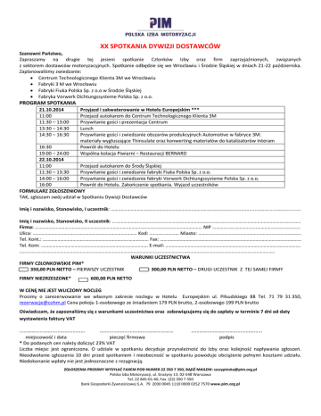 XX SPOTKANIA DYWIZJI DOSTAWCÓW Szanowni Państwo, Zapraszamy na drugie tej jesieni spotkanie Członków Izby oraz firm zaprzyjaźnionych, związanych z sektorem dostawców motoryzacyjnych. Spotkanie odbędzie się we Wrocławiu i Środzie Śląskiej w dniach 21-22 października. Zaplanowaliśmy zwiedzanie: Centrum Technologicznego Klienta 3M we Wrocławiu Fabryki 3 M we Wrocławiu Fabryki Fiuka Polska Sp. z o.o w Środzie Śląskiej Fabryka Vorwerk Dichtungssysteme Polska Sp. z o.o. PROGRAM SPOTKANIA 21.10.2014 11:00 11:30 – 13:00 13:30 – 14:30 14:30 – 16:30 Przyjazd i zakwaterowanie w Hotelu Europejskim *** Przejazd autokarem do Centrum Technologicznego Klienta 3M Przywitanie gości i prezentacja Centrum Lunch Przywitanie gości i zwiedzanie obszarów produkcyjnych Automotive w fabryce 3M: materiały wygłuszające Thinsulate oraz konwerting materiałów do katalizatorów Interam Powrót do Hotelu Wspólna kolacja Piwiarni – Restauracji BERNARD 16:30 19:00 – 24:00 22.10.2014 11:00 Przejazd autokarem do Środy Śląskiej 11:30 – 13:30 Przywitanie gości i zwiedzanie fabryki Fiuka Polska Sp. z o.o. 14:00 – 16:00 Przywitanie gości i zwiedzanie fabryki Vorwerk Dichtungssysteme Polska Sp. z o.o. 16:00 Powrót do Hotelu. Zakończenie spotkania. Wyjazd uczestników FORMULARZ ZGŁOSZENIOWY TAK, zgłaszam swój udział w Spotkaniu Dywizji Dostawców Imię i nazwisko, Stanowisko, I uczestnik: ……………………………………………………………………………………………............................................ Imię i nazwisko, Stanowisko, II uczestnik: …………………………………………………………………………………………………………………………………….. Firma: ……………………………………………………………………………………………………………………… NIP …………………………………………………………….. Ulica: ………………………………………………………………………… Kod: …………………… Miasto: ……………………………………………………………………….. Tel. Kont.: ………………………………………………….………..……………. Fax: …………………………………………………………………………………………………… Tel. Kom: ……………………………………………………………………….…. E-mail: ………………………………………………………………………………………………. ………………………………………………………………………………………………………………………………………………………………….…………………. WARUNKI UCZESTNICTWA FIRMY CZŁONKOWSKIE PIM* 350,00 PLN NETTO – PIERWSZY UCZESTNIK 300,00 PLN NETTO – DRUGI UCZESTNIK Z TEJ SAMEJ FIRMY FIRMY NIEZRZESZONE* 600,00 PLN NETTO W CENĘ NIE JEST WLICZONY NOCLEG Prosimy o zarezerwowanie we własnym zakresie noclegu w Hotelu Europejskim ul. Piłsudskiego 88 Tel. 71 79 31 350, [email protected] Cena pokoju 1-osobowego ze śniadaniem 179 PLN brutto, 2-osobowego 199 PLN brutto Oświadczam, że zapoznaliśmy się z warunkami uczestnictwa oraz zobowiązujemy się do zapłaty w terminie 7 dni od daty wystawienia faktury VAT ………………………………………… ……………………………………………… ………….………………………………… miejscowość i data pieczęć firmowa podpis * Do podanych cen należy doliczyć 23% VAT Liczba miejsc jest ograniczona. O udziale w spotkaniu decyduje przynależność do Izby oraz kolejność napływania zgłoszeń. Nieodwołanie zgłoszenia 10 dni przed spotkaniem i nieobecność w spotkaniu powoduje obciążenie pełnymi kosztami udziału. Niedokonanie wpłaty nie jest jednoznaczne z rezygnacją. ZGŁOSZENIA PROSIMY WYSYŁAĆ FAXEM POD NUMER 22 350 7 350, BĄDŹ MAILEM: [email protected] Polska Izba Motoryzacji, ul. Grażyny 13, 02-548 Warszawa Tel. 22 845-01-40, Fax. (22) 350 7 350 Bank Gospodarki Żywnościowej S.A. 79 2030 0045 1110 0000 0252 7570 www.pim.org.pl