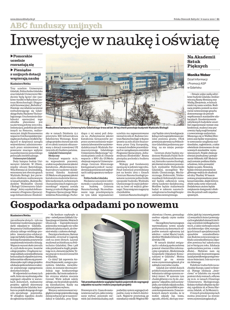 Polska Dziennik Bałtycki | 8 marca 2010 | 21 www.dziennikbaltycki.pl ABC funduszy unijnych Inwestycje wnaukę ioświatę bPomorskie uczelnie rozrastają się b Pieniądze z unijnych dotacji wspierają naukę Na Akademii Sztuk Pięknych Monika Weber Dział Informacji i Promocji ASP w Gdańsku Trzy uczelnie: Uniwersytet Gdański, Politechnika Gdańska oraz Gdański Uniwersytet Medyczny będą łączyć swe naukowe wysiłki w Bałtyckim Centrum Biotechnologii i DiagnostykiInnowacyjnej„Biobaltica”. Powstaje onowłaśnienaterenie rozbudowującego się GdańskiegoParkuNaukowo-Technologicznego.Uruchomieniedziałalności operacyjnej tego ośrodka planowane jest na pierwszą połowę 2011 roku. Inwestycjata,podobniejakwiele innych na Pomorzu, realizowana jest dzięki finansowemu wsparciuUniiEuropejskiej(pieniądzepochodząześrodkówbędących w dyspozycji zarządu województwa i administrowanych przez ministerstwa). Jej powstanie znacząco wpłynie na podwyższenie pomorskiego potencjału intelektualnego. UniwersytetGdański Duży kampus buduje Uniwersytet Gdański. W Oliwie, między ulicami Bażyńskiego, WitaStwoszaial.Grunwaldzką, wznoszony jest obecnie gmach Wydziału Biologii. Jest pierwszym obiektem realizowanym wramachprojektu„BudowaBudynków Wydziałów Chemii i Biologii Uniwersytetu Gdańskiego”, który uzyskał dofinansowanie z Programu Operacyjnego Infrastruktura i Środowi- FOT.KAZIMIERZ NETKA Kazimierz Netka Rozbudowa kampusu Uniwersytetu Gdańskiego trwa od lat. W tej chwili powstaje budynek Wydziału Biologii sko w ramach Działania 13.1 priorytetu XIII Infrastruktura Szkolnictwa Wyższego. Koszt całegoprojektuwynosi236mln zł i w całości zostanie sfinansowany z dotacji rozwojowej UE (200 mln zł) i budżetu państwa. GdańskiUniwersytet Medyczny Otrzymał wsparcie m.in. na wyposażenie pracowni, atakżenapodwyższeniejakości kształcenia. „Modernizacja infrastruktury naukowo-dydaktycznej Katedry Anatomii GUMeduwcelupoprawyjakości kształcenia studentów kierunkówmedycznych,technicznych i humanistycznych regionu pomorskiego” wsparta została kwotą5,6mlnzłzRegionalnego Programu Operacyjnego Województwa Pomorskiego. Pocho- dząca z tej samej puli dotacja na „Podwyższenie jakości kształcenia farmaceutów poprzez unowocześnienie wyposażenialaboratoriównaukowodydaktycznych Wydziału Farmaceutycznego Gdańskiego UniwersytetuMedycznego”wyniosła prawie 3 mln zł. Ostatnie wsparcie z RPO dla GUMedu obejmujewsparcieUniwersyteckiego Centrum Klinicznego kwotąponad3,5mlnzł–namodernizacjępomieszczeńszpitalnychizakupaparaturymedycznej. PolitechnikaGdańska Niedawno uroczyście informowała o uzyskaniu wsparcia na budowę Centrum Nanotechnologii. Na zrealizowanie tego przedsięwzięcia (w tym także wyposażenie) czyćbędzieczterykondygnacje. Jednąznichzaprojektowanoponiżej poziomu gruntu. Obok powstaniepierwszynaPolitechnice Gdańskiej podziemny parking na sto miejsc postojowych. Centrum służyć będzie studentom Wydziału Fizyki Technicznej i Matematyki Stosowanej, kierunku nanotechnologii, jakrównieżstudentompozostałych wydziałów Politechniki Gdańskiej, szczególnie Wydziału Chemicznego, Mechanicznego, Elektroniki, Telekomunikacji i Informatyki i stanowić będzie całkowicie nową ofertę naukowo-dydaktyczną. Możliwe będzie realizowanie badań w zakresie nanotechnologiioraztechnologiibezpieczeństwa wewnętrznego. uczelnia ma zagwarantowane niemal 65 mln zł. Budowa CentrumNanotechnologii w85proc (prawie 55 mln zł) jest finansowana przez Unię Europejską, w ramach środków przewidzianychw zarządzanymcentralnie ProgramieOperacyjnym„Infrastruktura i Środowisko”. Reszta pieniędzy pochodzi z budżetu państwa. Wykopy pod fundamenty zaczną się w połowie tego roku. Finał inwestycji przewidziany jest na koniec 2011 r. Gmach Centrum Nanotechnologii powstanie na terenie politechniki, nieopodal budynku Wydziału Chemicznego (w części położonej na lewo od wejścia głównego).Terazstojątammagazyny chemikaliów. CentrumNanotechnologiili- – Dotacje unijne zasilą zabytkowe budynki Gdańska: średniowieczną Basztę Słomianą oraz Wielką Zbrojownie, w których mieści się nasza uczelnia. Realizacja projektu pozwoli na stworzenie nowoczesnego gmachu dostosowanego do potrzeb współczesnych standardów edukacyjnych. Zmodernizowanie zabytkowych budynków umożliwi organizowanie wystaw oraz konferencji, studenci oraz pracownicy będą mogli korzystać z nowoczesnego audytorium. Mieszcząca się w Wielkiej Zbrojowni aula będzie wyposażona w nowoczesne urządzenia multimedialne, nagłośnienie, a także oświetlenie dostosowane do najnowszych standardów wystawienniczych. Projekt obejmuje również przebudowę i powiększenie biblioteki ASP. Modernizacji zostanie poddana klatka schodowa, która prowadzić będzie na patio. Nowością będzie również przeniesienie głównego wejścia do akademii od ulicy Tkackiej. W baszcie zostaną przeprowadzone prace konserwatorskie, dzięki którym obiekt zyska nowy wizerunek. Dodatkowym atutem będzie zwiększenie dostępności obiektów dla potrzeb osób niepełnosprawnych. Kazimierz Netka 330 milionów złotych – tyle ma kosztowaćmodernizacjagospodarki odpadami w Gdańsku. BezpomocyUniiEuropejskiejrealizacja takiego wielkiego projektu inwestycyjno-edukacyjnegoniebyłabymożliwa.Dlatego KomisjaEuropejskapozytywnie zaopiniowaławniosekodotację. Wsparciewynosiokoło200mln zł, czyli około 60 proc. kosztów całegoprojektu.Urządzanienowegozakładuunieszkodliwiania komunalnychodpadówjużtrwa. Jednocześnieodbywasięprzewidzianajakoczęśćcałegoprojektu edukacjaspołeczeństwawzakresie poprawnego segregowania domowychśmieci. Wodpowiedzinaobawytych osób, któreniewyobrażająsobie segregacji odpadów w warunkach domowych, realizatorzy projektu ogłosili skierowany do mieszkańców Gdańska konkursna projektsłużącegodotego celu specjalnego pojemnika. W ubiegłym tygodniu doszło doogł