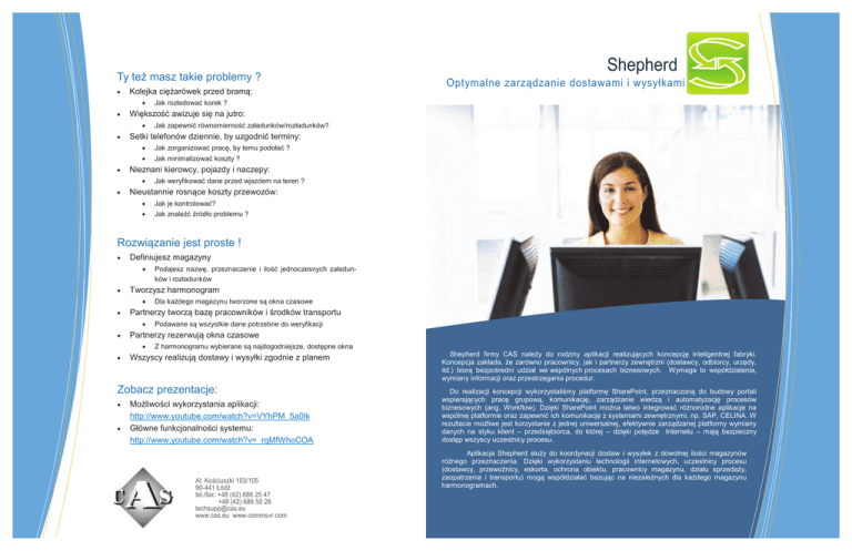 Ty też masz takie problemy ? Kolejka ciężarówek przed bramą: Jak rozładować korek ? Jak zapewnić równomierność załadunków/rozładunków? Setki telefonów dziennie, by uzgodnić terminy: Jak zorganizować pracę, by temu podołać ? Jak minimalizować koszty ? Nieznani kierowcy, pojazdy i naczepy: Optymalne zarządzanie dostawami i wysyłkami Większość awizuje się na jutro: Shepherd Jak weryfikować dane przed wjazdem na teren ? Nieustannie rosnące koszty przewozów: Jak je kontrolować? Jak znaleźć źródło problemu ? Rozwiązanie jest proste ! Definiujesz magazyny Tworzysz harmonogram Podawane są wszystkie dane potrzebne do weryfikacji Partnerzy rezerwują okna czasowe Dla każdego magazynu tworzone są okna czasowe Partnerzy tworzą bazę pracowników i środków transportu Podajesz nazwę, przeznaczenie i ilość jednoczesnych załadunków i rozładunków Z harmonogramu wybierane są najdogodniejsze, dostępne okna Wszyscy realizują dostawy i wysyłki zgodnie z planem Zobacz prezentacje: Możliwości wykorzystania aplikacji: http://www.youtube.com/watch?v=VYhPM_5a0lk Główne funkcjonalności systemu: http://www.youtube.com/watch?v=_rqMfWhoCOA Al. Kościuszki 103/105 90-441 Łódź tel./fax: +48 (42) 686 25 47 +48 (42) 686 50 28 [email protected] www.cas.eu www.commsvr.com Shepherd firmy CAS należy do rodziny aplikacji realizujących koncepcję inteligentnej fabryki. Koncepcja zakłada, że zarówno pracownicy, jak i partnerzy zewnętrzni (dostawcy, odbiorcy, urzędy, itd.) biorą bezpośredni udział we wspólnych procesach biznesowych. Wymaga to współdziałania, wymiany informacji oraz przestrzegania procedur. Do realizacji koncepcji wykorzystaliśmy platformę SharePoint, przeznaczoną do budowy portali wspierających pracę grupową, komunikację, zarządzanie wiedzą i automatyzację procesów biznesowych (ang. Workflow). Dzięki SharePoint można łatwo integrować różnorodne aplikacje na wspólnej platformie oraz zapewnić ich komunikację z systemami zewnętrznymi, np. SAP, CELINA. W rezultacie możliwe jest korzystanie z jednej uniwersalnej, efektywnie zarządzanej platformy wymiany danych na styku klient – przedsiębiorca, do której – dzięki potędze Internetu – mają bezpieczny dostęp wszyscy uczestnicy procesu. Aplikacja Shepherd służy do koordynacji dostaw i wysyłek z dowolnej ilości magazynów różnego przeznaczenia. Dzięki wykorzystaniu technologii internetowych, uczestnicy procesu (dostawcy, przewoźnicy, eskorta, ochrona obiektu, pracownicy magazynu, działu sprzedaży, zaopatrzenia i transportu) mogą współdziałać bazując na niezależnych dla każdego magazynu harmonogramach. Shepherd JAK DZIAŁA APLIKACJA SHEPHERD ? KORZYŚCI BIZNESOWE PRECYZYJNE PLANOWANIE DO STAW I WYSYŁEK CAŁKOWITA ELIMINACJA KOLEJEK POJAZDÓW OCZEKUJĄCYCH NA ZAŁADUNEK/ROZŁADUNEK WYKORZYSTANIE PEŁNEJ WYDAJNOŚCI POSIADANYCH ZASOBÓW SWOBODNY DOBÓW TERMINÓW WEDŁUG POTRZEB I MOŻLIWOŚCI PRZEŁADUNKOWYCH MINIMALIZACJA KOSZTÓW ORGANIZACJI DOSTAW I WYSYŁEK POPRAWA JAKOŚCI USŁUG ŚWIADCZONYCH PRZEZ PARTNERÓW (DOSTAWCÓW, PRZEWOŹNIKÓW) DZIĘKI KONIECZNOŚCI ŚCISŁEGO PRZESTRZEGANIA PROCEDUR ODCIĄŻENIE DZIAŁU TRANSPORTU RÓWNIEŻ POPRZEZ MOŻLIWOŚĆ RAPORTOWANIA INFORMOWANIE ZAINTERESOWANYCH OSÓB O ZDARZENIACH Podstawą procesu jest utworzenie harmonogramów Aby umożliwić pełną kontrolę przy wjeździe, partnerzy zgodnie z potrzebami i posiadanymi zasobami. Part- muszą wprowadzić wymagane dane identyfikacyjne nerzy zdalnie rezerwują okno czasowe dla realizacji kierowców i pojazdów. Dane wybierane są z bazy i załadunku/rozładunku zgodnie ze swoimi preferencja- dostępne dla pracowników ochrony jako lista kontrolna mi, korzystając z uwzględniającego zajęte już okna przed wpuszczeniem na teren magazynu. W przypad- czasowe harmonogramu dla wybranego magazynu. ku odchyleń od ustalonych procedur, uczestnicy pro- Dla każdego magazynu można utworzyć dowolną cesu są z wyprzedzeniem automatycznie informowani ilość równolegle realizowanych procesów dostaw/ o konieczności podjęcia działań w celu wyeliminowa- wysyłek. nia potencjalnego zagrożenia. Optymalne zarządzanie dostawami i wysyłkami SWOBODA I ELASTYCZNOŚĆ PŁACISZ ZA TO, CZEGO PORZEBUJESZ Wybierasz tylko potrzebną funkcjonalność Możesz wybrać określoną liczbę użytkowników Płacisz tylko za wykorzystane zasoby (procesor, pamięć, transfer, itp.) Użytkownik wybiera język interfejsu DOSTĘP ZA POŚREDNICTWEM INTERNETU Nie potrzebujesz inwestować Nie potrzebujesz własnych serwerów Nie potrzebujesz drogich licencji na oprogramowanie systemowe i klienckie ŁATWOŚĆ DOSTĘPU Dla wysyłek dodatkowo istnieje możliwość swobodnego Aplikacja Shepherd może działać także w oknie przegląwyboru przewoźników w zależności od rynków, na które darki, bez wymogu instalowania jakiegokolwiek oprograprzeznaczony jest towar. W tym procesie możliwy jest mowania co gwarantuje dostęp do danych w dowolnym CAS także wybór eskorty i miejsca świadczenia przez nią miejscu. System w chmurze likwiduje barierę finansową usługi, jeśli przesyłka ma być eskortowana. Katalogowa- dostępu do inwestycji dla wielu mniejszych przedsię- nie usług i powiązanie ich z miejscem przeznaczenia biorstw. pozwala współdziałać na podstawie długoterminowych G Ł Ó W N E C E C H Y A P L I K A C JI umów i – w uzasadnionych przypadkach – umożliwia łatwe zastąpienie jednego przewoźnika innym, co gwarantuje ciągłość i wysoką jakość usług. Zapewnia to również automatyzację (zmniejszenie pracochłonności) pro- Integruje się z systemami: cesu wyboru partnera. Wykorzystane oprogramowanie Dla każdej wysyłki możliwe jest wprowadzenie jej szcze- Microsoft Office SharePoint Server gółowego opisu, tj. między innymi przebiegu trasy, typu Microsoft Active Directory załadunku, rynku przeznaczenia i innych specyficznych Microsoft Office 2010 uzg