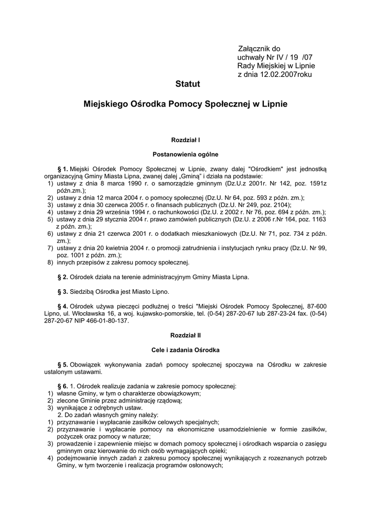 Załącznik do uchwały Nr IV / 19 /07 Rady Miejskiej w Lipnie z dnia 12.02.2007roku Statut Miejskiego Ośrodka Pomocy Społecznej w Lipnie Rozdział I Postanowienia ogólne § 1. Miejski Ośrodek Pomocy Społecznej w Lipnie, zwany dalej "Ośrodkiem" jest jednostką organizacyjną Gminy Miasta Lipna, zwanej dalej „Gminą” i działa na podstawie: 1) ustawy z dnia 8 marca 1990 r. o samorządzie gminnym (Dz.U.z 2001r. Nr 142, poz. 1591z późn.zm.); 2) ustawy z dnia 12 marca 2004 r. o pomocy społecznej (Dz.U. Nr 64, poz. 593 z późn. zm.); 3) ustawy z dnia 30 czerwca 2005 r. o finansach publicznych (Dz.U. Nr 249, poz. 2104); 4) ustawy z dnia 29 września 1994 r. o rachunkowości (Dz.U. z 2002 r. Nr 76, poz. 694 z późn. zm.); 5) ustawy z dnia 29 stycznia 2004 r. prawo zamówień publicznych (Dz.U. z 2006 r.Nr 164, poz. 1163 z późn. zm.); 6) ustawy z dnia 21 czerwca 2001 r. o dodatkach mieszkaniowych (Dz.U. Nr 71, poz. 734 z późn. zm.); 7) ustawy z dnia 20 kwietnia 2004 r. o promocji zatrudnienia i instytucjach rynku pracy (Dz.U. Nr 99, poz. 1001 z późn. zm.); 8) innych przepisów z zakresu pomocy społecznej. § 2. Ośrodek działa na terenie administracyjnym Gminy Miasta Lipna. § 3. Siedzibą Ośrodka jest Miasto Lipno. § 4. Ośrodek używa pieczęci podłużnej o treści "Miejski Ośrodek Pomocy Społecznej, 87-600 Lipno, ul. Włocławska 16, a woj. kujawsko-pomorskie, tel. (0-54) 287-20-67 lub 287-23-24 fax. (0-54) 287-20-67 NIP 466-01-80-137. Rozdział II Cele i zadania Ośrodka § 5. Obowiązek wykonywania zadań pomocy społecznej spoczywa na Ośrodku w zakresie ustalonym ustawami. § 6. 1. Ośrodek realizuje zadania w zakresie pomocy społecznej: 1) własne Gminy, w tym o charakterze obowiązkowym; 2) zlecone Gminie przez administrację rządową; 3) wynikające z odrębnych ustaw. 2. Do zadań własnych gminy należy: 1) przyznawanie i wypłacanie zasiłków celowych specjalnych; 2) przyznawanie i wypłacanie pomocy na ekonomiczne usamodzielnienie w formie zasiłków, pożyczek oraz pomocy w naturze; 3) prowadzenie i zapewnienie miejsc w domach pomocy społecznej i ośrodkach wsparcia o zasięgu gminnym oraz kierowanie do nich osób wymagających opieki; 4) podejmowanie innych zadań z zakresu pomocy społecznej wynikających z rozeznanych potrzeb Gminy, w tym tworzenie i realizacja programów osłonowych; 5) współpraca z Powiatowym Urzędem Pracy w Lipnie w zakresie upowszechniania ofert pracy oraz informacji o wolnych miejscach pracy, upowszechnianie informacji o usługach poradnictwa zawodowego i o szkoleniach. 3. Do zadań własnych Gminy o charakterze obowiązkowym należy: 1) opracowanie i realizacja gminnej strategii rozwiązywania problemów społecznych ze szczególnym uwzględnieniem programów pomocy społecznej, profilaktyki i rozwiązywania problemów alkoholowych i innych, których celem jest integracja osób i rodzin z grup szczególnego ryzyka; 2) sporządzanie bilansu potrzeb Gminy w zakresie pomocy społecznej; 3) udzielanie schronienia, zapewnienie posiłku oraz niezbędnego ubrania osobom tego pozbawionym; 4) przyznawanie i wypłacanie zasiłków okresowych; 5) przyznawanie i wypłacanie zasiłków celowych; 6) przyznawanie i wypłacanie zasiłków na pokrycie wydatków powstałych w wyniku zdarzenia losowego; 7) przyznawanie i wypłacanie zasiłków na pokrycie wydatków na świadczenia zdrowotne osobom bezdomnym oraz innym osobom nie mającym dochodu i możliwości uzyskania świadczeń na podstawie przepisów o powszechnym ubezpieczeniu w Narodowym Funduszu Zdrowia; 8) przyznawanie zasiłków w formie biletu kredytowego; 9) opłacanie składek na ubezpieczenia emerytalne i rentowe za osobę, która zrezygnuje z zatrudnienia w związku z koniecznością sprawowania bezpośredniej, osobistej opieki nad długotrwale lub ciężko chorym członkiem rodziny oraz wspólnie nie zamieszkującymi matką, ojcem lub rodzeństwem; 10) praca socjalna; 11) organizowanie i świadczenie usług opiekuńczych, w tym specjalistycznych, w miejscu zamieszkania, z wyłączeniem specjalistycznych usług dla osób z zaburzeniami psychicznymi; 12) prowadzenie i zapewnienie miejsc w placówkach opiekuńczo-wychowawczych wsparcia dziennego lub mieszkaniach chronionych; 13) tworzenie gminnego systemu profilaktyki i opieki nad dzieckiem i rodziną; 14) dożywianie dzieci; 15) sprawienie pogrzebu, w tym osobom bezdomnym; 16) kierowanie do domu pomocy społecznej i ponoszenie odpłatności za pobyt mieszkańca Gminy w tym domu; 17) sporządzanie sprawozdawczości oraz przekazywanie wojewodzie, również w wersji elektronicznej, z zastosowaniem systemu informatycznego; 18) utworzenie i utrzymanie ośrodka pomocy społecznej, w tym zapewnienie środków na wynagrodzenia pracowników. 4. Do zadań zleconych z zakresu administracji rządowej realizowanych przez Gminę należy: 1) przyznawanie i wypłacanie zasiłków stałych; 2) opłacanie składek na ubezpieczenie zdrowotne określonych w przepisach o powszechnym ubezpieczeniu w Narodowym Funduszu Zdrowia; 3) organizowanie i świadczenie specjalistycznych usług opiekuńczych w miejscu zamieszkania dla osób z zaburzeniami psychicznymi; 4) przyznawanie i wypłacanie zasiłków celowych na pokrycie wydatków związanych z klęską żywiołową lub ekologiczną; 5) prowadzenie i rozwój infrastruktury środowiskowych domów samopomocy dla osób z zaburzeniami psychicznymi; 6) realizacja zadań wynikających z rządowych programów pomocy społecznej, mających na celu ochronę poziomu życia osób, rodzin i grup społecznych oraz rozwój specjalistycznego wsparcia 5. Ośrodek realizuje także zadania z zakresu pomocy społecznej wynikające z ustaw: 1) ustawa z dnia 19 sierpnia 1994 r. o ochronie zdrowia psychicznego (Dz.U. Nr 111, poz. 535 z późn. zm.); 2) ustawa z dnia 20 kwietnia 2004 r. o promocji zatrudnienia i instytucjach rynku pracy (Dz.U. Nr 99, poz. 1001 z późn. zm.); 3) ustawa z dnia 27 sierpnia 2004 r. o świadcz