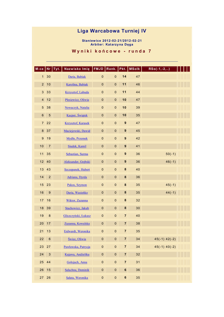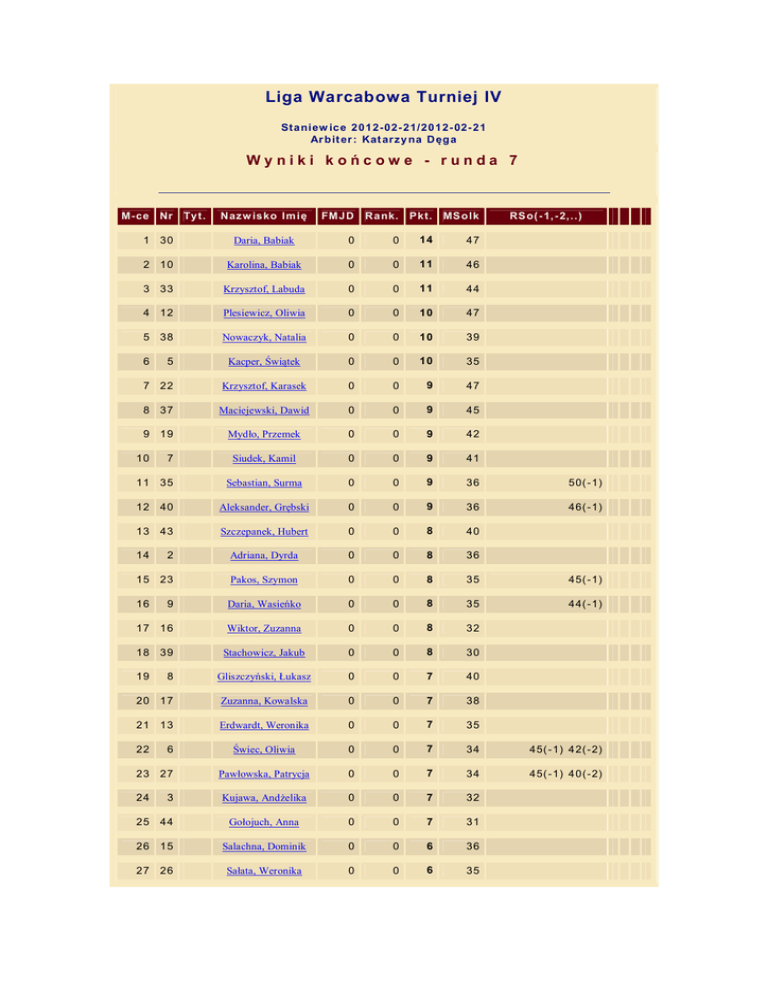 Liga Warcabowa Turniej IV Sta niew ic e 2 0 1 2-0 2- 2 1/2 0 1 2- 02- 2 1 Ar b it er : Kat arzy na D ęg a Wyniki końcowe - runda 7 M-c e Nr Ty t. N azw is ko Im ię FM J D R a nk. P kt. MS o lk RS o(- 1,- 2,..) 1 30 Daria, Babiak 0 0 14 47 2 10 Karolina, Babiak 0 0 11 46 3 33 Krzysztof, Labuda 0 0 11 44 4 12 Plesiewicz, Oliwia 0 0 10 47 5 38 Nowaczyk, Natalia 0 0 10 39 Kacper, Świątek 0 0 10 35 7 22 Krzysztof, Karasek 0 0 9 47 8 37 Maciejewski, Dawid 0 0 9 45 9 19 Mydło, Przemek 0 0 9 42 Siudek, Kamil 0 0 9 41 11 35 Sebastian, Surma 0 0 9 36 5 0(-1) 12 40 Aleksander, Grębski 0 0 9 36 4 6(-1) 13 43 Szczepanek, Hubert 0 0 8 40 2 Adriana, Dyrda 0 0 8 36 15 23 Pakos, Szymon 0 0 8 35 4 5(-1) 16 9 Daria, Wasieńko 0 0 8 35 4 4(-1) 17 16 Wiktor, Zuzanna 0 0 8 32 18 39 Stachowicz, Jakub 0 0 8 30 Gliszczyński, Łukasz 0 0 7 40 20 17 Zuzanna, Kowalska 0 0 7 38 21 13 Erdwardt, Weronika 0 0 7 35 Świec, Oliwia 0 0 7 34 4 5(-1) 4 2( -2) Pawłowska, Patrycja 0 0 7 34 4 5(-1) 4 0(-2) Kujawa, Andżelika 0 0 7 32 25 44 Gołojuch, Anna 0 0 7 31 26 15 Salachna, Dominik 0 0 6 36 27 26 Sałata, Weronika 0 0 6 35 6 10 14 19 22 5 7 8 6 23 27 24 3 28 34 Łukasik, Izabela 0 0 6 33 29 36 Mazurek, Magda 0 0 6 31 Świec, Daria 0 0 6 29 31 25 Miszczak, Jakub 0 0 6 28 32 41 Wal, Inga 0 0 6 25 33 11 Gołębiowska, Natalia 0 0 5 3 6 4 6(-1) 4 0( -2) 3 4( - 3) 33 14 Haryńska, Marta 0 0 5 3 6 4 6(-1) 4 0( -2) 3 4( - 3) 35 Skrobek, Marcel 0 0 5 3 6 4 6(-1) 4 0( -2) 3 3( - 3) 36 18 Fischer, Bernadetta 0 0 5 29 37 29 Natalia, Jóźwik 0 0 5 27 3 8(-1) 38 31 Pszon, Agnieszka 0 0 5 27 3 5(-1) 39 24 Cybul, Dominik 0 0 5 23 40 21 Lisek, Julia 0 0 4 34 41 32 Kozdra, Wiktoria 0 0 3 28 42 28 Kapa, Katarzyna 0 0 3 24 43 42 Bartek, Papierz 0 0 2 28 44 20 Grześko, Maciek 0 0 2 25 30 1 4 C he s s Arb it er Pro w arc a by (v. 3. 5 2) (C) A. C ury ło http://www.chessarbiter.com/ L ic:0 0 6 1 W ła ś c ic ie l: Sy lw ia D ęg a - Z amrzy ck a