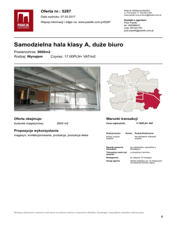 Oferta nr.: 5287 PAWLIK NIERUCHOMOŚCI ul. Pomorska 77, 90-224 Łódź www.pawlik.com.pl [email protected] Data wydruku: 07.03.2017 Więcej informacji i zdjęć na: www.pawlik.com.pl/5287 Kontakt z agentem: Piotr Pawlik tel: 426386041 mob: 601241761 [email protected] Samodzielna hala klasy A, duże biuro Powierzchnia: 2600m2 Rodzaj: Wynajem Czynsz: 17.00PLN+ VAT/m2 Oferta obejmuje: budynek magazynowy Warunki transakcji 2600 m2 Propozycje wykorzystania magazyn, konfekcjonowanie, produkcja, produkcja lekka Cena najmu(m2): Rodzaj kosztu: 17.00PLN+ VAT Kwota: koszty zużycia mediów Rodzaj Rozliczenia: Na podstawie wskazań licznika Sposób zawarcia transakcji: po uzgodnieniu warunków z oferującym Transakcja może być zawarta: w dowolnym terminie Dostępność: po upływie 12 miesięcy Uwagi agenta: Obiekt dostępny po 12 miesiącach od zawarcia umowy najmu. Niniejszy dokument i zawarte w nim dane nie stanowi oferty w rozumieniu Kodeksu Cywilnego i maj jedynie charakter informacyjny. 1 Oferta nr.: 5287 Więcej informacji i zdjęć na: www.pawlik.com.pl/5287 Opis oferty Samodzielny budynek magazynowo-biurowy z możliwością przygotowania powierzchnia dla showroom'u. Z uwagi na lokalizację dobrze nadaje się również, poza działalnością magazynową i lekką produkcją, dla potrzeb działalności usługowej. Obiekt od frontu posiadał będzie reprezentacyjną elewację w części biurowej oraz dostęp poprzez doki od strony rozładunkowej. Funkcjonalnie budynek składa się z dwóch połączonych ze sobą obiektów. Obecnie obiekt jest w trakcie budowy a planowane oddanie do użytkowania to początek 2018 roku. Na obecnym etapie obiekt może być dość dowolnie zaaranżowany zgodnie z oczekiwaniami najemcy. Istnieje możliwość wykonania dość dużej powierzchni biurowej czy wystawienniczo-usługowej. Oferowany czynsz dotyczy wykończenia typowo magazynowego. Oferta obejmuje budynek magazynowy Klasa obiektu: A Powierzchnia: 2600 m2 Stan techniczny: bardzo dobry Rodzaje powierzchni użytkowych Kondygnacja Rodzaj powierzchni Powierzchnia Liczba pomieszczeń Parter magazynowy 2600.00 m2 1 Kondygnacja Charakter powierzchni Powierzchnia Podłoga Ściana Sufit Okna Parter magazynowy 2600.00 m2 bez wykończenia armstrong brak okien Standard beton Stan techniczny Budynek istniejący Rok budowy Opis techniczny Konstrukcja budynku: stalowa Strop: brak Kondygnacja Rodzaj powierzchni Powierzchnia Wysokość Parter magazynowy 2600.00 m2 6.00 Siatka słupów Strop Niniejszy dokument i zawarte w nim dane nie stanowi oferty w rozumieniu Kodeksu Cywilnego i maj jedynie charakter informacyjny. 2 Oferta nr.: 5287 Więcej informacji i zdjęć na: www.pawlik.com.pl/5287 Dostęp Rodzaj wrót dok rozładunkowy Wyposażenie Liczba 2 Szerokość 0.00 m Wysokość 0.00 m Bezpieczeństwo Alarm Monitoring Bocznica kolejowa Ochrona fizyczna Winda towarowa P-poż Dojazd TIR Instalacja tryskaczowa plac manewrowy Instalacja sygnalizacji p-poż Parking Klapy dymowe Dostęp do lokalu z terenu nieruchomości Teleinformatyka Telefon Sieć komputerowa Internet Ogrzewanie/klimatyzacja Ogrzewanie Wentylacja mechaniczna Media Toaleta Położenie do wykonania w lokalu Sąsiedztwo Przyłącza elektryczne Budynku przemysłowe i biurowe Dwustronne zasilanie Sąsiedztwo (ang.) Industrial buildings Stacja trafo Dostęp do drogi publiczna Instalacja elektryczna Droga utwardzona? Tak Instalacja siłowa Przylącza gazowe Przyłącze wodne Instalacja wodno-kanalizacyjna ZDJĘCIA OFERTY Niniejszy dokument i zawarte w nim dane nie stanowi oferty w rozumieniu Kodeksu Cywilnego i maj jedynie charakter informacyjny. 3 Oferta nr.: 5287 Więcej informacji i zdjęć na: www.pawlik.com.pl/5287 Niniejszy dokument i zawarte w nim dane nie stanowi oferty w rozumieniu Kodeksu Cywilnego i maj jedynie charakter informacyjny. 4