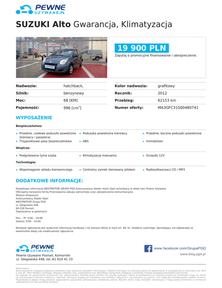 SUZUKI Alto Gwarancja, Klimatyzacja 19 900 PLN Zapytaj o promocyjne finansowanie i ubezpieczenie. Nadwozie: hatchback, Kolor nadwozia: grafitowy Silnik: benzynowy Rocznik: 2012 Moc: 68 [KM] Przebieg: 62153 km Pojemność: 996 [cm ] Numer oferty: MA3GFC31S00480741 3 WYPOSAŻENIE Bezpieczeństwo: Przednie, czołowe poduszki powietrzne (kierowcy i pasażera) Trzypunktowe pasy bezpieczeństwa Poduszka powietrzna kierowcy Przednie, boczne poduszki powietrzne ABS Immobilizer Klimatyzacja manualna Gniazdo 12V Centralny zamek sterowany pilotem Radioodtwarzacz CD / MP3 Wnętrze: Podgrzewana tylna szyba Technologia: Wspomaganie układu kierowniczego DODATKOWE INFORMACJE: Dodatkowe informacje:WESTMOTOR GRUPA PGD Autoryzowany dealer marki Opel wchodzący w skład sieci Pewne Używane. Oferujemy korzystne formy finansowania zakupu samochodu oraz ubezpieczenia komunikacyjne. Miejsce ekspozycji: Autoryzowany Dealer Opel WESTMOTOR Grupa PGD ul. Głogowska 448 60-226 Poznań Zapraszamy w godzinach: Pon. - Pt: 9:00 – 19:00 Sobota: 9:00 - 14:00 Niniejsze ogłoszenie jest wyłącznie informacją handlową i nie stanowi oferty w myśl art. 66, §1. Kodeksu cywilnego. Sprzedający nie odpowiada za ewentualne błędy lub nieaktualność ogłoszenia. Pewne Używane Poznań, Komorniki ul. Głogowska 448, tel.:61 610 41 33 www.blog.pgd.pl Nota prawna Dane zawarte w niniejszej propozycji handlowej mają wyłącznie charakter informacyjny. Podane informacje nie stanowią oferty ani zapewnienia, w szczególności w rozumieniu art. 66 § 1 oraz art. 5561 Kodeksu cywilnego. Wiążące ustalenie ceny, wyposażenia oraz specyfikacji samochodu następuje w pisemnej umowie sprzedaży/zamówienia samochodu. Ze względu na ograniczenia techniczne (np. odwzorowanie kolorów przez monitor lub sposób wydruku), kolory przedstawione w niniejszej propozycji handlowej mogą się różnić od rzeczywistych kolorów nadwozia i tapicerki. Niniejsza propozycja handlowa oraz wszelkie załączniki z nią związane są poufne i nie mogą być przekazywane osobom trzecim. Prezentowane zdjęcia mogą zawierać wyposażenie opcjonalne (akcesoryjne), dodatkowo płatne. Warunki oferty maja charakter orientacyjny i mogą zostać zmienione w momencie uaktualnienia cen lub warunków promocji.