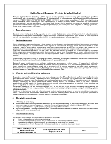 Ogólne Warunki Sprzedaży Wyrobów do Izolacji Cieplnej Niniejsze Ogólne Warunki Sprzedaży „OWS” regulują zasady sprzedaży towarów i usług gdzie sprzedającym jest firma Paneltech Sp. z o.o. z siedzibą w Chorzowie przy ul. Michałkowickiej 24 zarejestrowanej w Krajowym Rejestrze Sądowym pod numerem KRS0000105517, NIP 627-00-12-306, REGON 008118215 zwanym dalej „sprzedającym”. OWS stanowią integralną część wszystkich umów zawieranych przez sprzedającego w formie pisemnej (oferta, zamówienie lub potwierdzenie zamówienia) bądź ustnego zamówienia i obowiązuje obie strony o ile nie uzgodnią one pisemnie wyraźnie odmiennych postanowień. Przedłożona kupującemu oferta przez sprzedającego jest ważna przez okres 2 tygodni od daty jej wystawienia, chyba że co innego wynika z treści oferty. 1. Zawarcie umowy Zawarcie umowy następuje z chwilą, gdy jedna ze stron wyrazi chęć zawarcia umowy (oferta, zamówienie lub potwierdzenie zamówienia), podając istotne postanowienia i ogólne warunki dot. przedmiotu, zastosowania, ceny, a druga ze stron przyjmie te warunki bez zastrzeżeń w formie potwierdzenia. Obie strony obowiązuje pisemna forma uzgodnień. 2. Realizacja umowy Strony zobowiązane są do współpracy w trakcie realizacji umowy. Kupujący obowiązany jest udzielić Sprzedającemu wszelkich informacji niezbędnych do wyprodukowania wyrobu zgodnie z zamówieniem. Kupujący ponosi odpowiedzialność za skutki powstałe z podania w zamówieniu niewłaściwych bądź niekompletnych danych technicznych. Sprzedający jest uprawniony do przesunięcia terminu realizacji zamówienia w razie wystąpienia okoliczności, za które nie ponosi odpowiedzialności. Dowodem zrealizowania zamówienia lub jego części jest dokument sprzedaży towarów WZ, dowód dostawy lub dokument CMR, potwierdzone przez Kupującego. Jeżeli dostawa odbywa się na koszt Sprzedającego, to koszty odbioru i rozładunku obciążają Kupującego. Kupujący obowiązany jest zgłosić pisemnie wady i uszkodzenia dostarczonych towarów w dniu ich odbioru. Dokumentami związanymi z OWS są: Warunki Transportu, Załadunku, Rozładunku i Składowania oraz Wytyczne Montażu Płyt Izolacyjnych, Katalogi techniczne Paneltech, Ogólne warunki gwarancji Paneltech Załadunek towaru zostaje dokonany w zakładzie produkcyjnym sprzedającego na jego koszt.. W przypadku nie odebrania towaru w ciągu 14 dni od daty planowanego wykonania zamówienia przechodzi on w tak zwane magazynowanie komisowe. Koszt komisowego magazynowania ustala się w wysokości 0,5 % wartości zamówienia za każdy dzień składowania. Dostarczone towary pozostają własnością Sprzedającego do chwili uregulowania całości zobowiązań wynikających z umowy pomiędzy stronami, a w szczególności do chwili zapłaty za dostarczony towar. 3. Warunki płatności i terminy wykonania Zwyczajowo warunki płatności podane są przez sprzedającego na druku: Oferta, Zamówienie lub Potwierdzenie Zamówienia, które następnie zostają przyjęte i zatwierdzone przez kupującego. W przypadku, gdy przewidziany jest zadatek na rzecz Sprzedającego, wpłacona przez Kupującego kwota podlega zaliczeniu na poczet kosztów. W przypadku opóźnienia w zapłacie zadatku, Sprzedający ma prawo przesunięcia terminu dostawy towaru lub wykonania usługi aż do czasu uzyskania potwierdzenia wpływu zapłaty. W wypadku przekroczenia terminu wykonania zamówienia o więcej niż 14 dni kupujący ma prawo od tego dnia do naliczenia ustawowych odsetek. Sprzedający oświadcza, że jest płatnikiem podatku VAT, nr NIP 627-00-12-306. Kupujący upoważnia Sprzedającego do wystawienia faktury VAT bez swojego podpisu. Faktura wystawiona będzie przez Sprzedającego w ciągu 7 dni od daty wydania towaru Kupującemu. Należność za dostarczony towar lub wykonanie usługi zostanie zapłacona sprzedawcy w terminie przewidzianym na druku: Oferta, Zamówienie lub Potwierdzenie Zamówienia na rachunek bankowy podany na fakturze. W przypadku opóźnienia w zapłacie za towar lub usługę Kupujący zostanie obciążony ustawowymi odsetkami. 4. Obowiązki sprzedawcy Ustala się, że sprzedający: udziela kupującemu gwarancji na okres 24 miesięcy od daty wystawienia faktury, na warunkach określonych w umowie, pod warunkiem dopełnienia przez kupującego wszystkich formalności przewidzianych w treści niniejszych OWS-ów . wyłącza odpowiedzialność z tytułu rękojmi, gdy Kupujący nie jest Konsumentem . nie udziela Gwarancji i nie będzie odpowiedzialny z tytułu rękojmi za wady fizyczne, które nie wynikły z przyczyny tkwiącej już poprzednio w rzeczy sprzedanej. 5. Rozwiązanie umowy Sprzedający może odstąpić od umowy (bez uprzedzenia) w przypadku: a. braku wpłaty zadatku, o ile jest on przewidziany. b. niedostarczenia przez Kupującego danych niezbędnych do wykonania przedmiotu umowy, c. nieodebrania towaru w okresie dłuższym niż 6 miesiące od oznaczonej daty odbioru, d. niezapłacenia w okresie dłuższym niż 2 miesiące należności za wcześniej dostarczony towar. PaNELTECH sp. z o.o. 41-508 Chorzów ul. Michałkowicka 24 Data wydania 04.04.2016 Edycja : 2016.3 Str. 1 6. Postanowienia końcowe Wszelkie zmiany i uzupełnienia w stosunku do treści potwierdzenia i niniejszych warunków wymagają formy pisemnej pod rygorem nieważności. Jeżeli poszczególne postanowienia stałyby się z jakichkolwiek przyczyn nieważne, nie wpływa to na ważność pozostałych postanowień. Przeniesienie praw i obowiązków jednej strony – wynikających z umowy – na trzecią stronę, wymaga pisemnej strony drugiej strony. Ewentualne spory, mogące powstać w wyniku realizacji niniejszej umowy, rozstrzygane będą przez Sąd właściwy dla siedziby Sprzedającego. W sprawach nie uregulowanych niniejszymi zastosowanie mają przepisy kodeksu cywilnego. Ogólne Warunki Gwarancji PaNELTECH Wyrobów do Izolacji Cieplnej 1. Ogólne warunki Przedsiębiorstwo 