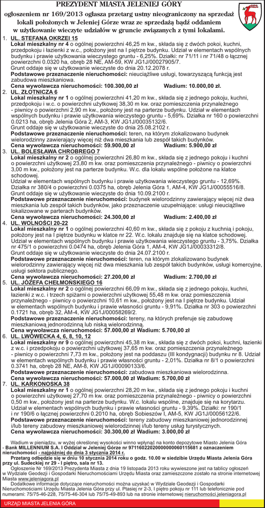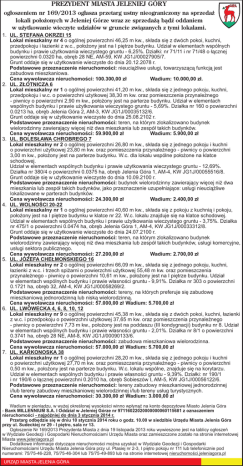 PREZYDENT MIASTA JELENIEJ GÓRY ogłoszeniem nr 169/2013 ogłasza przetarg ustny nieograniczony na sprzedaż lokali położonych w Jeleniej Górze wraz ze sprzedażą bądź oddaniem w użytkowanie wieczyte udziałów w gruncie związanych z tymi lokalami. 1. UL. STEFANA OKRZEI 15 Lokal mieszkalny nr 4 o ogólnej powierzchni 46,25 m kw., składa się z dwóch pokoi, kuchni, przedpokoju i łazienki z w.c., położony jest na I piętrze budynku. Udział w elementach wspólnych budynku i prawie użytkowania wieczystego gruntu - 6,25%. Działki: nr 71/11 i nr 71/48 o łącznej powierzchni 0.0320 ha, obręb 28 NE, AM-59, KW JG1J/00027905/7. Grunt oddaje się w użytkowanie wieczyste do dnia 20.12.2078 r. Podstawowe przeznaczenie nieruchomości: nieuciążliwe usługi, towarzyszącą funkcją jest zabudowa mieszkaniowa. Cena wywoławcza nieruchomości: 100.300,00 zł Wadium: 10.000,00 zł. 2. UL. ZŁOTNICZA 6 Lokal mieszkalny nr 1 o ogólnej powierzchni 41,20 m kw., składa się z jednego pokoju, kuchni, przedpokoju i w.c. o powierzchni użytkowej 38,30 m kw. oraz pomieszczenia przynależnego - piwnicy o powierzchni 2,90 m kw., położony jest na parterze budynku. Udział w elementach wspólnych budynku i prawie użytkowania wieczystego gruntu - 5,69%. Działka nr 160 o powierzchni 0.0213 ha, obręb Jelenia Góra 2, AM-3, KW JG1J/00035132/6. Grunt oddaje się w użytkowanie wieczyste do dnia 25.08.2102 r. Podstawowe przeznaczenie nieruchomości: teren, na którym zlokalizowano budynek wielorodzinny zawierający więcej niż dwa mieszkania lub zespół takich budynków. Cena wywoławcza nieruchomości: 59.900,00 zł Wadium: 5.900,00 zł 3. UL. BOLESŁAWA CHROBREGO 7 Lokal mieszkalny nr 2 o ogólnej powierzchni 26,80 m kw., składa się z jednego pokoju i kuchni o powierzchni użytkowej 23,80 m kw. oraz pomieszczenia przynależnego - piwnicy o powierzchni 3,00 m kw., położony jest na parterze budynku. W.c. dla lokalu wspólne położone na klatce schodowej. Udział w elementach wspólnych budynku i prawie użytkowania wieczystego gruntu - 12,69%. Działka nr 380/4 o powierzchni 0.0375 ha, obręb Jelenia Góra 1, AM-4, KW JG1J/00055516/8. Grunt oddaje się w użytkowanie wieczyste do dnia 10.09.2100 r. Podstawowe przeznaczenie nieruchomości: budynek wielorodzinny zawierający więcej niż dwa mieszkania lub zespół takich budynków, jako przeznaczenie uzupełniające: usługi nieuciążliwe lokalizowane w parterach budynków. Cena wywoławcza nieruchomości: 24.300,00 zł Wadium: 2.400,00 zł 4. UL. WOLNOŚCI 20-22 Lokal mieszkalny nr 1 o ogólnej powierzchni 40,60 m kw., składa się z pokoju z kuchnią i pokoju, położony jest na I piętrze budynku w klatce nr 22. W.c. lokalu znajduje się na klatce schodowej. Udział w elementach wspólnych budynku i prawie użytkowania wieczystego gruntu - 3,75%. Działka nr 475/1 o powierzchni 0.0474 ha, obręb Jelenia Góra 1, AM-4, KW JG1J/00033312/8. Grunt oddaje się w użytkowanie wieczyste do dnia 24.07.2100 r. Podstawowe przeznaczenie nieruchomości: teren, na którym zlokalizowano budynek wielorodzinny zawierający więcej niż dwa mieszkania lub zespół takich budynków, usługi komercyjne, usługi sektora publicznego. Cena wywoławcza nieruchomości: 27.200,00 zł Wadium: 2.700,00 zł 5. UL. JÓZEFA CHEŁMOŃSKIEGO 16 Lokal mieszkalny nr 2 o ogólnej powierzchni 66,09 m kw., składa się z jednego pokoju, kuchni, łazienki z w.c. i trzech spiżarni o powierzchni użytkowej 55,48 m kw. oraz pomieszczenia przynależnego - piwnicy o powierzchni 10,61 m kw., położony jest na I piętrze budynku. Udział w elementach wspólnych budynku i prawie własności gruntu - 9,91%. Działka nr 303 o powierzchni 0.1721 ha, obręb 32, AM-4, KW JG1J/00058269/2. Podstawowe przeznaczenie nieruchomości: tereny, na których preferuje się zabudowę mieszkaniową jednorodzinną lub niską wielorodzinną. Cena wywoławcza nieruchomości: 57.000,00 zł Wadium: 5.700,00 zł 6. UL. LWÓWECKA 4, 6, 8, 10, 12 Lokal mieszkalny nr 9 o ogólnej powierzchni 45,38 m kw., składa się z dwóch pokoi, kuchni, łazienki z w.c. i przedpokoju o powierzchni użytkowej 37,65 m kw. oraz pomieszczenia przynależnego - piwnicy o powierzchni 7,73 m kw., położony jest na poddaszu (III kondygnacji) budynku nr 8. Udział w elementach wspólnych budynku i prawie własności gruntu - 2,01%. Działka nr 8/1 o powierzchni 0.3741 ha, obręb 28 NE, AM-8, KW JG1J/00090133/6. Podstawowe przeznaczenie nieruchomości: zabudowa mieszkaniowa wielorodzinna. Cena wywoławcza nieruchomości: 57.000,00 zł Wadium: 5.700,00 zł 7. UL. KARKONOSKA 38 Lokal mieszkalny nr 1 o ogólnej powierzchni 28,20 m kw., składa się z jednego pokoju i kuchni o powierzchni użytkowej 27,70 m kw. oraz pomieszczenia przynależnego - piwnicy o powierzchni 0,50 m kw., położony jest na parterze budynku. W.c. lokalu wspólne, znajduje się na korytarzu. Udział w elementach wspólnych budynku i prawie własności gruntu - 9,39%. Działki: nr 190/1 i nr 190/6 o łącznej powierzchni 0.2010 ha, obręb Sobieszów I, AM-5, KW JG1J/00056122/6. Podstawowe przeznaczenie nieruchomości: tereny zabudowy mieszkaniowej jednorodzinnej i/lub tereny zabudowy mieszkaniowej wielorodzinnej i/lub tereny usług turystycznych. Cena wywoławcza nieruchomości: 30.300,00 zł Wadium: 3.000,00 zł Wadium w pieniądzu, w wyżej określonej wysokości winno wpłynąć na konto depozytowe Miasto Jelenia Góra - Bank MILLENNIUM S.A. I Oddział w Jeleniej Górze nr 97116022020000000060115681 z oznaczeniem nieruchomości - najpóźniej do dnia 3 stycznia 2014 r. Przetarg odbędzie się w dniu 10 stycznia 2014 roku o godz. 10.00 w siedzibie Urzędu Miasta Jelenia Góra przy ul. Sudeckiej nr 29 - I piętro, sala nr 13. Ogłoszenie Nr 169/2013 Prezydenta Miasta z dnia 19 listopada 2013 roku wywieszone jest na tablicy ogłoszeń w Wydziale Geodezji i Gospodarki Nieruchomościami Urzędu Miasta oraz zamieszczone zostało na stronie internetowej Miasta www.