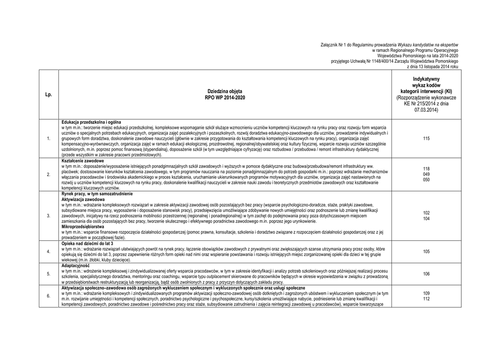 Załącznik Nr 1 do Regulaminu prowadzenia Wykazu kandydatów na ekspertów w ramach Regionalnego Programu Operacyjnego Województwa Pomorskiego na lata 2014-2020 przyjętego Uchwałą Nr 1148/400/14 Zarządu Województwa Pomorskiego z dnia 13 listopada 2014 roku Lp. 1. 2. 3. 4. 5. 6. Dziedzina objęta RPO WP 2014-2020 Edukacja przedszkolna i ogólna w tym m.in.: tworzenie miejsc edukacji przedszkolnej, kompleksowe wspomaganie szkół służące wzmocnieniu uczniów kompetencji kluczowych na rynku pracy oraz rozwoju form wsparcia uczniów o specjalnych potrzebach edukacyjnych, organizacja zajęć pozalekcyjnych i pozaszkolnych, rozwój doradztwa edukacyjno-zawodowego dla uczniów, prowadzenie indywidualnych i grupowych form doradztwa, doskonalenie zawodowe nauczycieli (głównie w zakresie przygotowania do kształtowania kompetencji kluczowych na rynku pracy), organizacja zajęć kompensacyjno-wyrównawczych, organizacja zajęć w ramach edukacji ekologicznej, prozdrowotnej, regionalnej/obywatelskiej oraz kultury fizycznej, wsparcie rozwoju uczniów szczególnie uzdolnionych, m.in. poprzez pomoc finansową (stypendialną), doposażenie szkół (w tym uwzględniające cyfryzację) oraz rozbudowa / przebudowa / remont infrastruktury dydaktycznej (przede wszystkim w zakresie pracowni przedmiotowych). Kształcenie zawodowe w tym m.in.: doposażenie/wyposażenie istniejących ponadgimnazjalnych szkół zawodowych i wyższych w pomoce dydaktyczne oraz budowa/przebudowa/remont infrastruktury ww. placówek; dostosowanie kierunków kształcenia zawodowego, w tym programów nauczania na poziomie ponadgimnazjalnym do potrzeb gospodarki m.in.: poprzez wdrażanie mechanizmów włączania pracodawców i środowiska akademickiego w proces kształcenia, uruchamianie ukierunkowanych programów motywacyjnych dla uczniów, organizacja zajęć nastawionych na rozwój u uczniów kompetencji kluczowych na rynku pracy, doskonalenie kwalifikacji nauczycieli w zakresie nauki zawodu i teoretycznych przedmiotów zawodowych oraz kształtowanie kompetencji kluczowych uczniów. Rynek pracy, w tym samozatrudnienie Aktywizacja zawodowa w tym m.in.: wdrażanie kompleksowych rozwiązań w zakresie aktywizacji zawodowej osób pozostających bez pracy (wsparcie psychologiczno-doradcze, staże, praktyki zawodowe, subsydiowane miejsca pracy, wyposażenie i doposażenie stanowisk pracy), przedsięwzięcia umożliwiające zdobywanie nowych umiejętności oraz podnoszenie lub zmianę kwalifikacji zawodowych, inicjatywy na rzecz podnoszenia mobilności przestrzennej (regionalnej i ponadregionalnej) w tym zachęt do podejmowania pracy poza dotychczasowym miejscem zamieszkania dla osób pozostających bez pracy, tworzenie skutecznego i efektywnego poradnictwa zawodowego m.in. poprzez jego urynkowienie. Mikroprzedsiębiorstwa w tym m.in.: wsparcie finansowe rozpoczęcia działalności gospodarczej (pomoc prawna, konsultacje, szkolenia i doradztwo związane z rozpoczęciem działalności gospodarczej oraz z jej prowadzeniem w początkowej fazie). Opieka nad dziećmi do lat 3 w tym m.in.: wdrażanie rozwiązań ułatwiających powrót na rynek pracy, łączenie obowiązków zawodowych z prywatnymi oraz zwiększających szanse utrzymania pracy przez osoby, które opiekują się dziećmi do lat 3, poprzez zapewnienie różnych form opieki nad nimi oraz wspieranie powstawania i rozwoju istniejących miejsc zorganizowanej opieki dla dzieci w tej grupie wiekowej (m.in. żłobki, kluby dziecięce). Adaptacyjność w tym m.in.: wdrożenie kompleksowej i zindywidualizowanej oferty wsparcia pracodawców, w tym w zakresie identyfikacji i analizy potrzeb szkoleniowych oraz późniejszej realizacji procesu szkolenia, specjalistycznego doradztwa, mentoringu oraz coachingu, wsparcie typu outplacement skierowane do pracowników będących w okresie wypowiedzenia w związku z prowadzoną w przedsiębiorstwach restrukturyzacją lub reorganizacją, bądź osób zwolnionych z pracy z przyczyn dotyczących zakładu pracy. Aktywizacja społeczno–zawodowa osób zagrożonych wykluczeniem społecznym i wykluczonych społecznie oraz usługi społeczne w tym m.in.: wdrażanie kompleksowych i zindywidualizowanych programów aktywizacji społeczno-zawodowej osób dotkniętych i zagrożonych ubóstwem i wykluczeniem społecznym (w tym m.in. rozwijanie umiejętności i kompetencji społecznych, poradnictwo psychologiczne i psychospołeczne, kursy/szkolenia umożliwiające nabycie, podniesienie lub zmianę kwalifikacji i kompetencji zawodowych, poradnictwo zawodowe i pośrednictwo pracy oraz staże, subsydiowanie zatrudnienia i zajęcia reintegracji zawodowej u pracodawców), wsparcie towarzyszące Indykatywny wykaz kodów kategorii interwencji (KI) (Rozporządzenie wykonawcze KE Nr 215/2014 z dnia 07.03.2014) 115 118 049 050 102 104 105 106 109 112 7. 8. 9. 10. 11. 12. 13. 14. 15. 16. 17. którym objęte zostaną rodziny ww. osób przy wykorzystaniu środowiskowych form aktywizacji społecznej, przedsięwzięcia koordynacyjno-doradcze podnoszące kompetencje zawodowe kadr instytucji pomocy i integracji społecznej oraz instytucji rynku pracy; tworzenie nowych i rozwijanie istniejących placówek wparcia dziennego przeznaczonych dla dzieci i młodzieży, osób z niepełnosprawnościami oraz seniorów, wspieranie rodziny, opieka nad dziećmi i młodzieżą w systemie opieki zastępczej, poradnictwo prawne i obywatelskie, wsparcie i aktywizacja społeczna osób niesamodzielnych poprzez tworzenie międzysektorowych zespołów opieki nad osobami z chorobami przewlekłymi oraz kształcenie kadr opieki nad osobami niesamodzielnymi. Ekonomia społeczna w tym m.in.: realizacjia usług na rzecz rozwoju sektora ekonomii społecznej, głównie przy wykorzystaniu potencjału ośrodków wspierających ekonomię społeczną (kompleksowe wsparcie istniejących podmiotów ekonomii społecznej służące ich profesjonalizacji, a także stymulowanie powstawania nowych podmiotów,