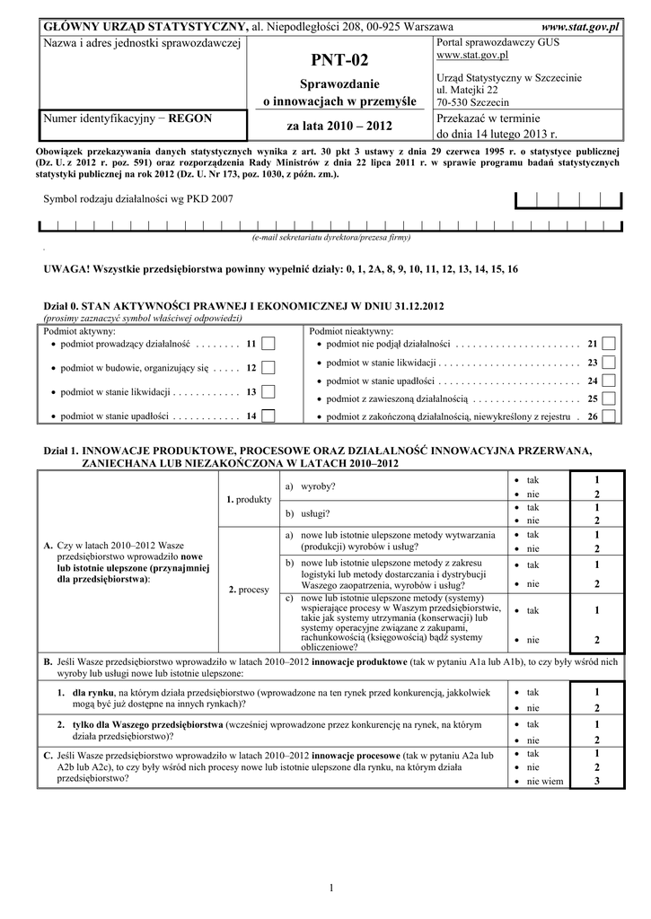 GŁÓWNY URZĄD STATYSTYCZNY, al. Niepodległości 208, 00-925 Warszawa www.stat.gov.pl Portal sprawozdawczy GUS Nazwa i adres jednostki sprawozdawczej PNT-02 Sprawozdanie o innowacjach w przemyśle Numer identyfikacyjny − REGON za lata 2010 – 2012 www.stat.gov.pl Urząd Statystyczny w Szczecinie ul. Matejki 22 70-530 Szczecin Przekazać w terminie do dnia 14 lutego 2013 r. Obowiązek przekazywania danych statystycznych wynika z art. 30 pkt 3 ustawy z dnia 29 czerwca 1995 r. o statystyce publicznej (Dz. U. z 2012 r. poz. 591) oraz rozporządzenia Rady Ministrów z dnia 22 lipca 2011 r. w sprawie programu badań statystycznych statystyki publicznej na rok 2012 (Dz. U. Nr 173, poz. 1030, z późn. zm.). Symbol rodzaju działalności wg PKD 2007 (e-mail sekretariatu dyrektora/prezesa firmy) . UWAGA! Wszystkie przedsiębiorstwa powinny wypełnić działy: 0, 1, 2A, 8, 9, 10, 11, 12, 13, 14, 15, 16 Dział 0. STAN AKTYWNOŚCI PRAWNEJ I EKONOMICZNEJ W DNIU 31.12.2012 (prosimy zaznaczyć symbol właściwej odpowiedzi) Podmiot aktywny: • podmiot prowadzący działalność . . . . . . . . 11 • podmiot w budowie, organizujący się . . . . . 12 • podmiot w stanie likwidacji . . . . . . . . . . . . 13 • podmiot w stanie upadłości . . . . . . . . . . . . 14 Podmiot nieaktywny: • podmiot nie podjął działalności . . . . . . . . . . . . . . . . . . . . . . 21 • podmiot w stanie likwidacji . . . . . . . . . . . . . . . . . . . . . . . . . 23 • podmiot w stanie upadłości . . . . . . . . . . . . . . . . . . . . . . . . . 24 • podmiot z zawieszoną działalnością . . . . . . . . . . . . . . . . . . . 25 • podmiot z zakończoną działalnością, niewykreślony z rejestru . 26 Dział 1. INNOWACJE PRODUKTOWE, PROCESOWE ORAZ DZIAŁALNOŚĆ INNOWACYJNA PRZERWANA, ZANIECHANA LUB NIEZAKOŃCZONA W LATACH 2010–2012 a) wyroby? 1. produkty b) usługi? A. Czy w latach 2010–2012 Wasze przedsiębiorstwo wprowadziło nowe lub istotnie ulepszone (przynajmniej dla przedsiębiorstwa): a) nowe lub istotnie ulepszone metody wytwarzania (produkcji) wyrobów i usług? • • • • • • tak nie tak nie tak nie 1 2 1 2 1 2 1 b) nowe lub istotnie ulepszone metody z zakresu • tak logistyki lub metody dostarczania i dystrybucji • nie 2 Waszego zaopatrzenia, wyrobów i usług? 2. procesy c) nowe lub istotnie ulepszone metody (systemy) wspierające procesy w Waszym przedsiębiorstwie, • tak 1 takie jak systemy utrzymania (konserwacji) lub systemy operacyjne związane z zakupami, rachunkowością (księgowością) bądź systemy • nie 2 obliczeniowe? B. Jeśli Wasze przedsiębiorstwo wprowadziło w latach 2010–2012 innowacje produktowe (tak w pytaniu A1a lub A1b), to czy były wśród nich wyroby lub usługi nowe lub istotnie ulepszone: 1. dla rynku, na którym działa przedsiębiorstwo (wprowadzone na ten rynek przed konkurencją, jakkolwiek mogą być już dostępne na innych rynkach)? 2. tylko dla Waszego przedsiębiorstwa (wcześniej wprowadzone przez konkurencję na rynek, na którym działa przedsiębiorstwo)? C. Jeśli Wasze przedsiębiorstwo wprowadziło w latach 2010–2012 innowacje procesowe (tak w pytaniu A2a lub A2b lub A2c), to czy były wśród nich procesy nowe lub istotnie ulepszone dla rynku, na którym działa przedsiębiorstwo? 1 • tak • nie • tak • • • • nie tak nie nie wiem 1 2 1 2 1 2 3 Dział 1. INNOWACJE PRODUKTOWE, PROCESOWE ORAZ DZIAŁALNOŚĆ INNOWACYJNA PRZERWANA, ZANIECHANA LUB NIEZAKOŃCZONA W LATACH 2010–2012 (dokończenie) Produkty wprowadzone na rynek (innowacje-produkty) Wdrożone procesy (innowacje-procesy) 1 2 1 1 2 2 3 3 4 4 5. krajowe instytucje naukowe (PAN, instytuty badawcze, szkoły wyższe) 5 5 6. instytucje zagraniczne (przedsiębiorstwa 6 6 7 7 D. Jeśli Wasze przedsiębiorstwo wprowadziło w latach 2010–2012 nowe lub istotnie ulepszone produkty lub procesy, to kto je opracował? (w każdej z rubryk 1 i 2 prosimy wybrać wszystkie właściwe odpowiedzi) 0 1. Wasze przedsiębiorstwo 2. Wasze przedsiębiorstwo we współpracy z innymi przedsiębiorstwami lub instytucjami naukowymi krajowymi 3. Wasze przedsiębiorstwo we współpracy z innymi przedsiębiorstwami a) lub instytucjami naukowymi zagranicznymi 4. Wasze przedsiębiorstwo w drodze adaptacji lub modyfikacji dóbr i usług oryginalnie opracowanych przez inne przedsiębiorstwa a) lub instytucje a) 7. inne przedsiębiorstwa a) a) lub instytucje naukowe) krajowe E. Czy w latach 2010–2012 przedsiębiorstwo realizowało jakiś projekt innowacyjny (prowadziło działalność innowacyjną) mający na celu opracowanie lub wdrożenie innowacji produktowych lub innowacji procesowych, który był: • tak 1. przerwany lub zaniechany przed ukończeniem? • nie 1 2 1 2 • • • • • • • • • 1 2 3 1 2 3 1 2 3 • nie • tak 2. niezakończony na koniec 2012 r.? F. Czy którakolwiek z Waszych innowacji produktowych wprowadzonych w latach 2010-2012 była: 1. pierwsza w kraju 2. pierwsza w Europiea) 3. pierwsza na świecie a) tak nie nie wiem tak nie nie wiem tak nie nie wiem Włącznie z przedsiębiorstwami stanowiącymi część Waszej grupy przedsiębiorstw (centrala, inne oddziały). Dział 2. PRZYCHODY NETTO ZE SPRZEDAŻY W TYS. ZŁ (bez znaku po przecinku) Dział 2A. PRZYCHODY NETTO OGÓŁEM ZE SPRZEDAŻY PRODUKTÓW (WYROBÓW I USŁUG), TOWARÓW I MATERIAŁÓW W 2010 I 2012 R. W TYS. ZŁ (bez znaku po przecinku) Przychody netto ze sprzedaży produktów (wyrobów i usług), towarów i materiałów ogółem w tys. zł uzyskane w: 2010 r. 2012 r. 1 2 w tym przychody netto uzyskane w 2012 r. ze sprzedaży wyrobów ogółem w tys. zł 3 UWAGA! Przedsiębiorstwa, które wprowadziły innowacje produktowe („tak” w pytaniu A1a lub A1b) wypełniają także działy 2B, 3A, 3B, 4, 5, 6A, 6B, 7. Przedsiębiorstwa, które wprowadziły innowacje procesowe lub prowadziły działalność innowacyjna przerwaną, zaniechaną lub niezakończoną („tak” w pytaniu A2a lub A2