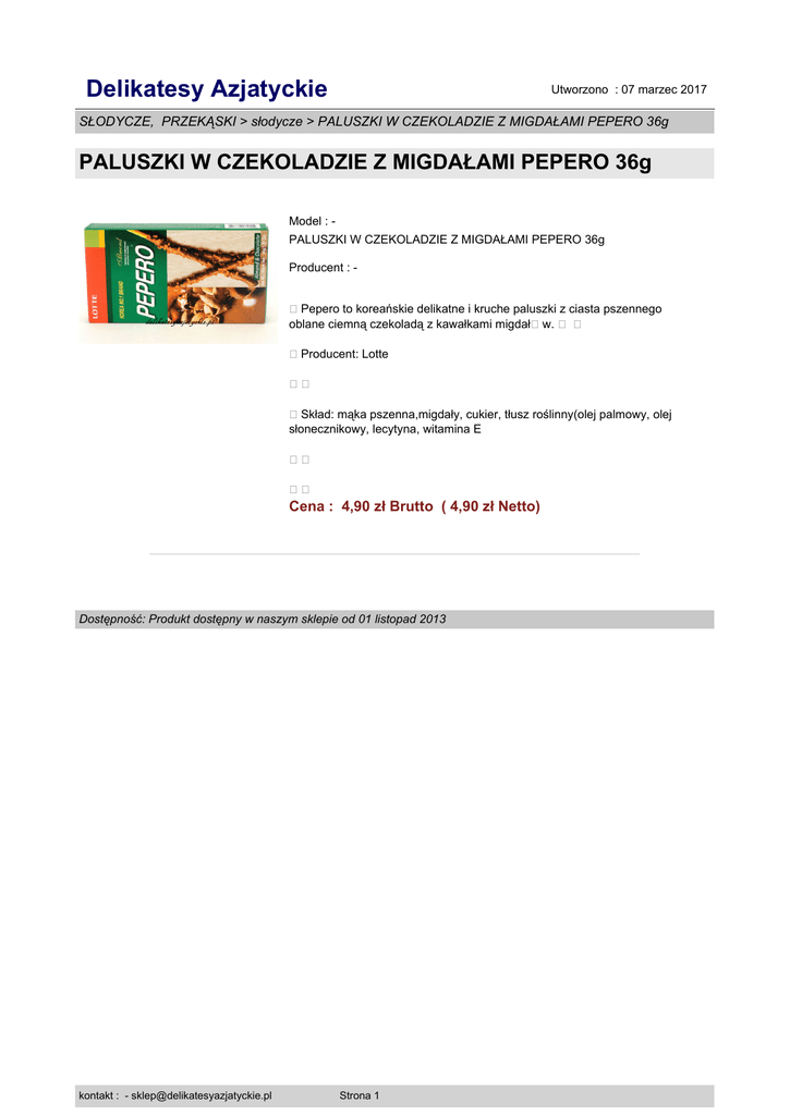 Delikatesy Azjatyckie Utworzono : 07 marzec 2017 SŁODYCZE, PRZEKĄSKI > słodycze > PALUSZKI W CZEKOLADZIE Z MIGDAŁAMI PEPERO 36g PALUSZKI W CZEKOLADZIE Z MIGDAŁAMI PEPERO 36g Model : PALUSZKI W CZEKOLADZIE Z MIGDAŁAMI PEPERO 36g Producent : Pepero to koreańskie delikatne i kruche paluszki z ciasta pszennego oblane ciemną czekoladą z kawałkami migdał�w. � � Producent: Lotte � Skład: mąka pszenna,migdały, cukier, tłusz roślinny(olej palmowy, olej słonecznikowy, lecytyna, witamina E � � Cena : 4,90 zł Brutto ( 4,90 zł Netto) Dostępność: Produkt dostępny w naszym sklepie od 01 listopad 2013 kontakt : - [email protected] Strona 1